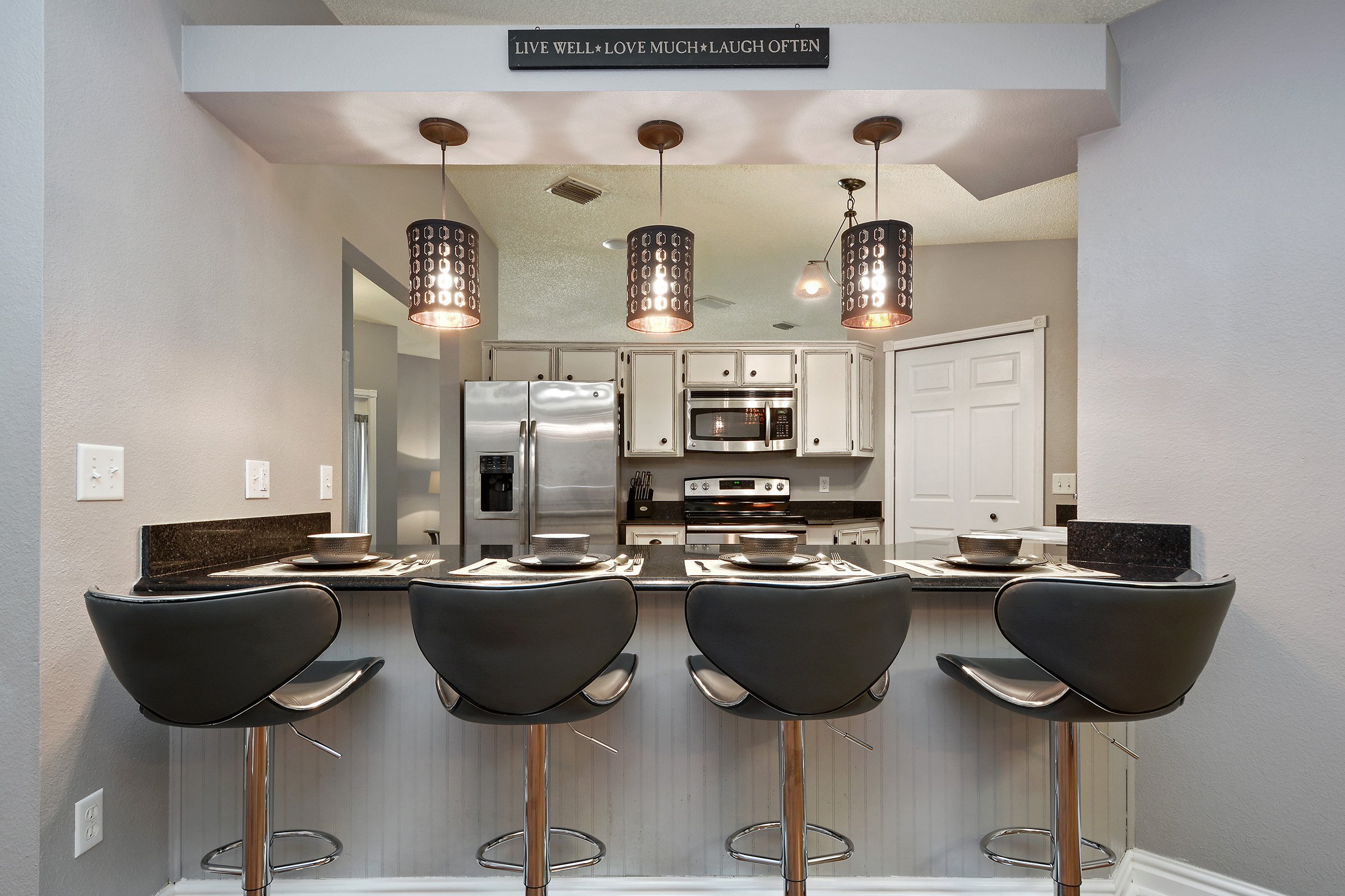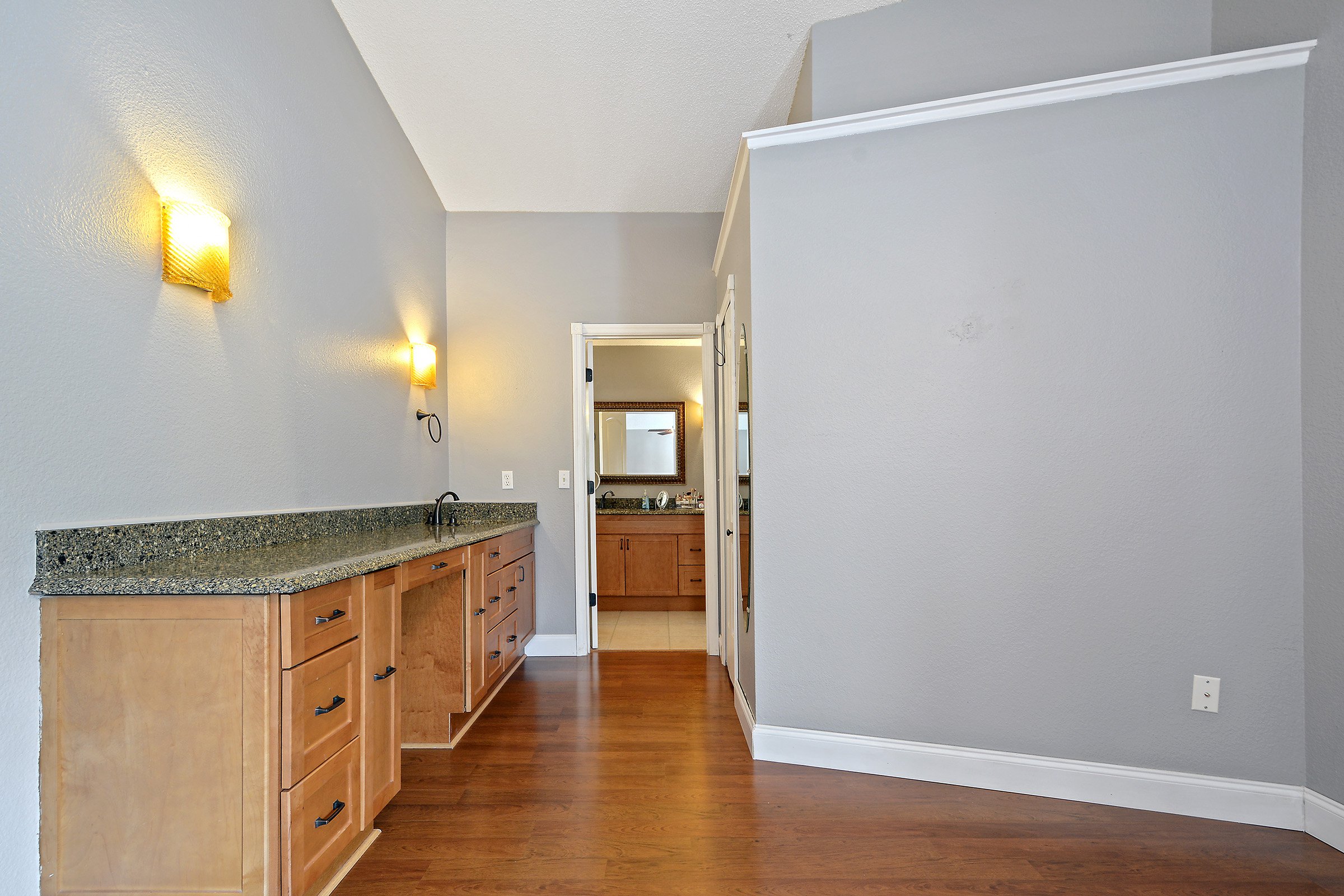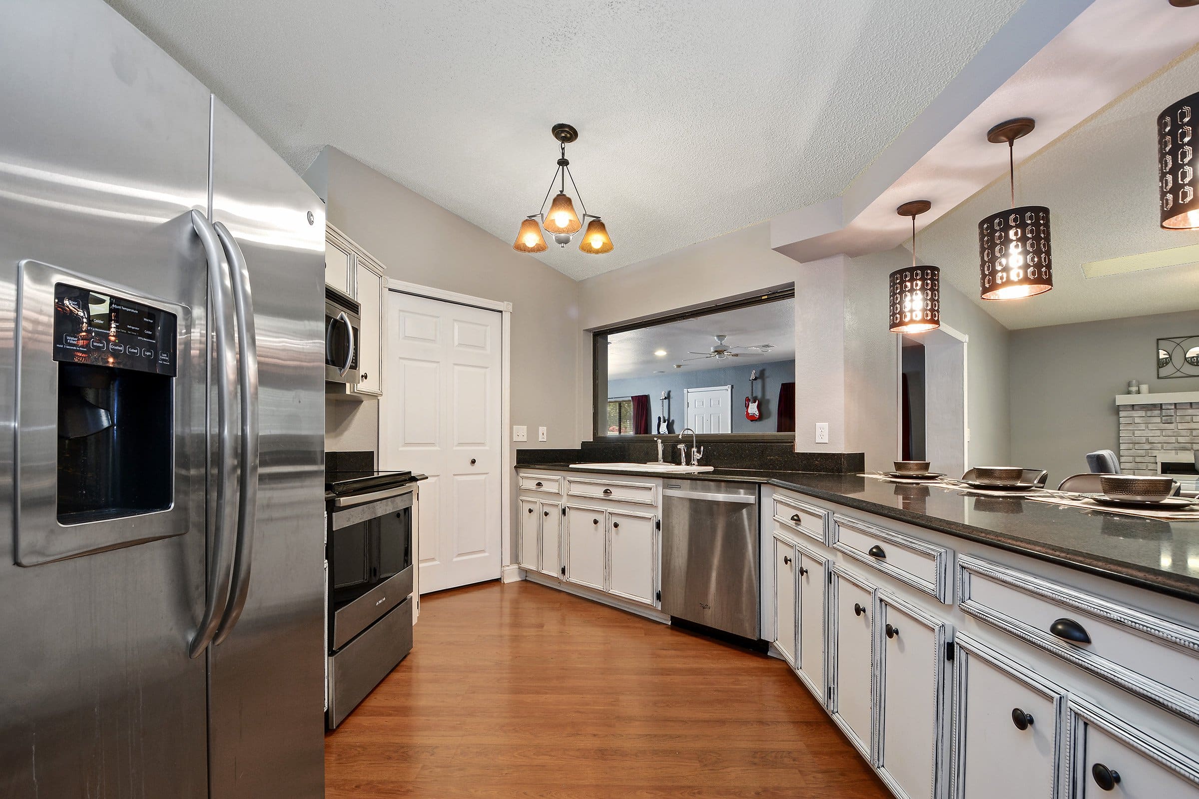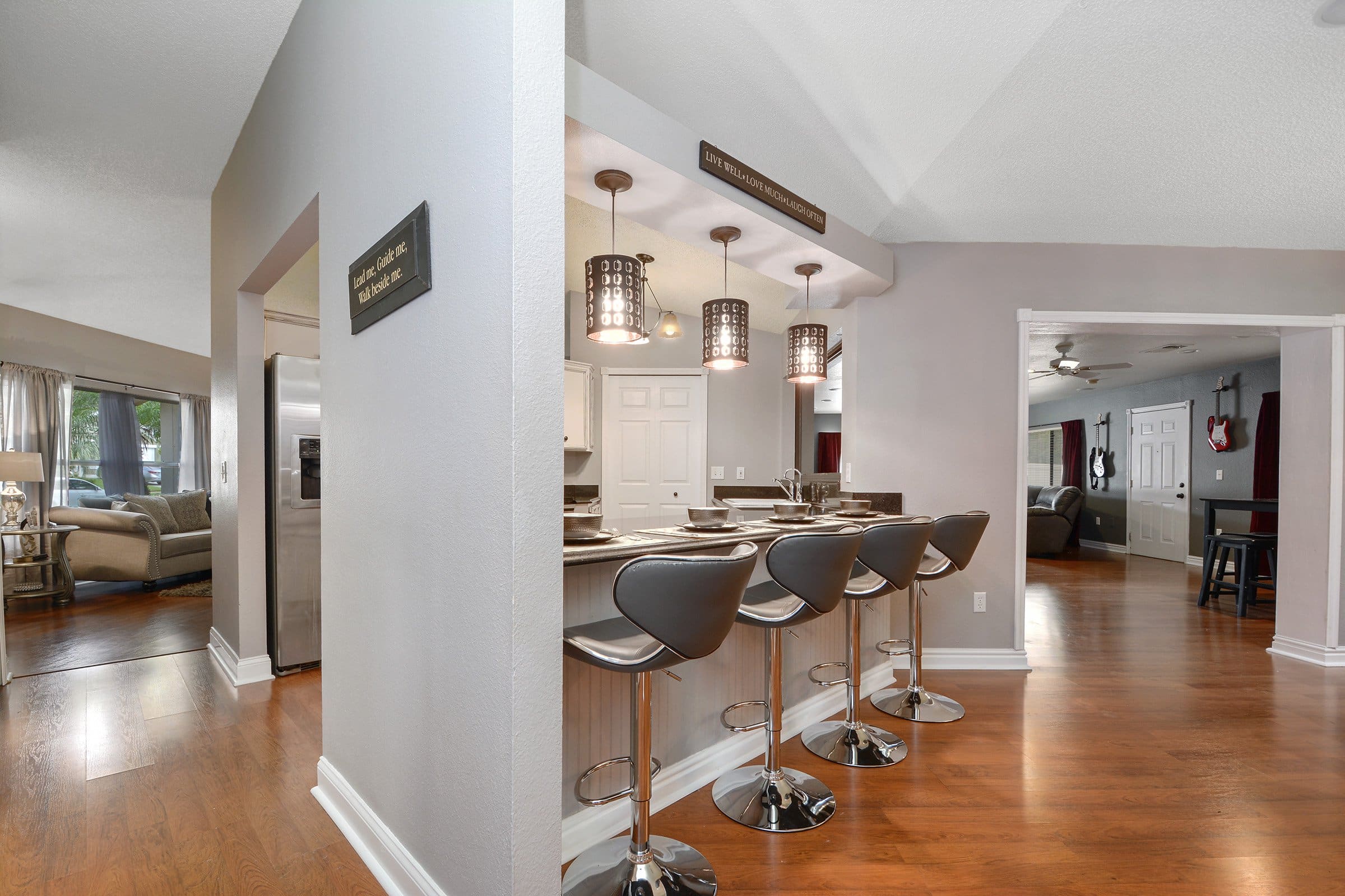 To the left, the split floor plan places the spacious primary suite in its own private wing. Meanwhile, down the hallway, you’ll find three secondary bedrooms, a full bathroom, and a flexible den or office space. Just beyond, the upgraded kitchen features granite countertops, stainless steel appliances, modern light fixtures, and a breakfast bar overlooking the family room. In addition, tall ceilings and plant shelves enhance the architectural character of the space.