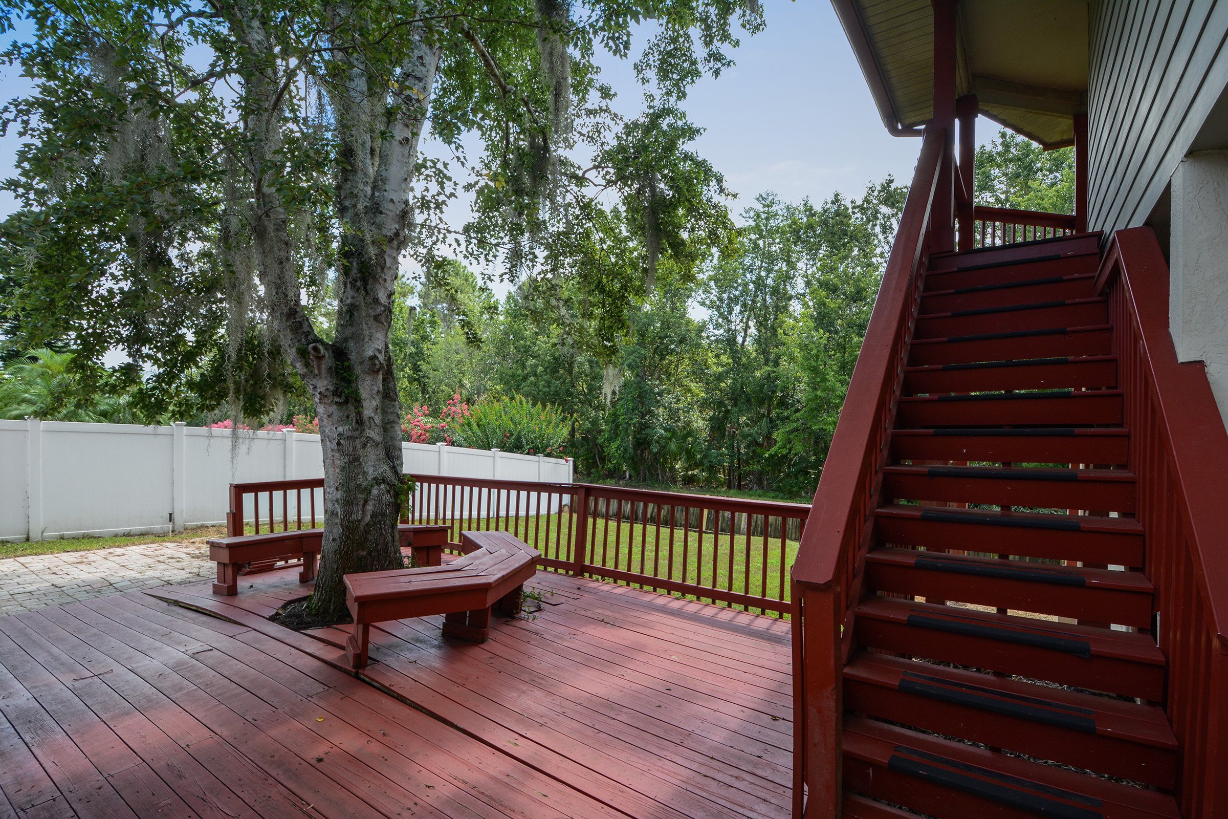 Step outside to a spacious deck designed for relaxing or entertaining. A large mature tree provides natural shade, creating a comfortable outdoor retreat. Beyond the deck, the backyard offers generous green space and backs to conservation for added privacy. As a result, you’ll enjoy peaceful views and no rear neighbors.