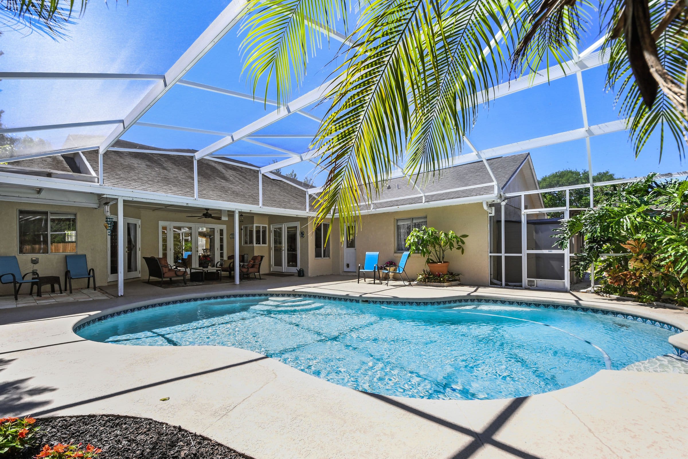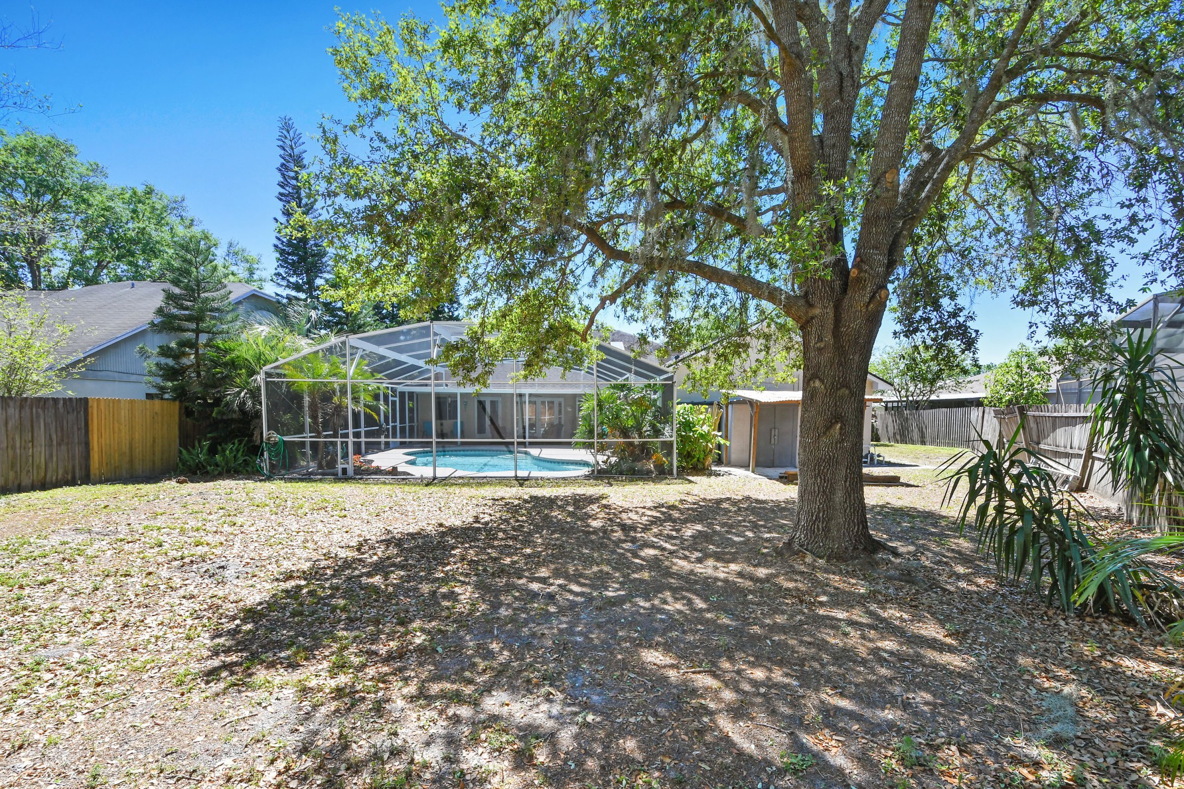 Equally impressive, the outdoor living space at 1011 Jackson Creek Ct is perfect for enjoying Florida’s sunshine. Step through the French doors onto a spacious covered patio that opens to a large screened pool and expansive pool deck. Beyond the pool, a fully fenced backyard offers privacy and ample room for a playset, pets, or outdoor activities. Additionally, a shed provides extra storage for tools or recreational equipment. Consequently, this backyard is ideal for entertaining, relaxing, or creating lasting memories.