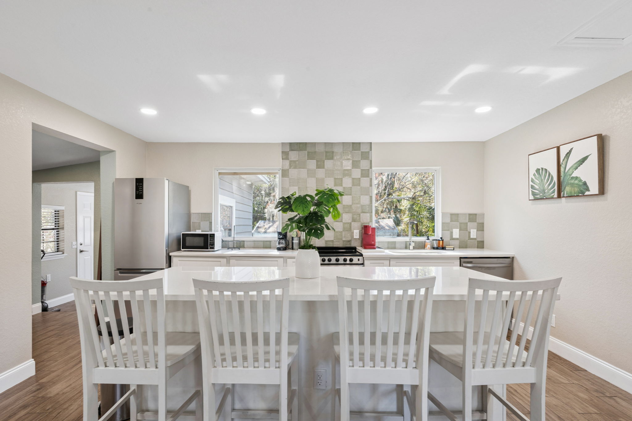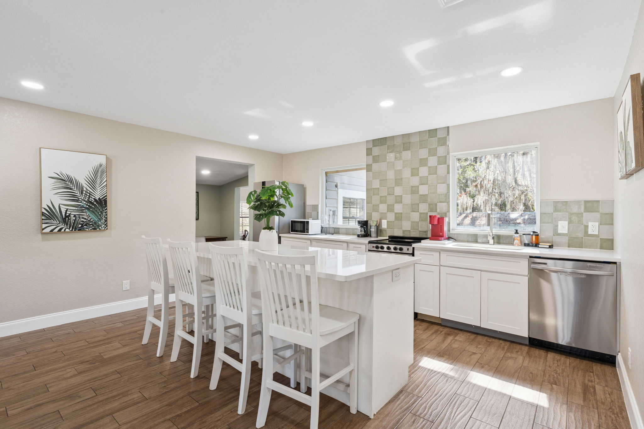 Inside of 102 Vine St, a spacious open floor plan centers around a light-filled great room enhanced by large windows, neutral paint, and luxury vinyl flooring throughout. Furthermore, the expansive living area flows seamlessly into the bright white kitchen, creating an ideal layout for both entertaining and everyday living. The kitchen showcases shaker cabinetry, stainless steel appliances, quartz countertops, and a tile accent backsplash behind the range. Additionally, an island and breakfast bar combo offers ample seating and workspace. Just off the kitchen, a versatile dinette or desk nook provides flexibility for additional dining or a convenient home office.