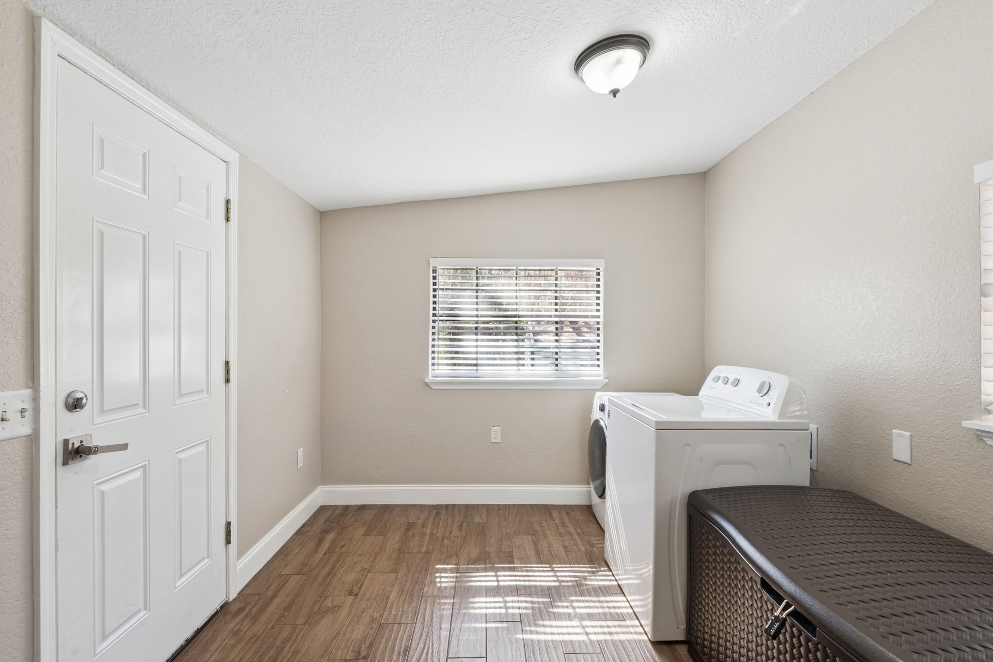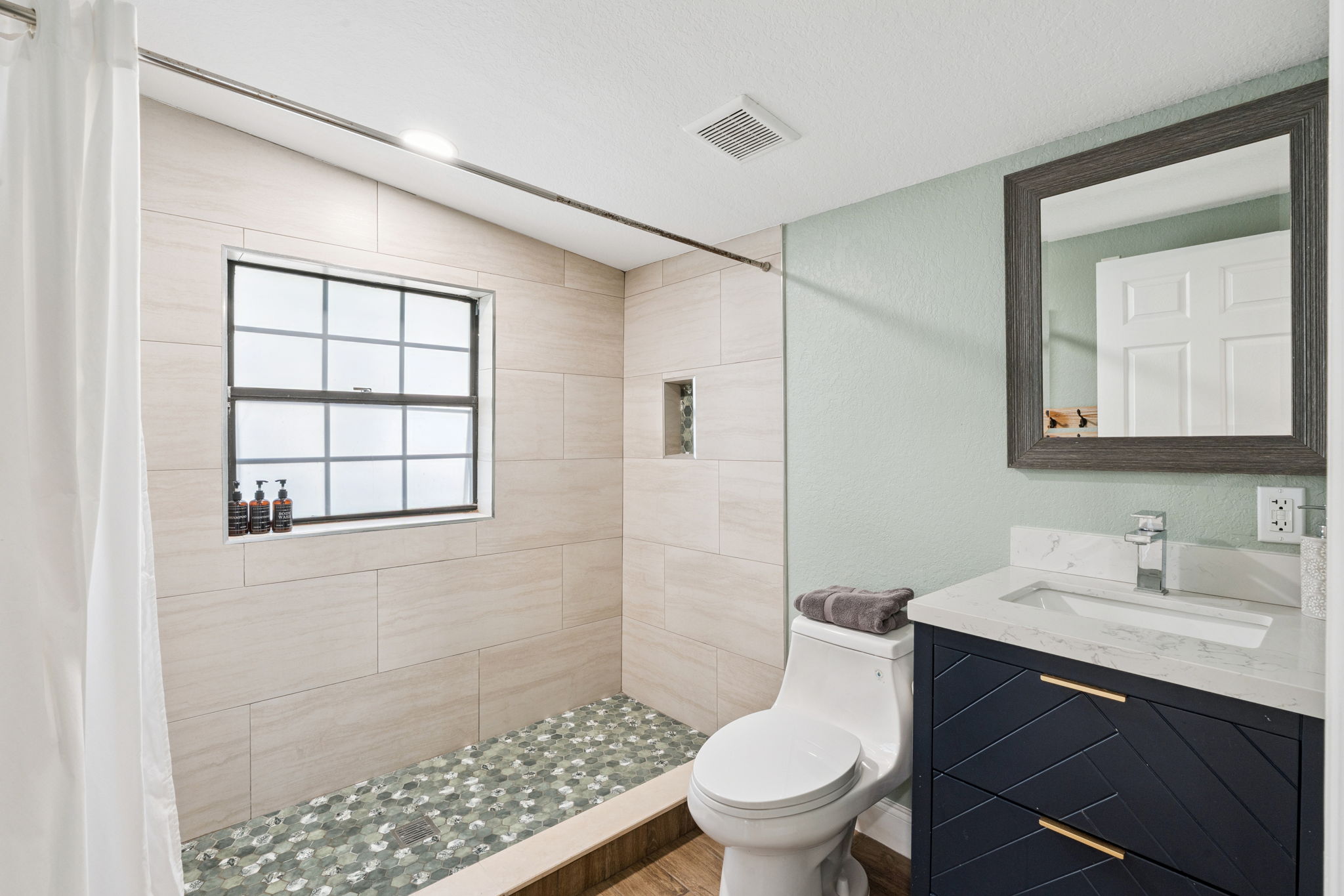 Both bedrooms are generously sized and feature large windows, ceiling fans, and ample closet space. Meanwhile, the updated bathroom impresses with a modern single-sink vanity and a large custom-tiled shower for a sleek, contemporary feel. A private laundry room with direct carport access adds practicality and convenience to your daily routine. Altogether, every detail has been thoughtfully designed for comfortable and stylish living.