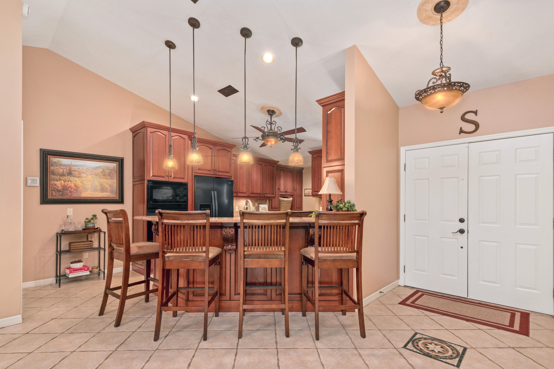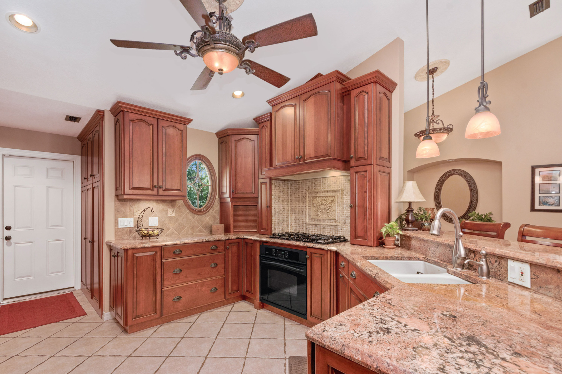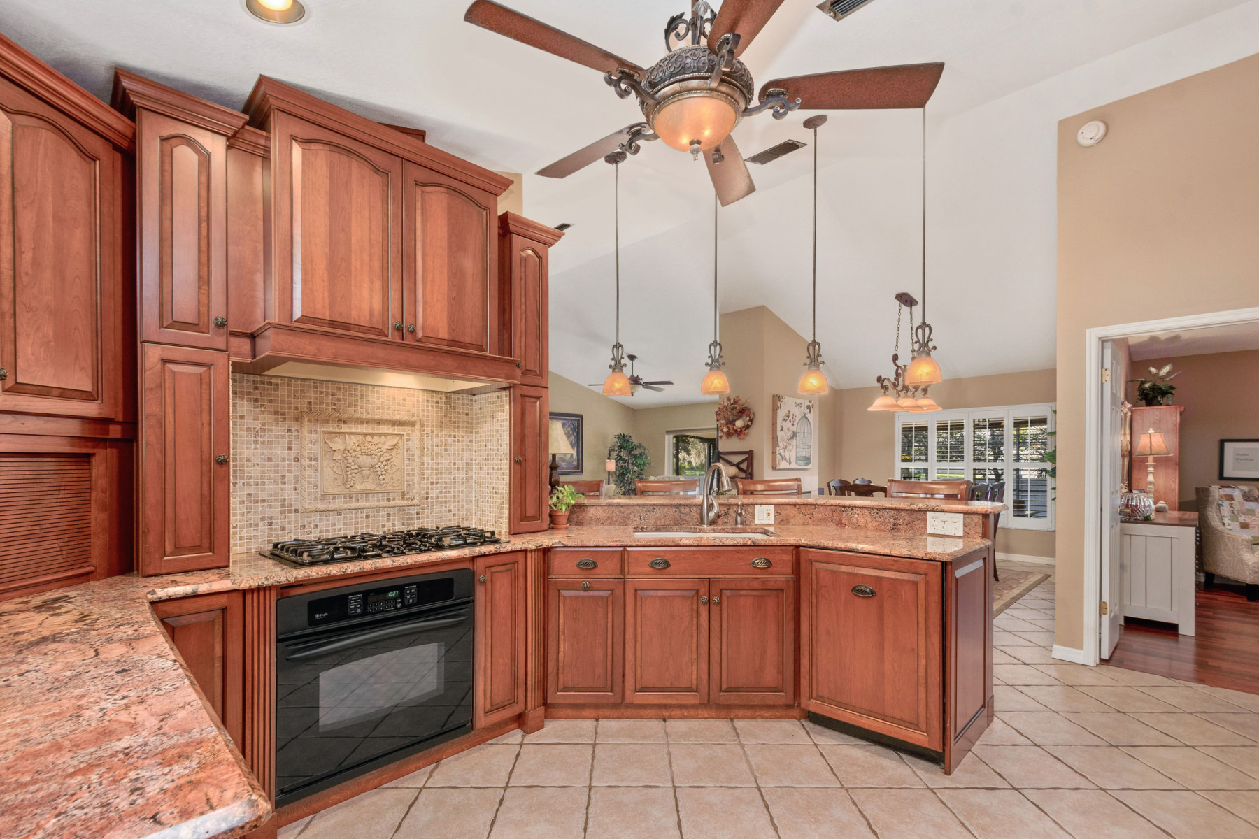 Inside, this home welcomes you with tall vaulted ceilings and neutral finishes that create a bright, airy atmosphere. To the right, the fully renovated kitchen features 42-inch cherry cabinetry, granite countertops, and a stylish tile backsplash. In addition, the built-in appliances and gas range make meal preparation a joy. A breakfast bar seamlessly connects the kitchen to the open floor plan, allowing conversations to flow easily into the dining and family rooms. As a result, the interiors at 1043 Willa Lake Cir are both modern and inviting.