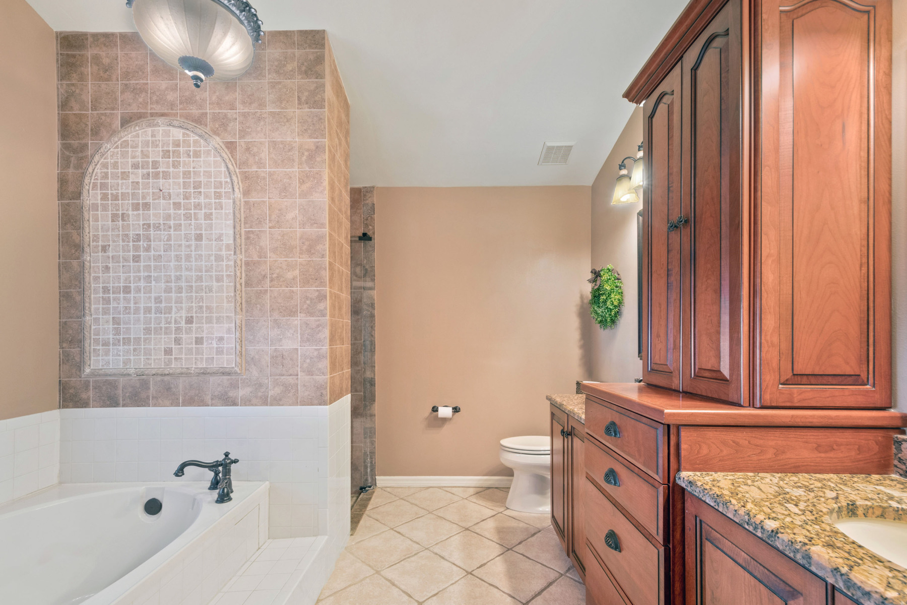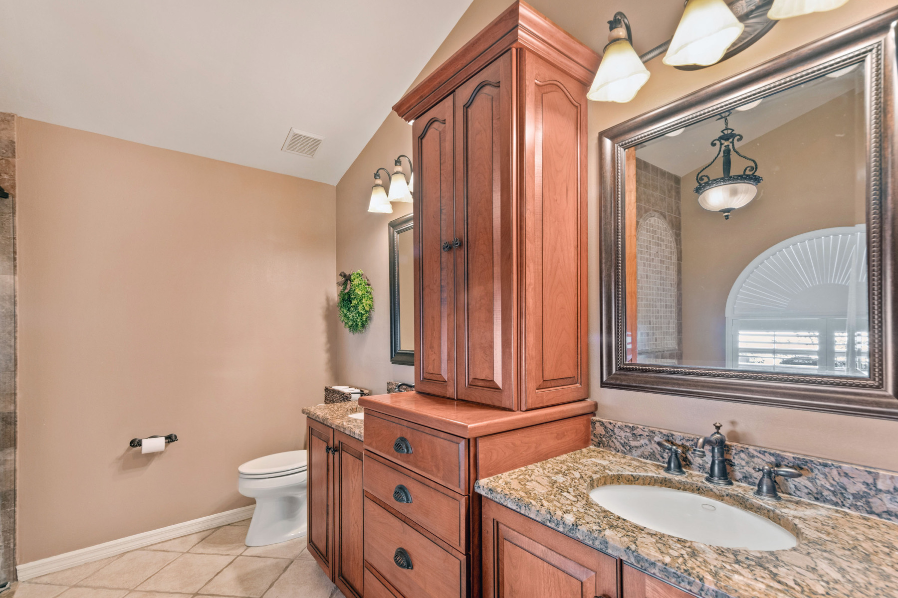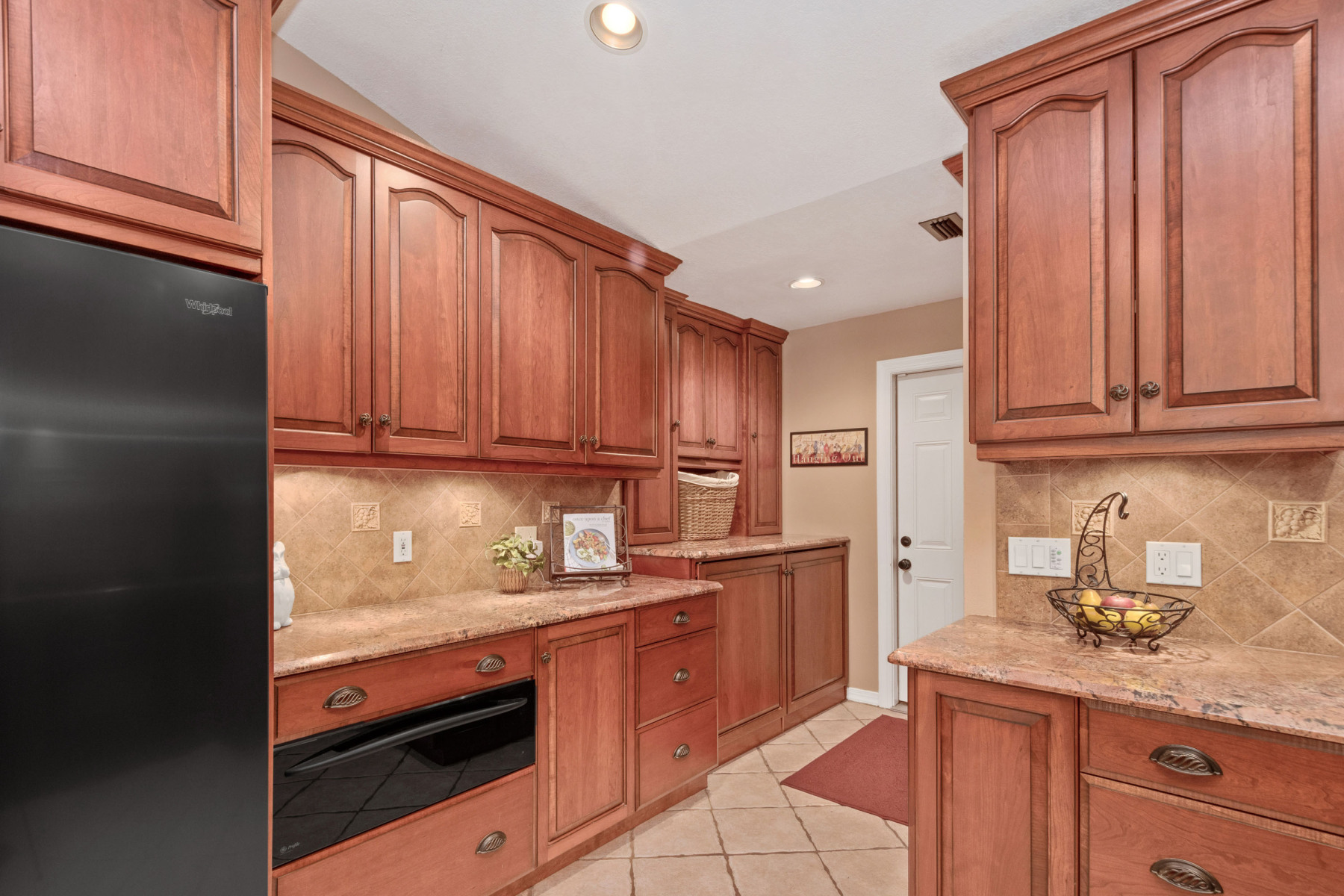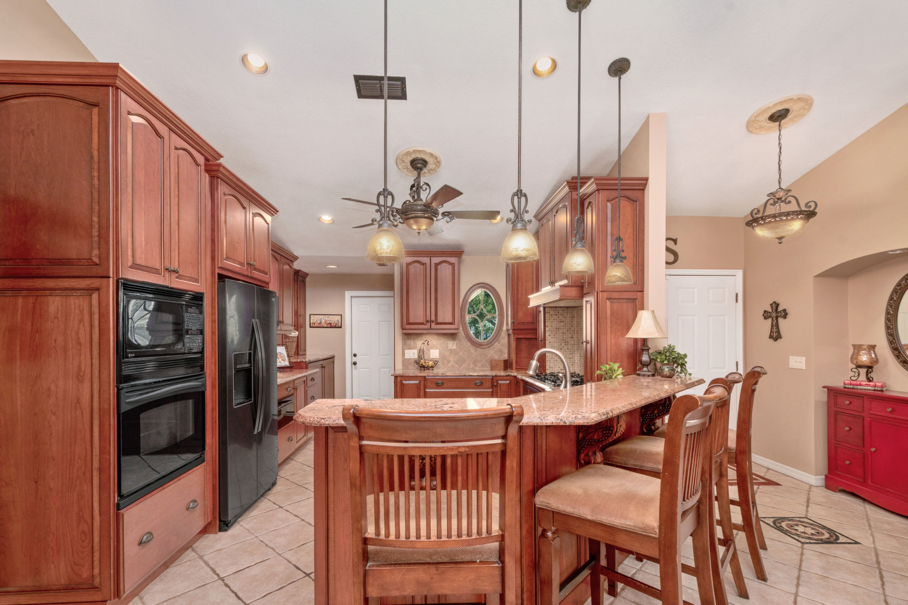 Inside, this home welcomes you with tall vaulted ceilings and neutral finishes that create a bright, airy atmosphere. To the right, the fully renovated kitchen features 42-inch cherry cabinetry, granite countertops, and a stylish tile backsplash. In addition, the built-in appliances and gas range make meal preparation a joy. A breakfast bar seamlessly connects the kitchen to the open floor plan, allowing conversations to flow easily into the dining and family rooms. As a result, the interiors at 1043 Willa Lake Cir are both modern and inviting.