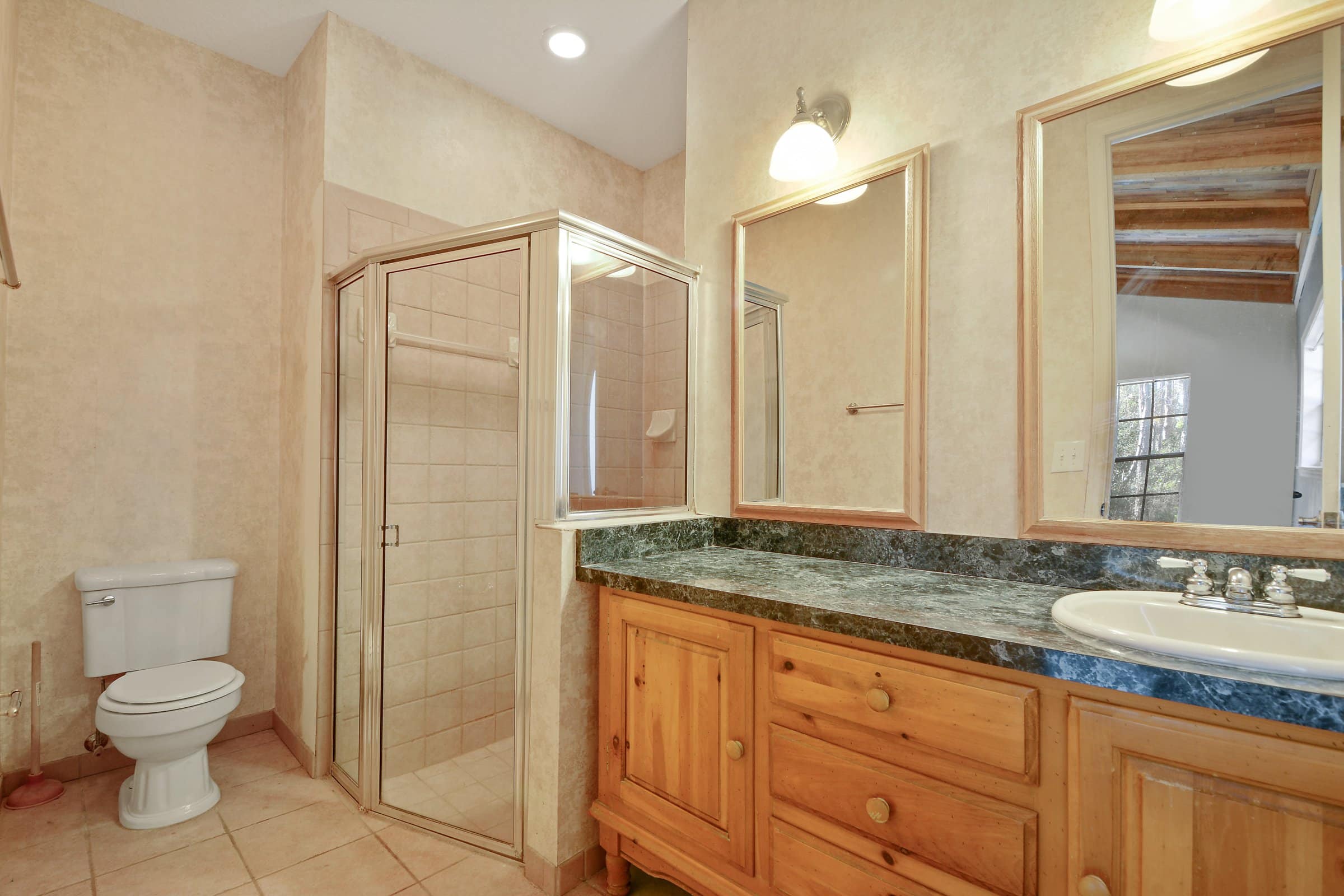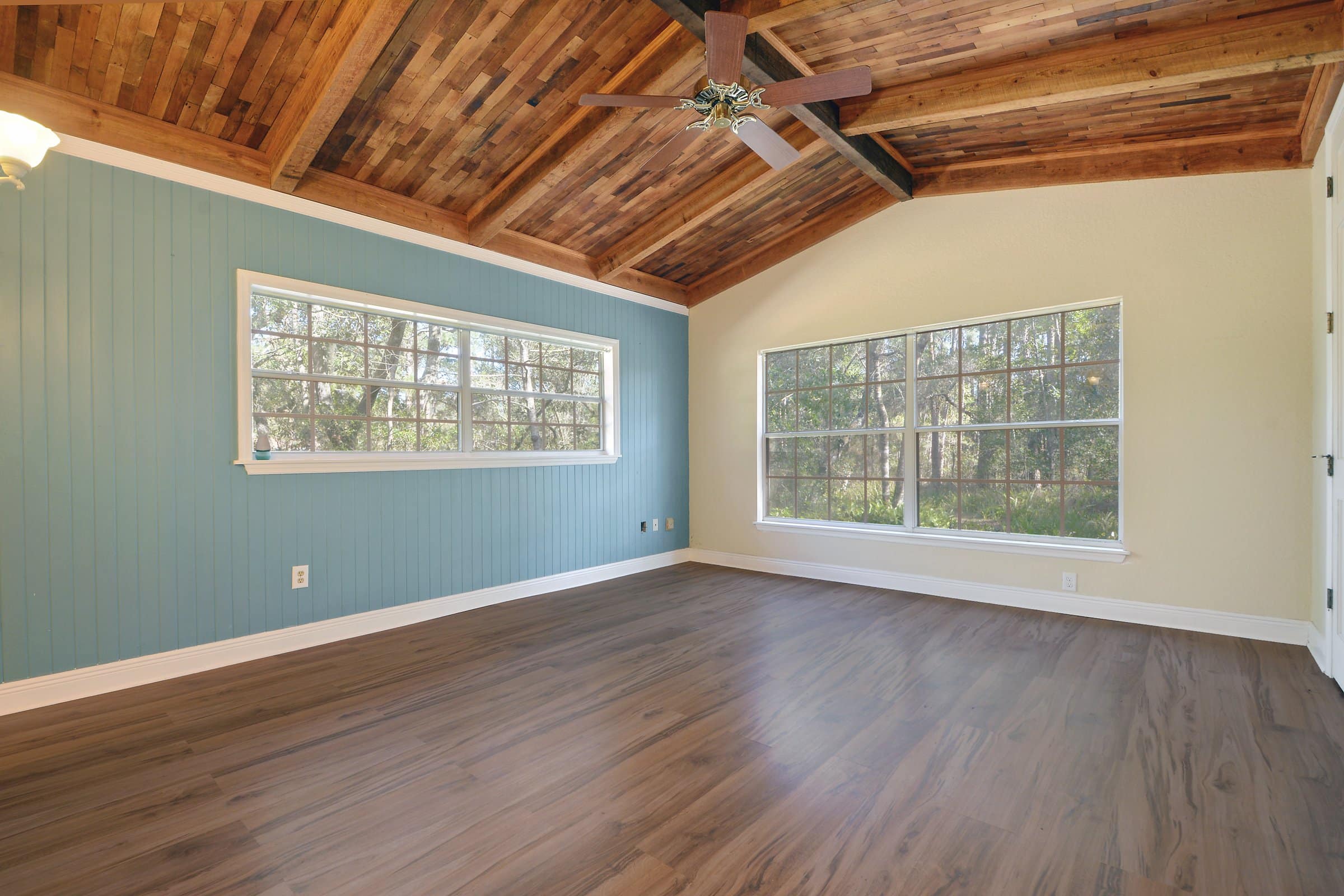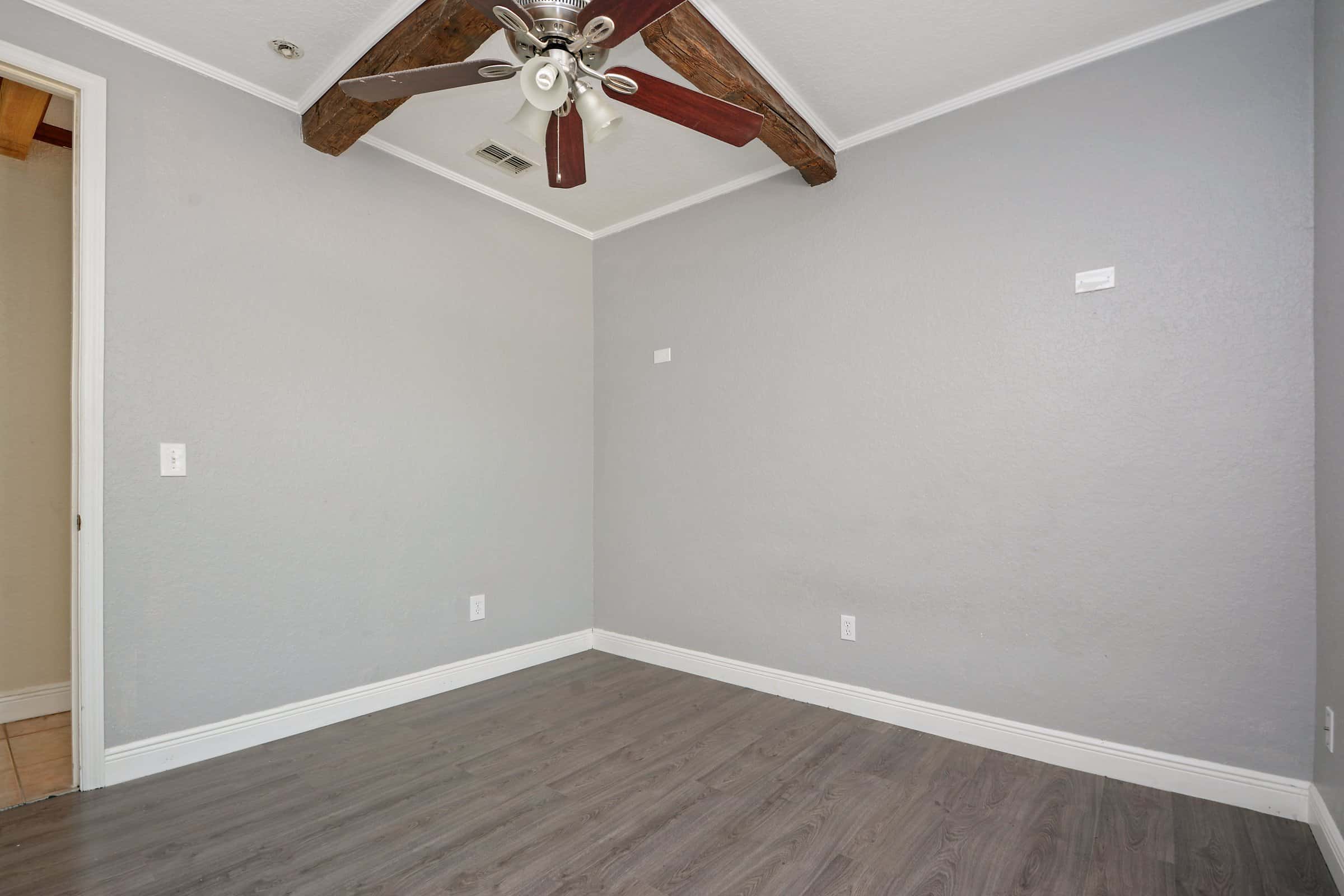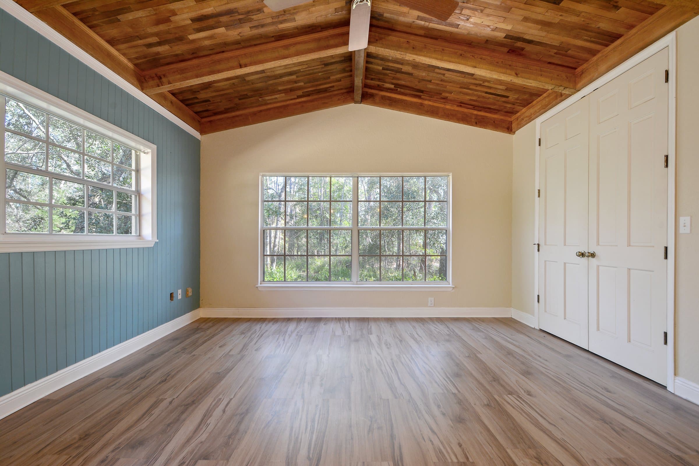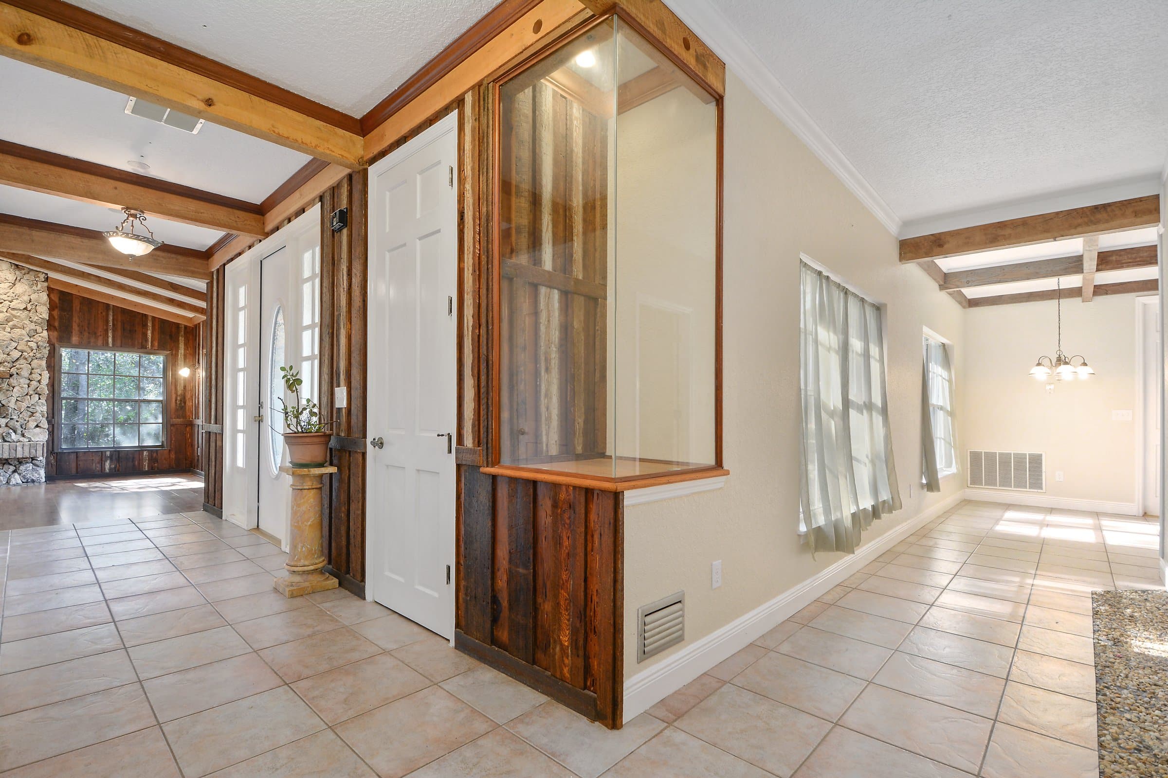 The hallway to the left of the entry leads to the homeβs bedroom areas. The primary suite sits further down the hall and offers extra privacy. Wood beam accents continue here and add character to the room. The suite also features beautiful laminated flooring and calming nature views. Nearby, a secondary bedroom and bathroom provide comfortable space for family or guests. Additionally, the home includes a dedicated office or den. This room works well for remote work, hobbies, or a quiet retreat.