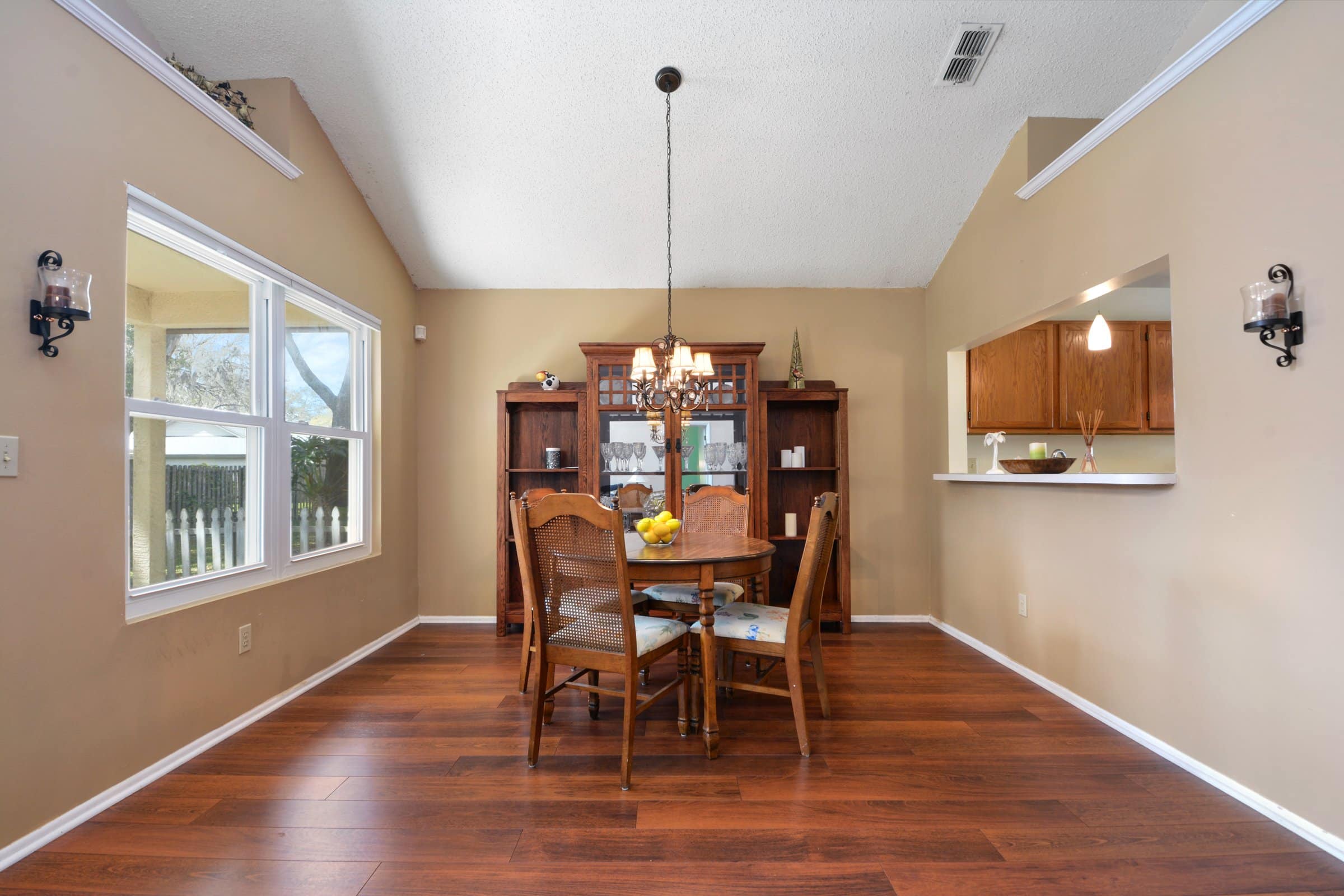 Step inside 1334 Black Willow Trl and you’re immediately greeted by vaulted ceilings and rich laminate flooring that flows throughout the main living areas. Directly to the left of the foyer, a hallway leads to the convenient half bath, laundry room, and garage access. Meanwhile, to the right, the kitchen serves as the heart of the home. It features solid wood cabinetry, upgraded appliances, stylish light fixtures, and a cozy eat-in area overlooking the backyard. Furthermore, a pass-through opening connects the kitchen to the dining room, making entertaining seamless.