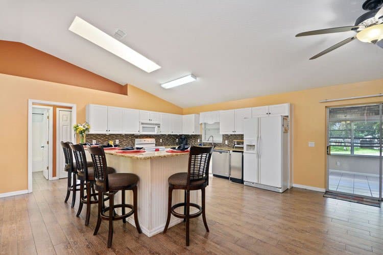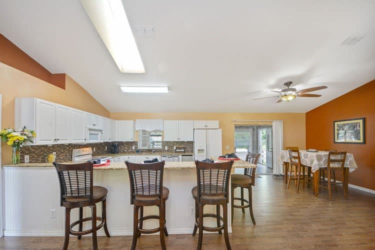 1440 Fort Smith Blvd offers a desirable split floor plan with three bedrooms and two bathrooms. Two secondary bedrooms and a guest bathroom sit on one side of the home, providing privacy for family or guests. On the opposite side, the primary suite creates a quiet retreat. The upgraded kitchen features granite countertops, a glass tile backsplash, solid wood cabinetry, and generous countertop space. In addition, an oversized breakfast bar offers casual seating and connects easily to the dining area, where sliding glass doors lead to the Florida room.