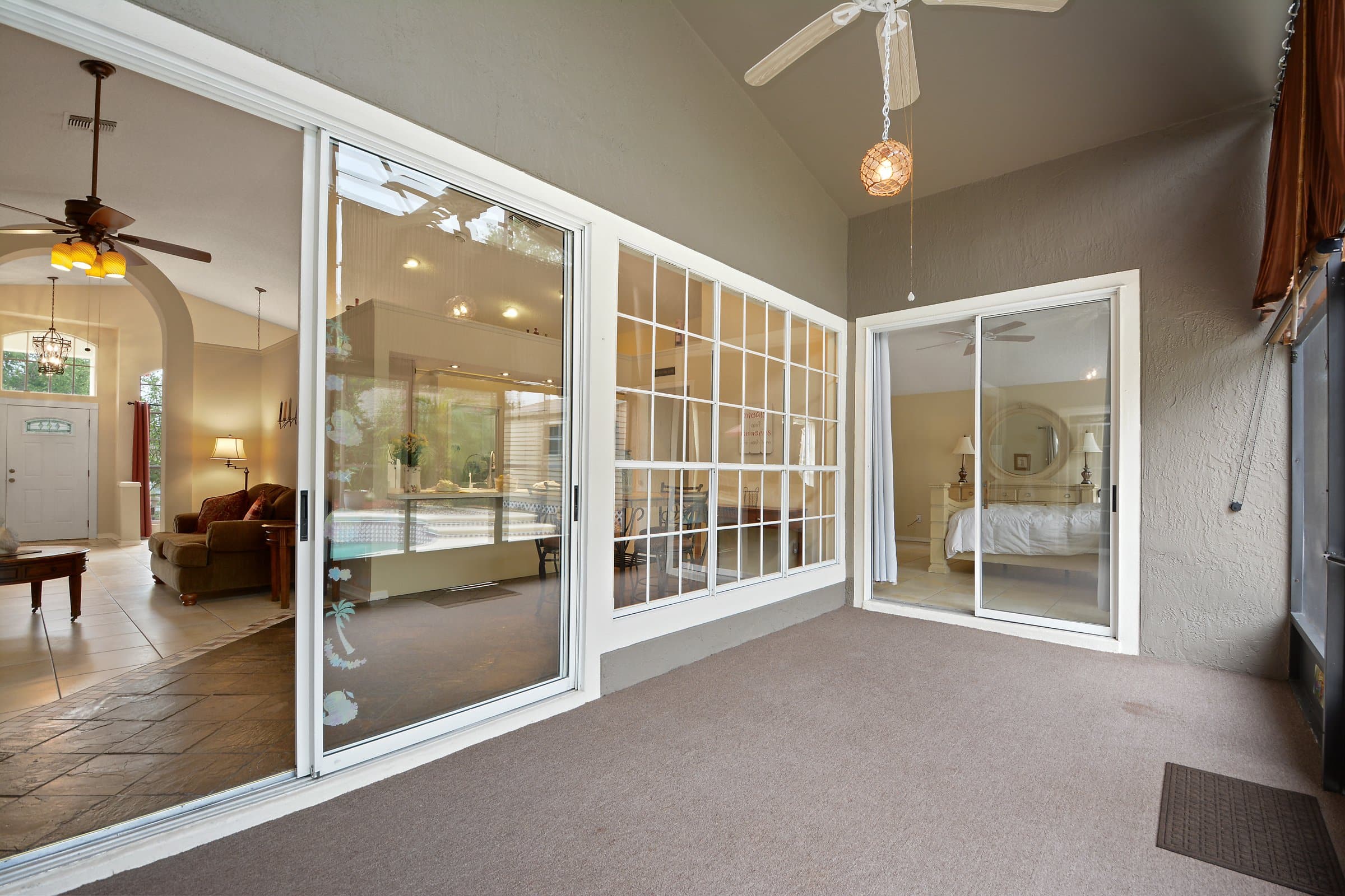 Meanwhile, a hallway on the opposite side of the home leads to three secondary bedrooms. Each bedroom includes ceiling fans and large closets. At the end of the hall, the second bathroom offers convenient patio and pool access. Consequently, guests and family members can easily move between indoor and outdoor spaces.