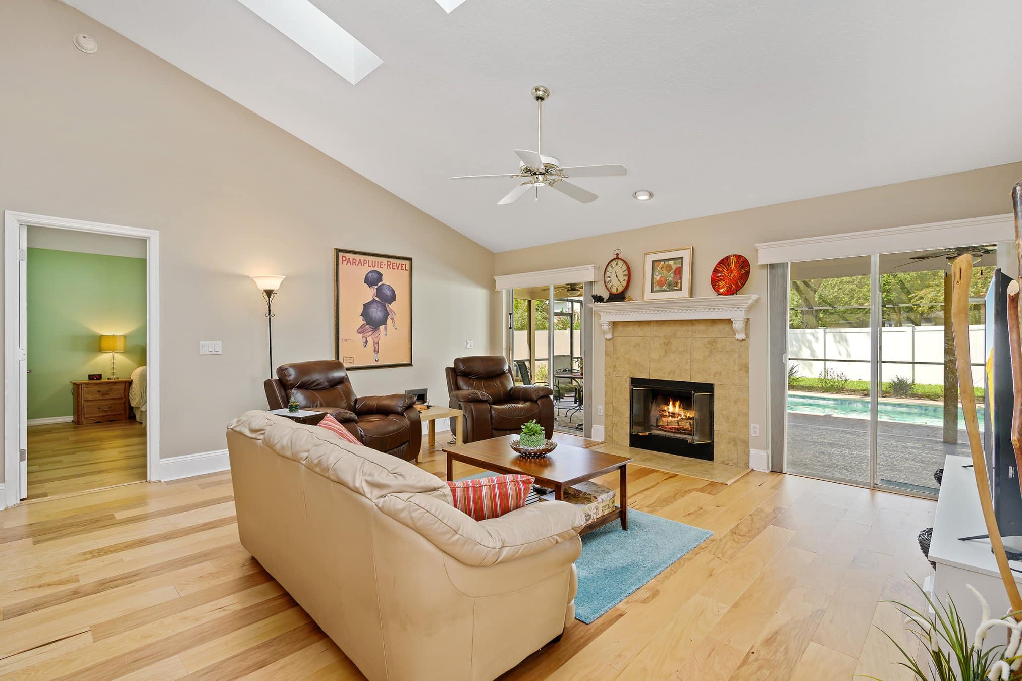At 2175 Inverness Ct, the foyer opens into both living and dining rooms, each filled with light from front-facing windows. Large plantation shutters provide privacy while enhancing curb appeal from inside the home. In addition, the upgraded fixtures create a modern and polished atmosphere. As you continue, beautiful hickory wood flooring flows into the open kitchen and family room. Vaulted ceilings and skylights in the family room create an airy, spacious feel. Meanwhile, a cozy wood-burning fireplace adds warmth, making it an ideal gathering space. Ultimately, this floor plan offers comfort, style, and plenty of room for entertaining.