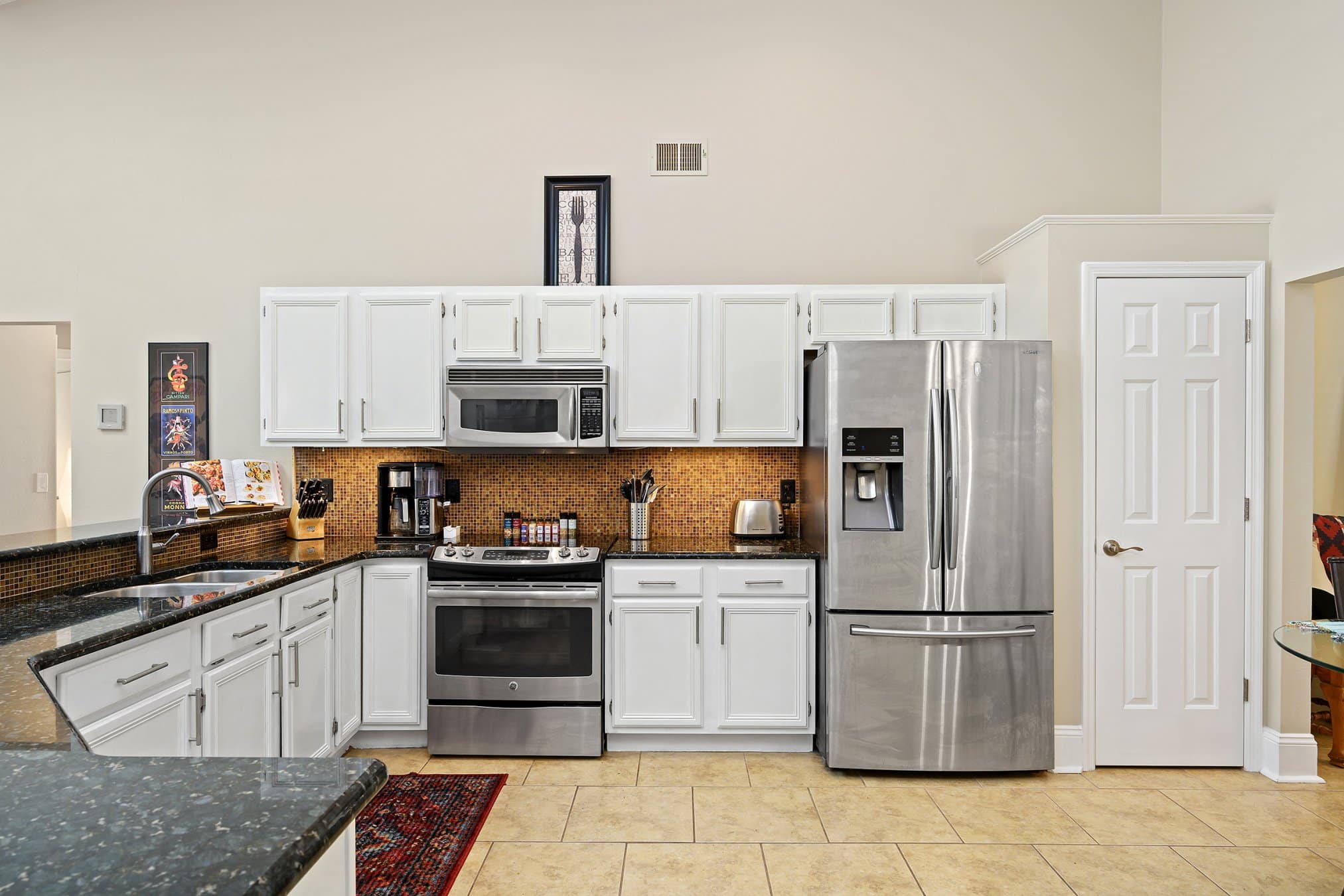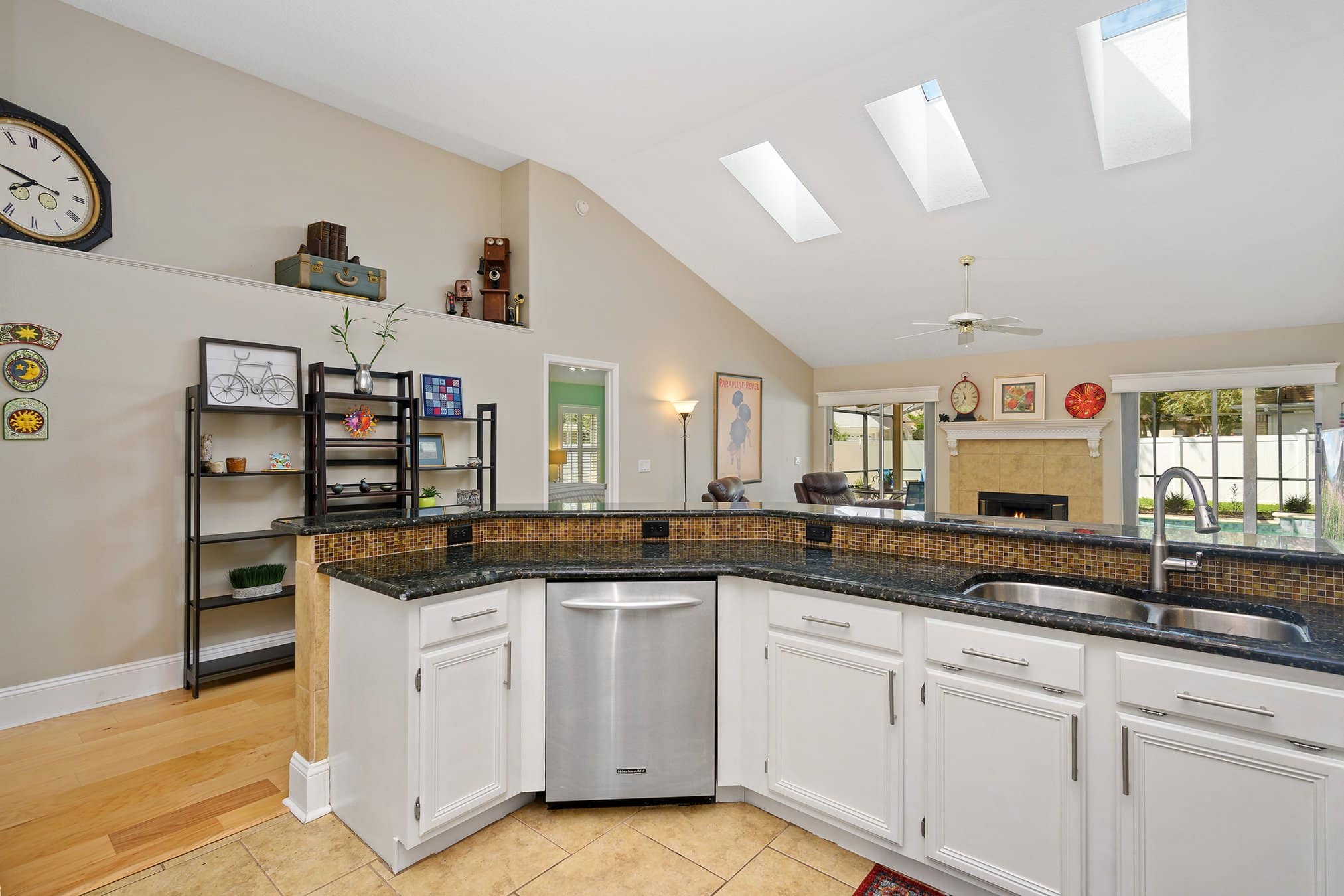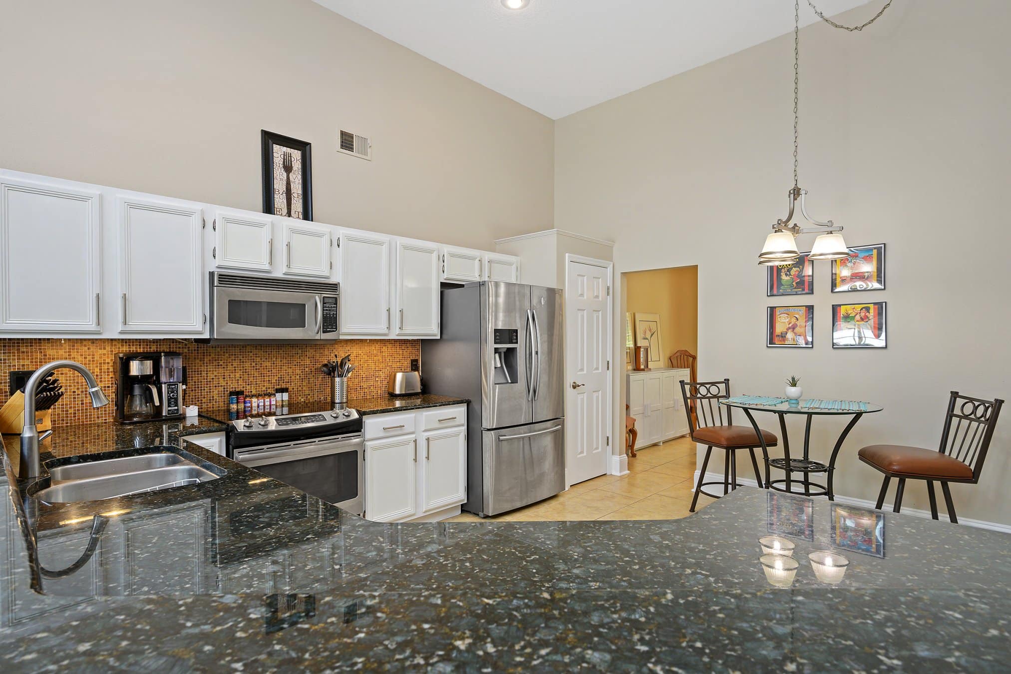 The kitchen at 2175 Inverness Ct is both functional and inviting, providing everything you need in a modern home. Miles of granite countertop space allow for meal preparation, while the large breakfast bar encourages casual dining. Stainless steel appliances, a tile backsplash, and fresh white cabinetry provide a contemporary look. Additionally, there’s ample space for a dinette, perfect for morning coffee or family meals. Its location near the living spaces ensures that the kitchen remains the true heart of the home. Equally important, the open design allows seamless interaction during gatherings. Indeed, this kitchen enhances both practicality and style.