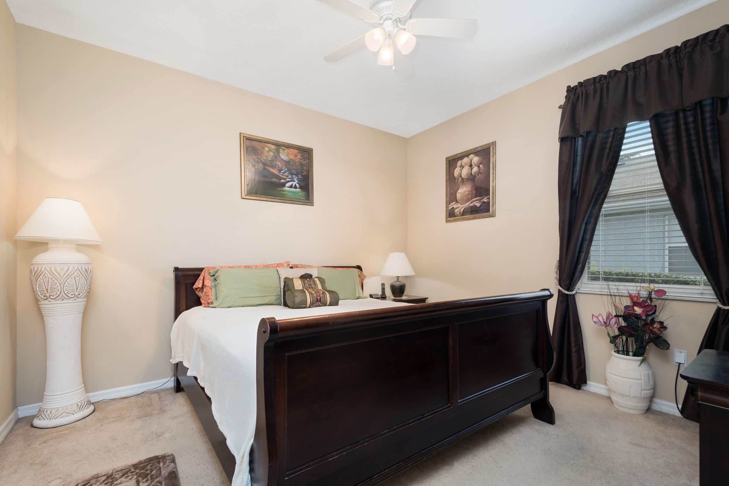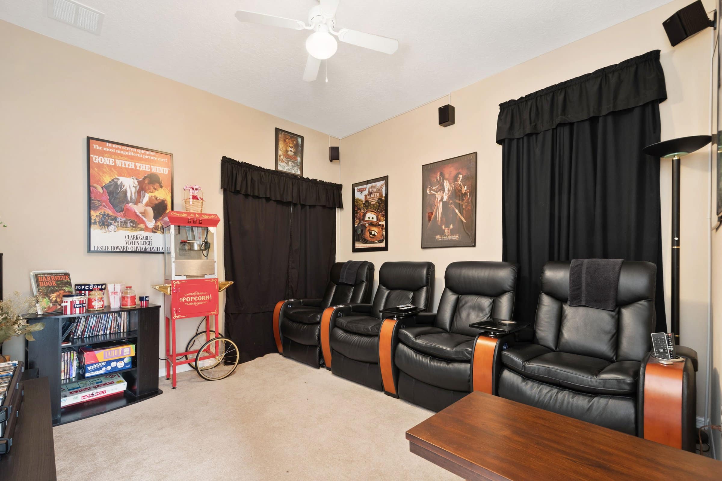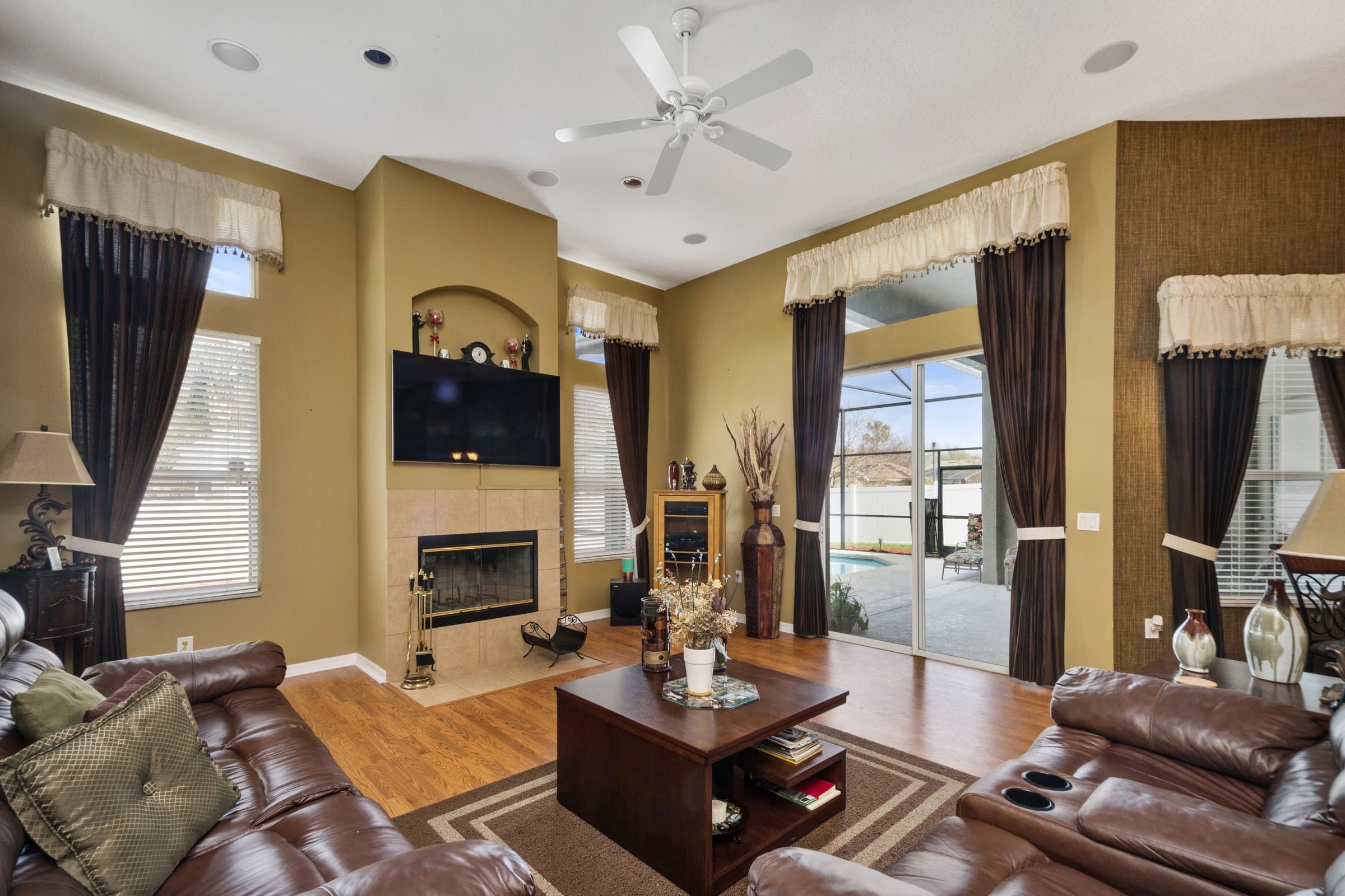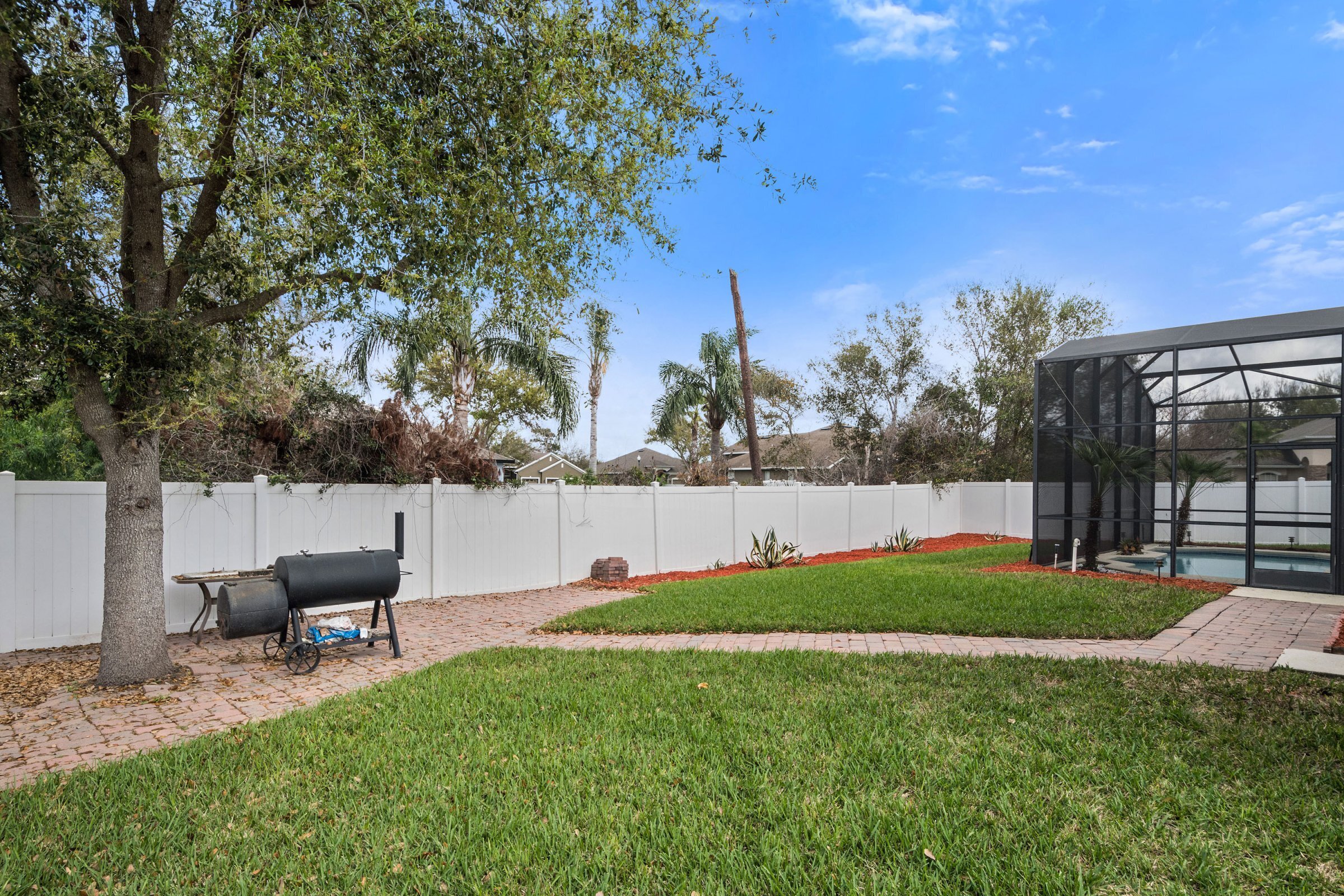 Equally impressive, the outdoor living area creates a private retreat designed for enjoyment year-round. Sliding glass doors open to a covered patio with a ceiling fan, which keeps the space comfortable during warmer days. Beyond the patio, a screened-in pool overlooks a large, fully fenced backyard. Additionally, a paver area toward the back of the yard offers the perfect spot for grilling. For example, homeowners can host gatherings, relax poolside, or add a playset while still maintaining ample open space. Ultimately, this backyard delivers both function and flexibility.