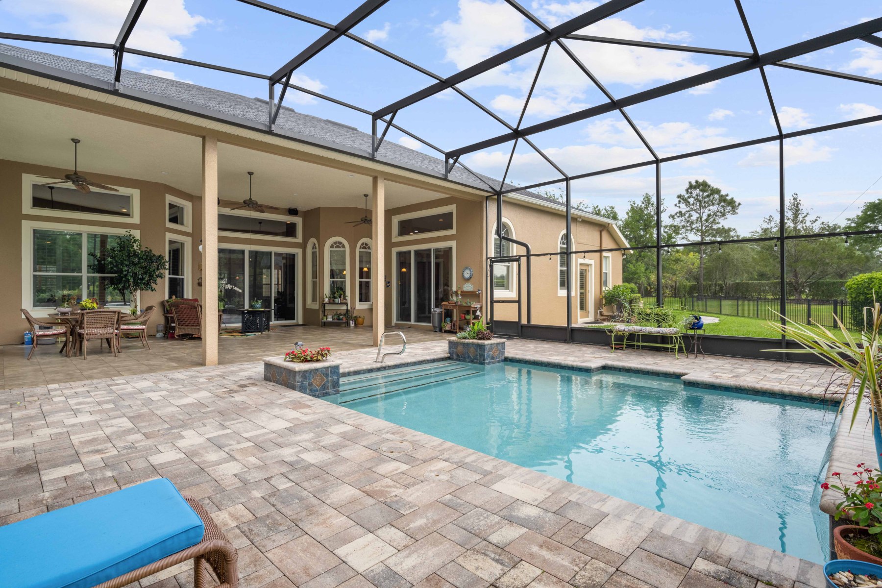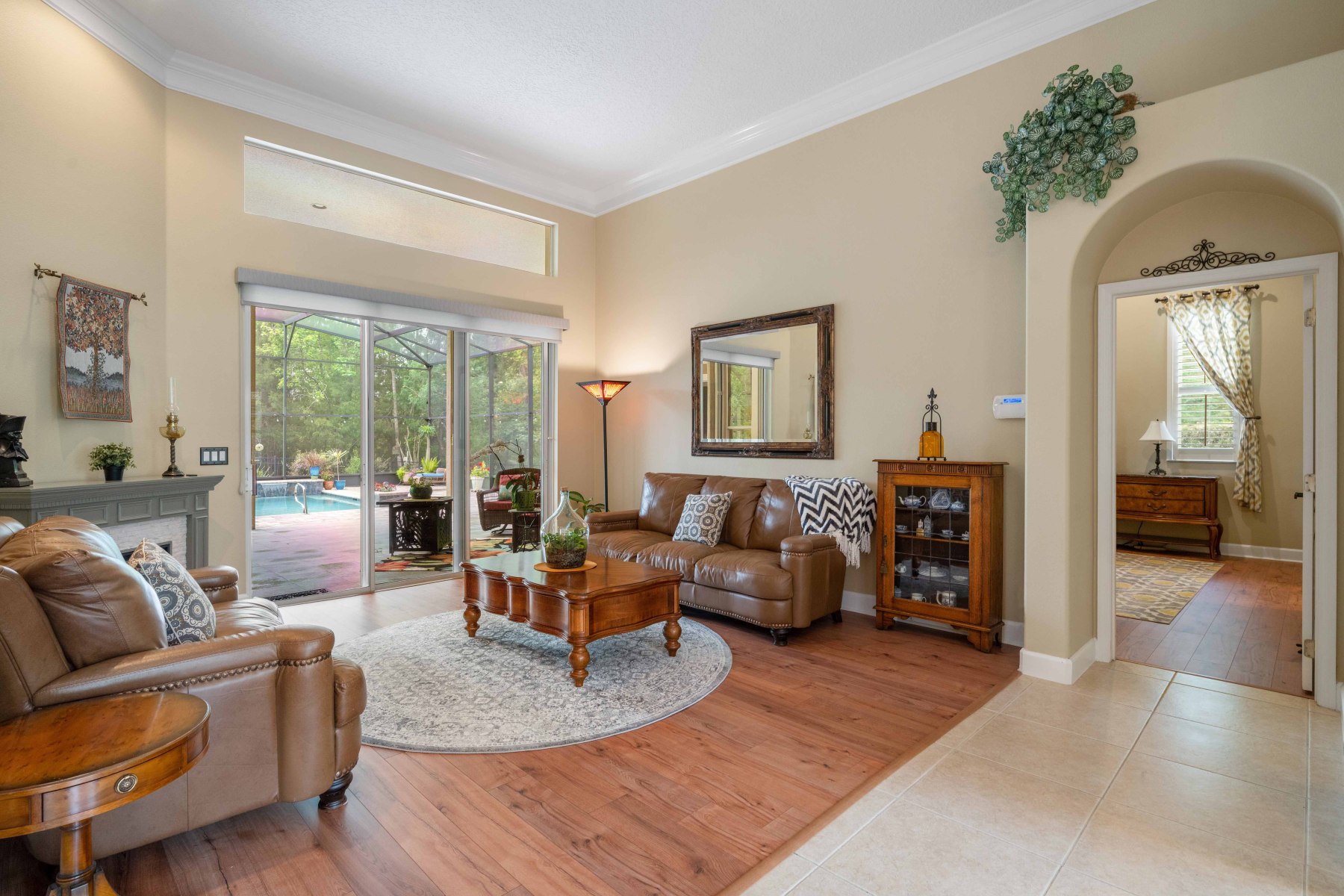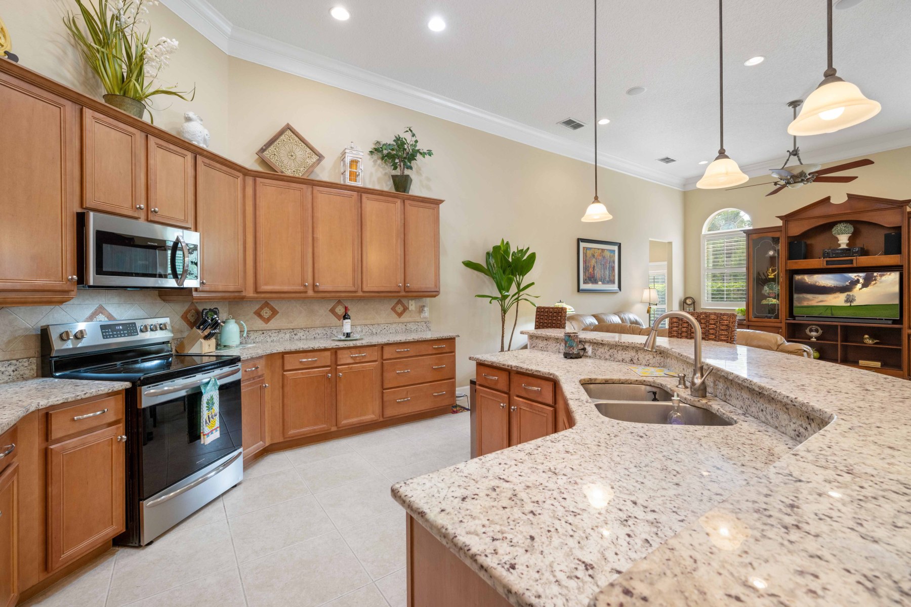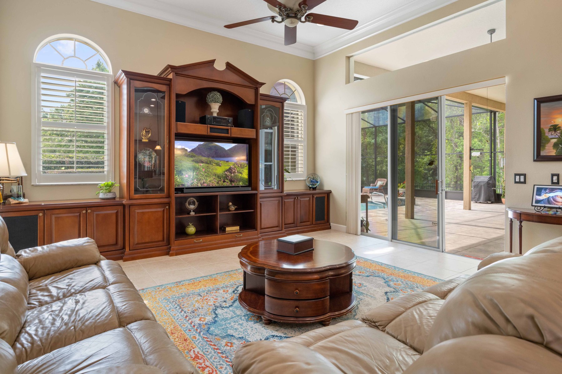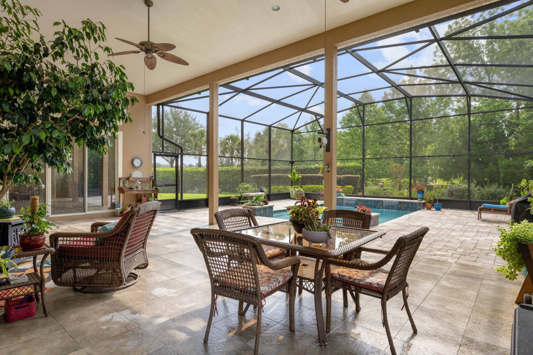 The heart of 2430 June Oak Ct is its chef-inspired kitchen and bright, open family room. The kitchen features granite counters, stainless steel appliances, and 42” cabinets for ample storage. Additionally, a center island with bar seating and a walk-in pantry adds everyday convenience. A cozy dinette overlooks the pool area, perfect for casual meals with a view. The adjacent family room boasts crown molding and a custom entertainment center. Sliding glass doors open to the screened patio, creating effortless indoor-outdoor flow. This space is ideal for hosting gatherings or enjoying quiet evenings at home.