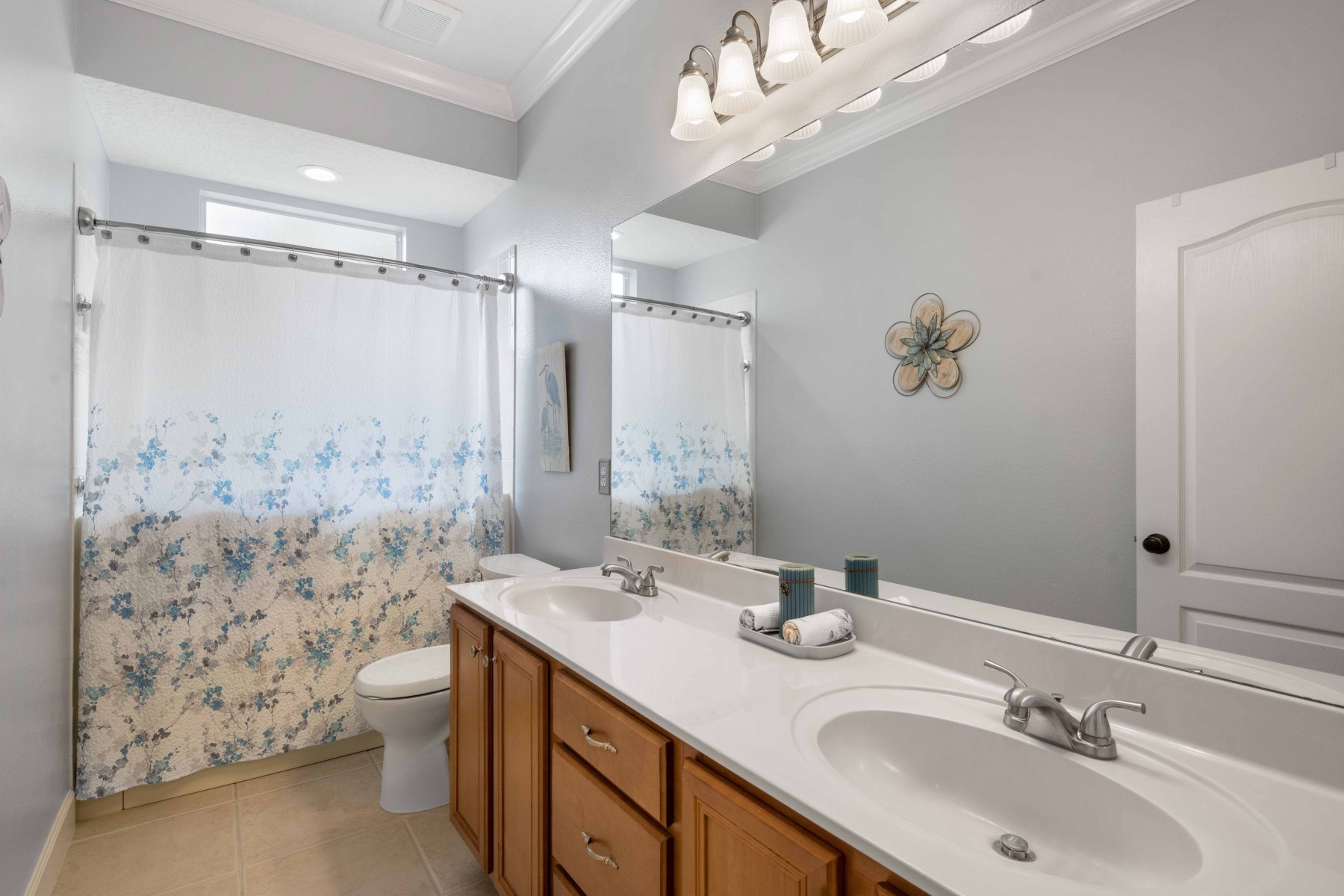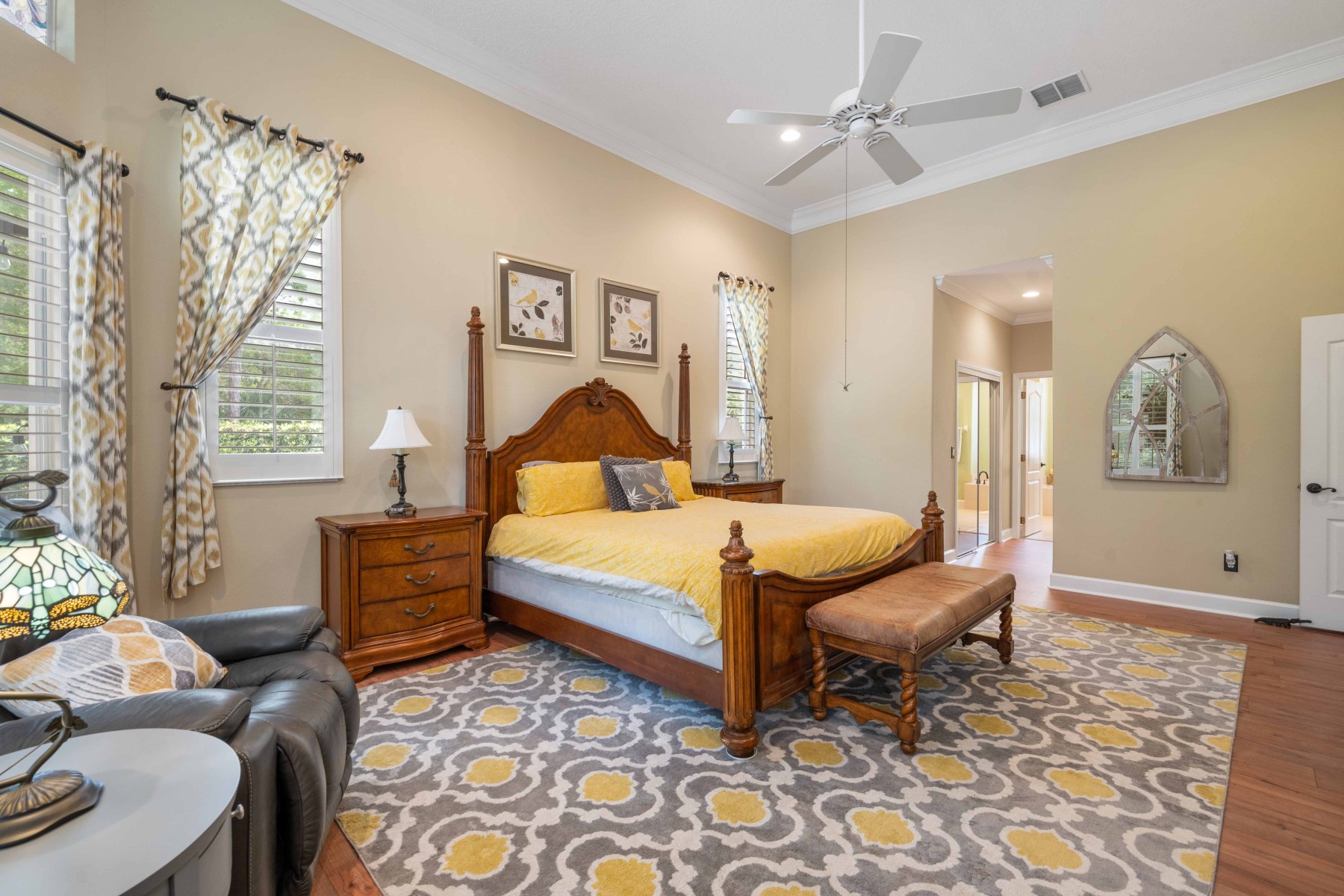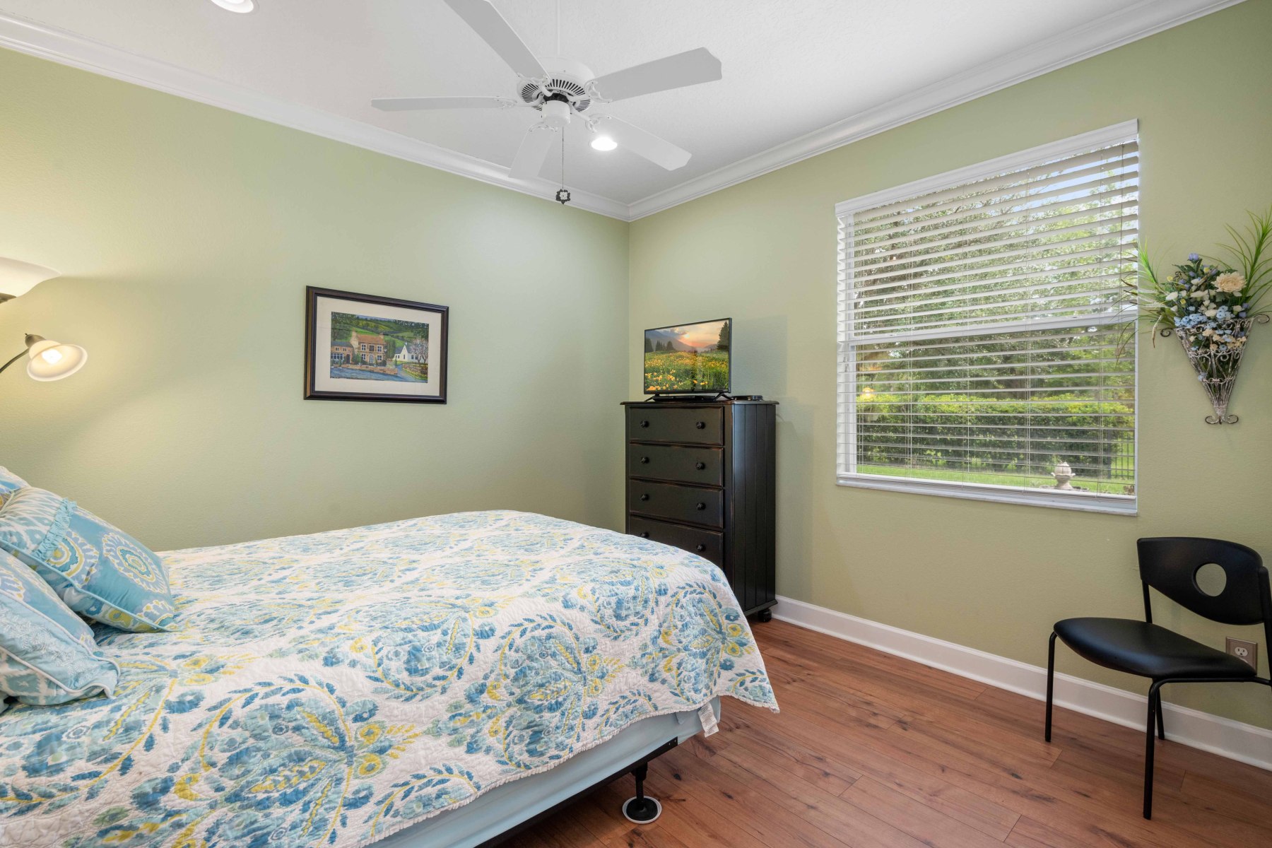 Two secondary bedrooms and a full bath are located off the hallway near the dining room. Each room features vinyl flooring, ceiling fans, crown molding, and spacious closets. The shared bathroom includes a double-sink vanity and a walk-in tub/shower combo. Meanwhile, the laundry room offers upper cabinets, a utility sink, and garage access. Toward the back of 2430 June Oak Ct, a fourth bedroom offers guest or in-law privacy. A third bathroom with updated finishes connects directly to the patio—perfect for poolside use. Altogether, the layout offers function, privacy, and versatility for any household.