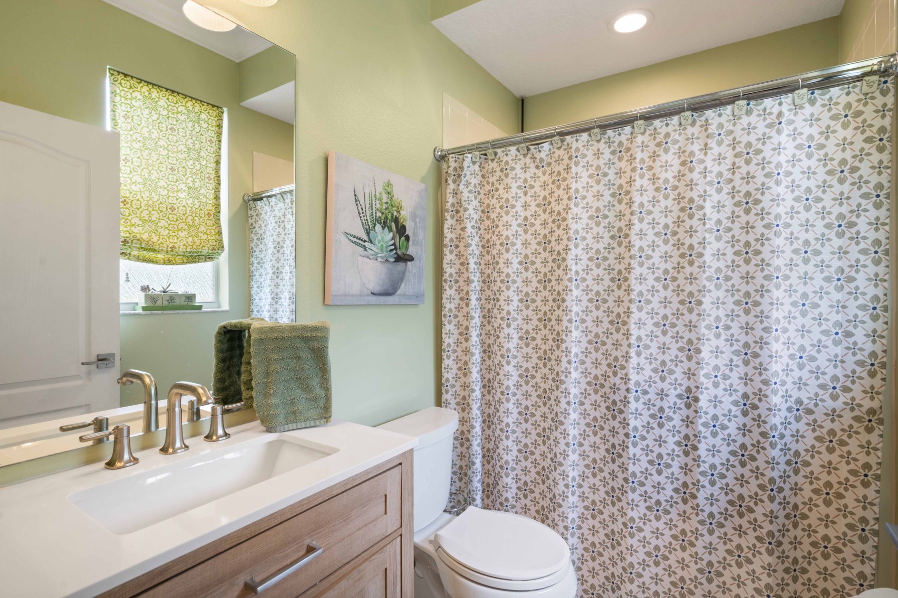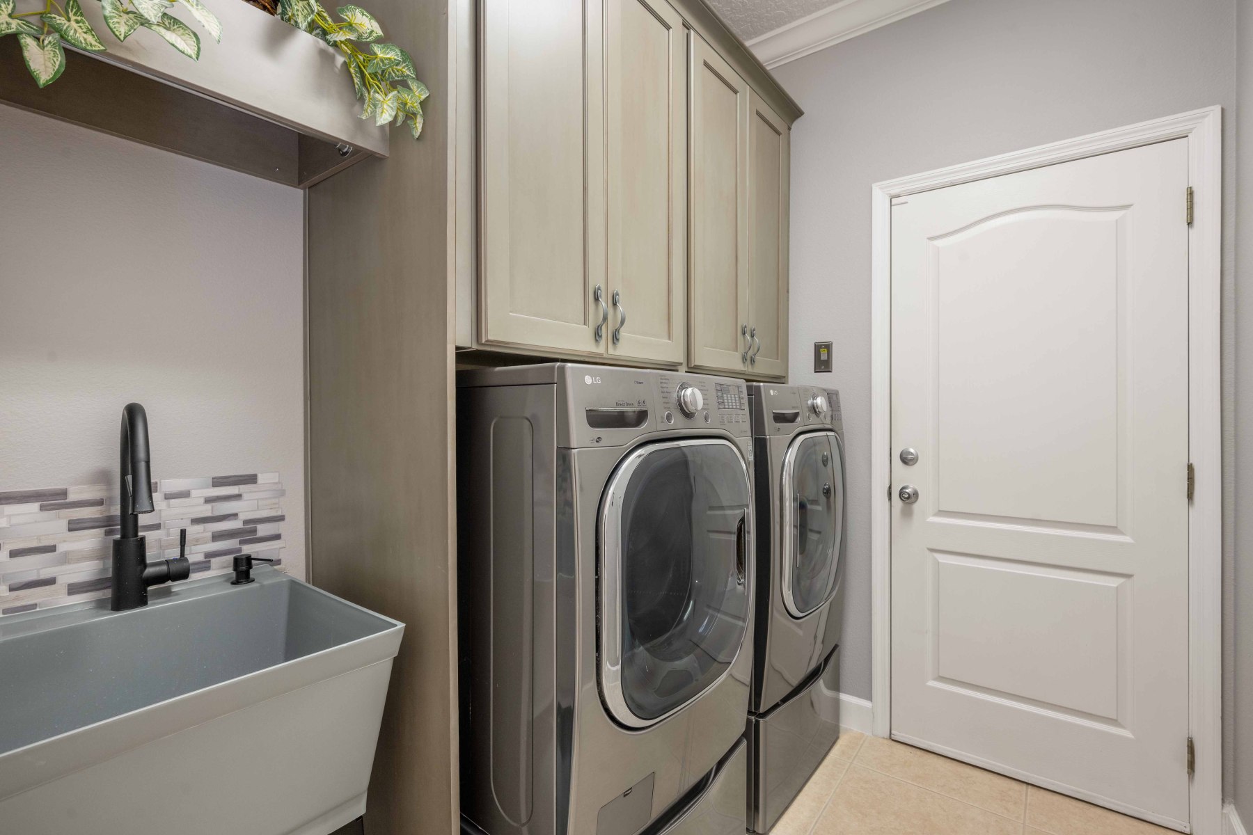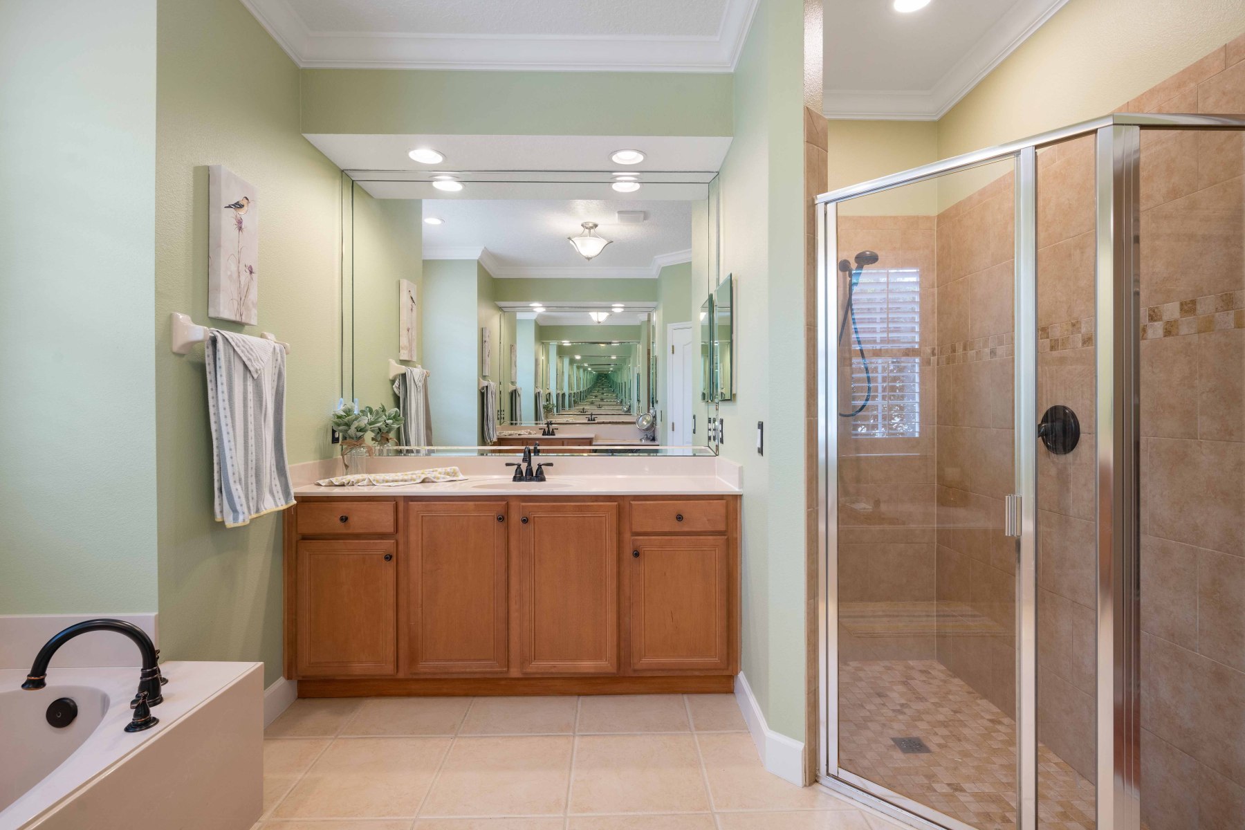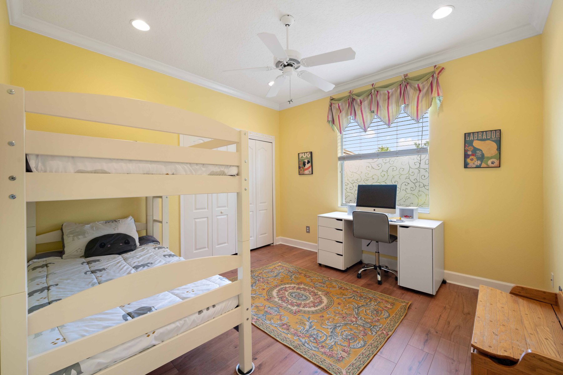 Two secondary bedrooms and a full bath are located off the hallway near the dining room. Each room features vinyl flooring, ceiling fans, crown molding, and spacious closets. The shared bathroom includes a double-sink vanity and a walk-in tub/shower combo. Meanwhile, the laundry room offers upper cabinets, a utility sink, and garage access. Toward the back of 2430 June Oak Ct, a fourth bedroom offers guest or in-law privacy. A third bathroom with updated finishes connects directly to the patio—perfect for poolside use. Altogether, the layout offers function, privacy, and versatility for any household.