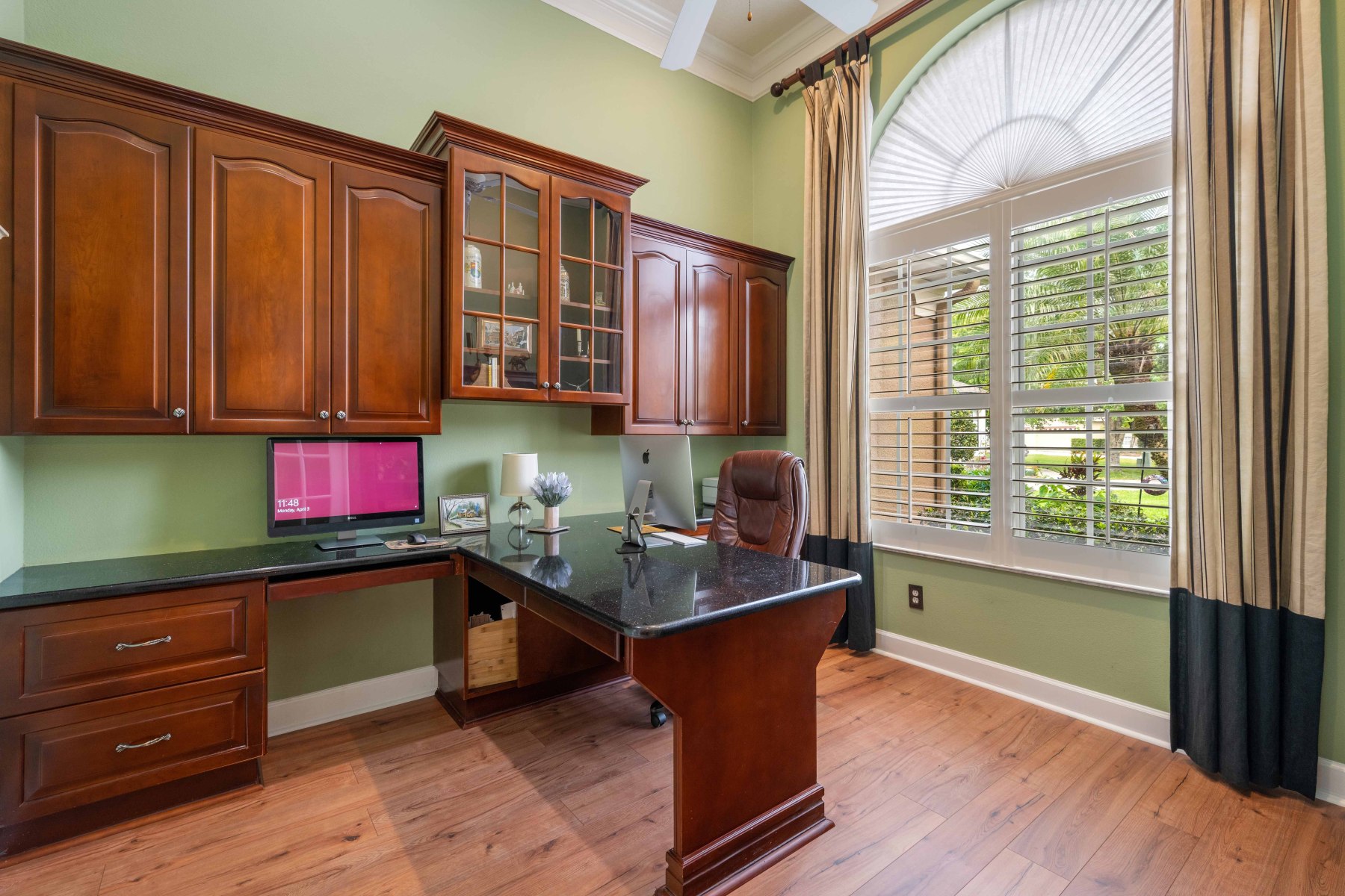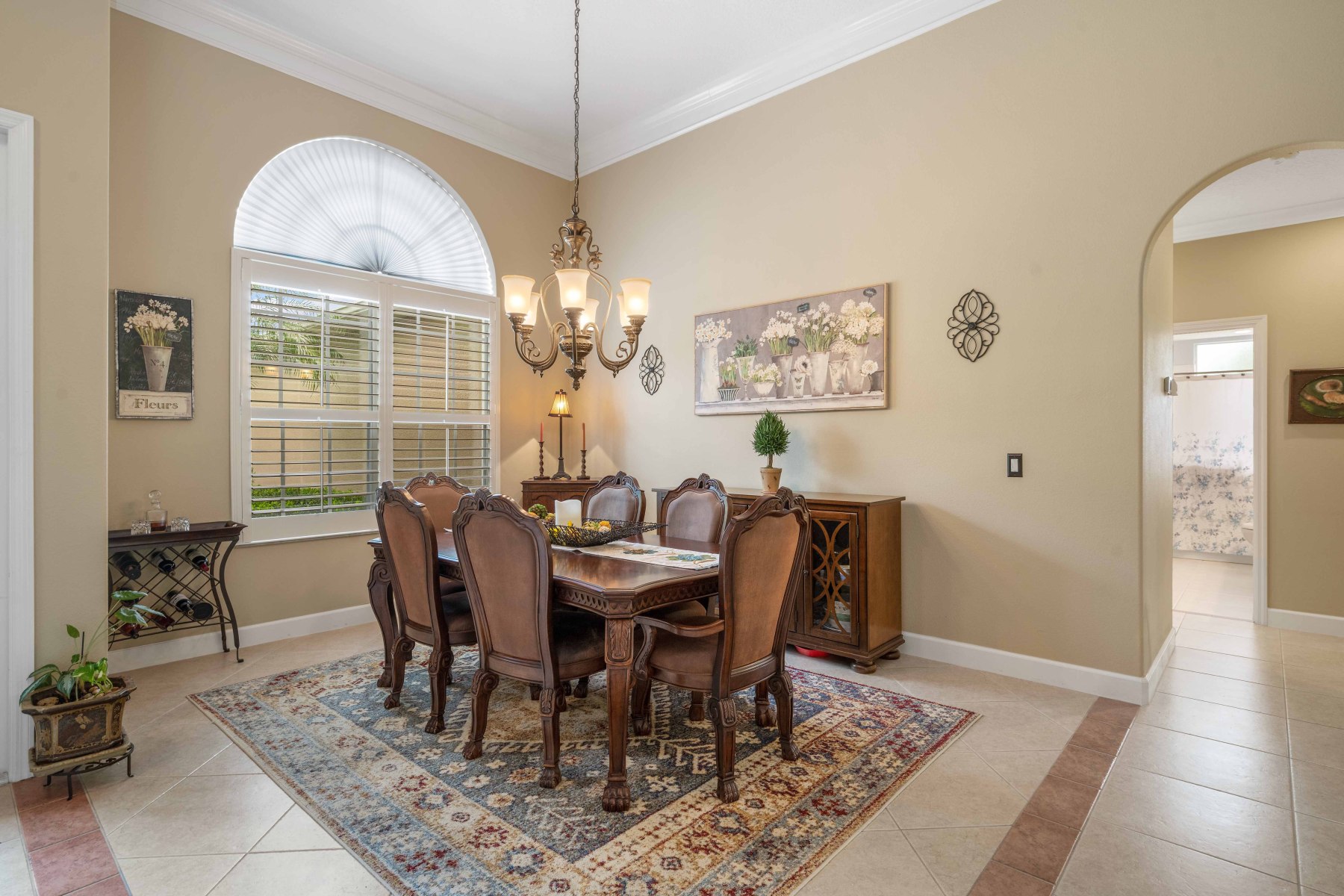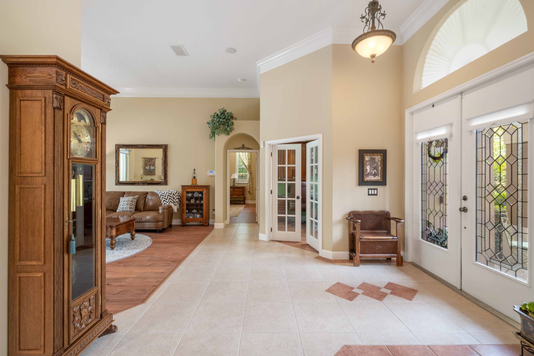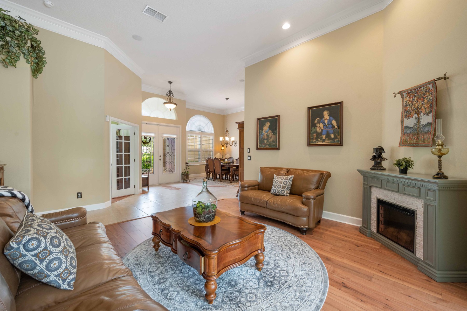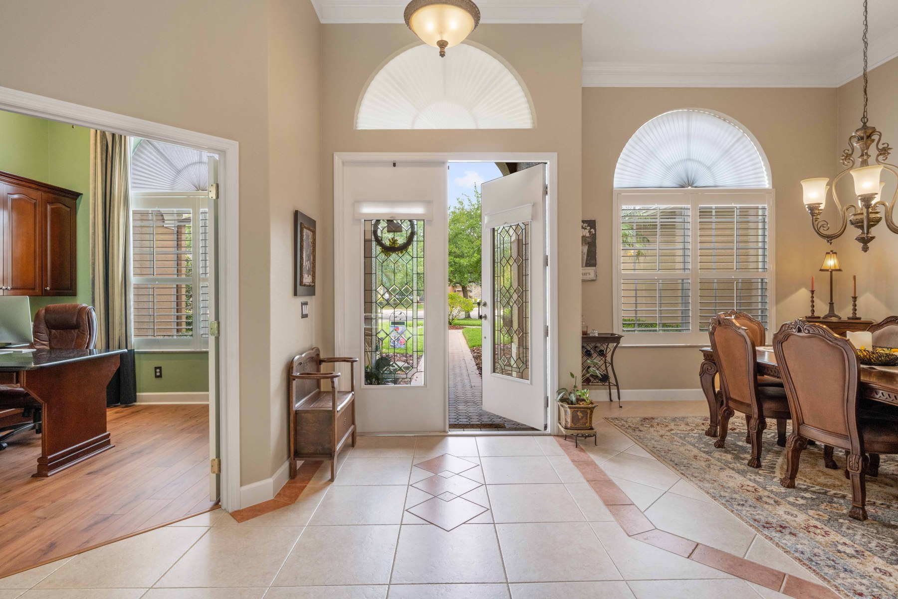 Upon entry, 2430 June Oak Ct greets you with soaring ceilings and abundant natural light. Crown molding and luxury vinyl floors add elegance and warmth throughout the home. To the left, a formal dining room features a large window and a stunning chandelier. The living room opens to a covered patio, blending indoor and outdoor living. On the right, a private office includes built-in shelving and French doors for quiet focus. These custom details provide both charm and functional comfort in every room. Altogether, the layout offers flexibility for working, relaxing, and entertaining.