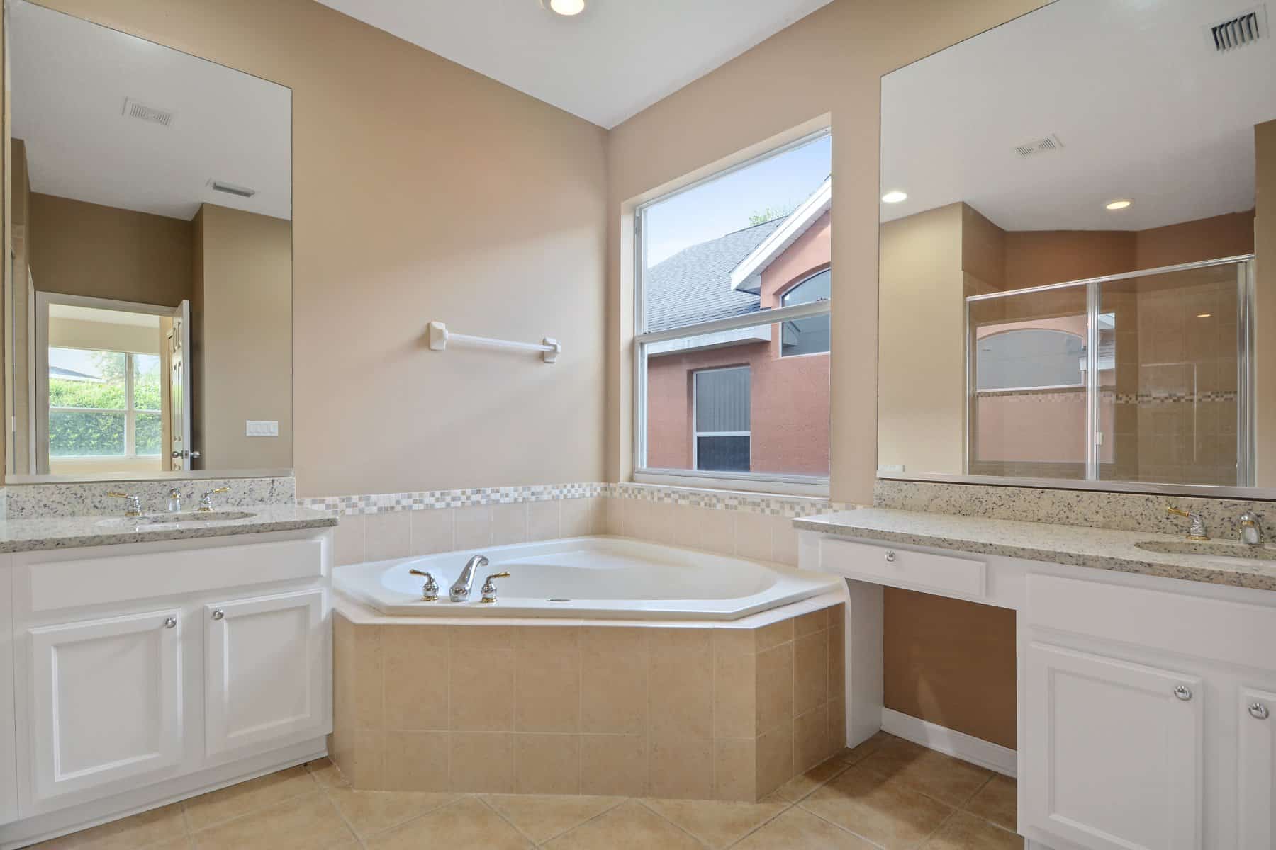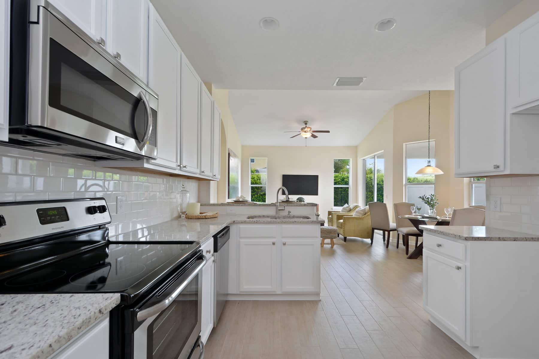Next, the upgraded kitchen sits adjacent to the family room here at 2862 Sweetspire Cir, offering both style and practicality. Notably, it features 42-inch solid wood cabinetry, granite countertops, stainless steel appliances, and a convenient breakfast bar that works perfectly for casual dining. In addition, the nearby eat-in kitchen area provides a cozy spot for everyday meals. Meanwhile, the primary suite sits just off the family room and creates a peaceful retreat filled with natural light. Large windows and dual walk-in closets add comfort and storage. Furthermore, the upgraded primary bathroom includes a spacious walk-in shower, a relaxing garden tub, and dual vanities.