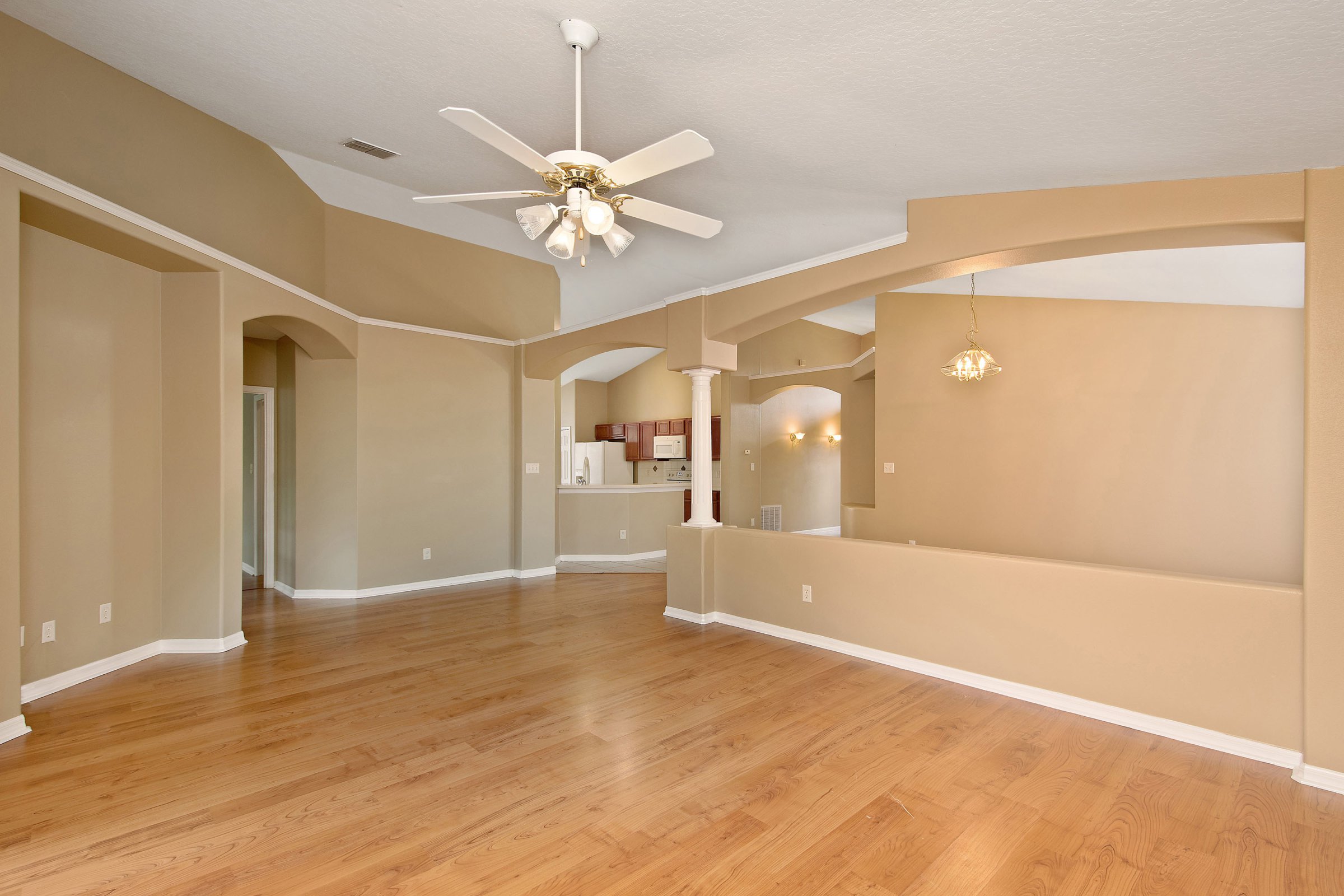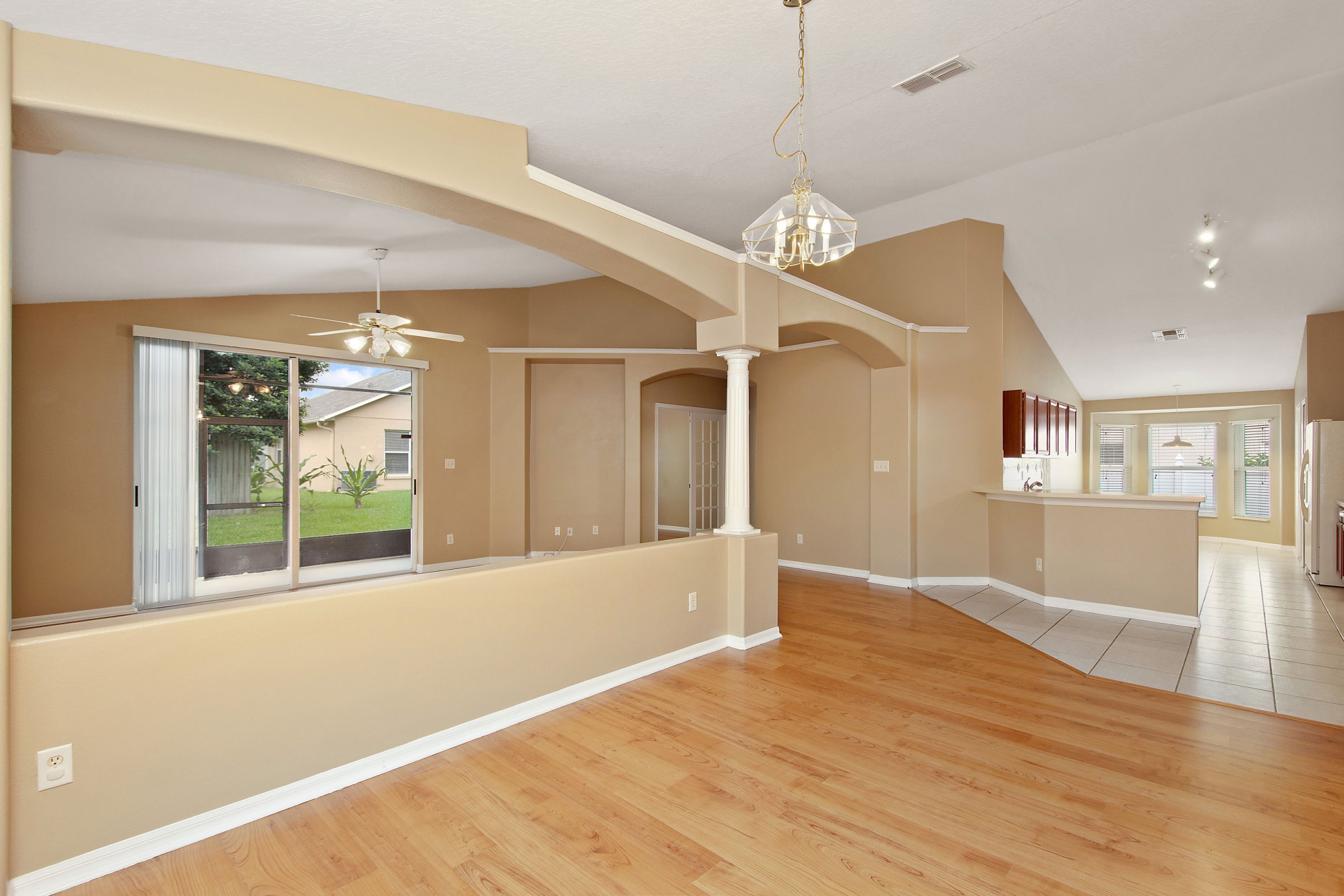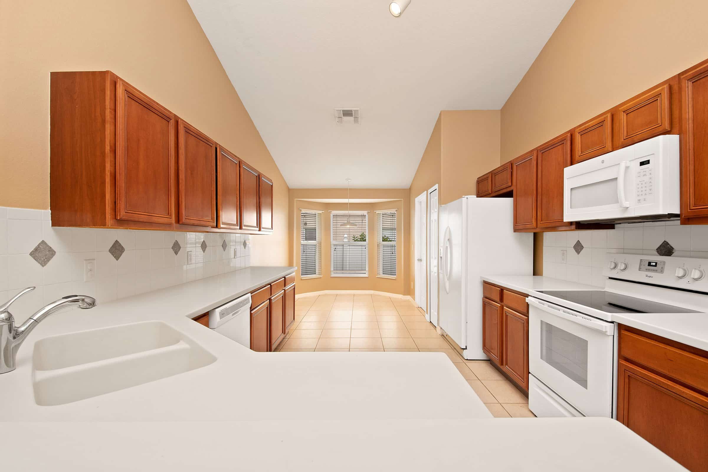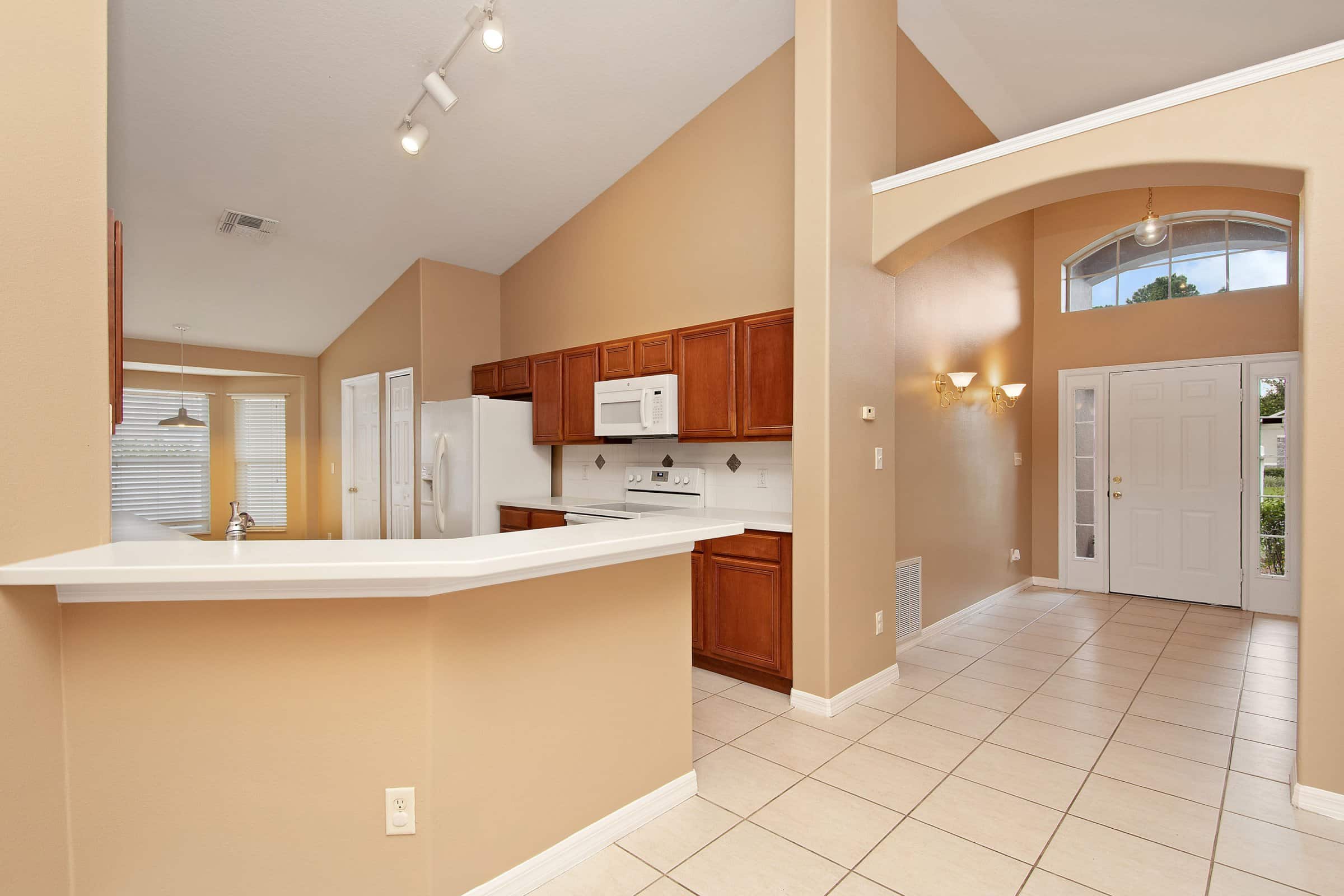Through the arched entryway, the main living areas open up beautifully, making 2883 Strand Cir an entertainer’s dream. The kitchen features solid wood cabinetry, expansive solid-surface countertop space, a tile backsplash, a pantry, a dinette, and a breakfast bar overlooking both the dining and family rooms. Directly across from the kitchen, the dining room showcases an arched opening and elegant column details that connect seamlessly to the family room. Furthermore, tall vaulted ceilings and abundant natural light make these spaces feel even larger and more inviting.