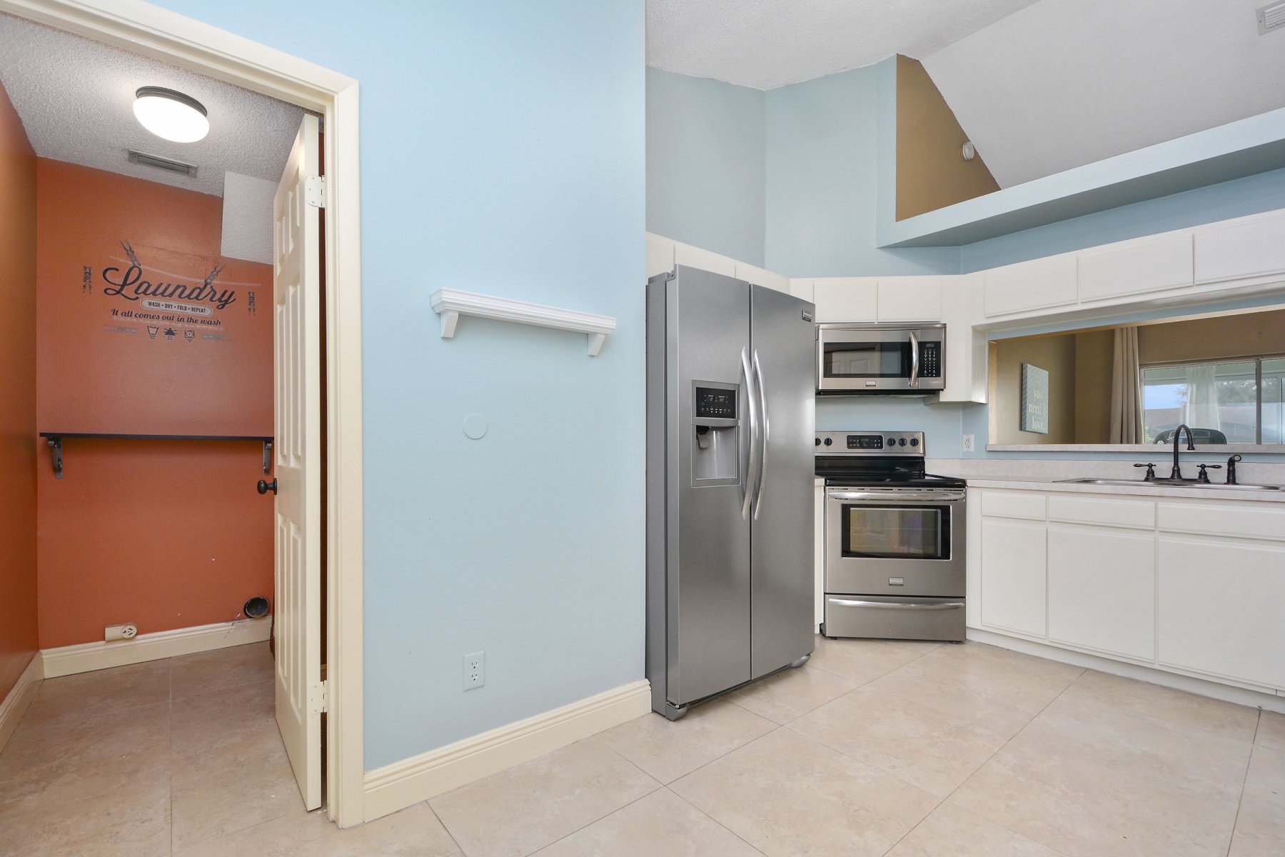 The spacious family room offers vaulted ceilings, decorative plant shelves, and sliding door access to the Florida room. Neutral tile flooring runs throughout the main living areas, while laminate flooring adds warmth to the bedrooms and slate tile finishes both bathrooms.