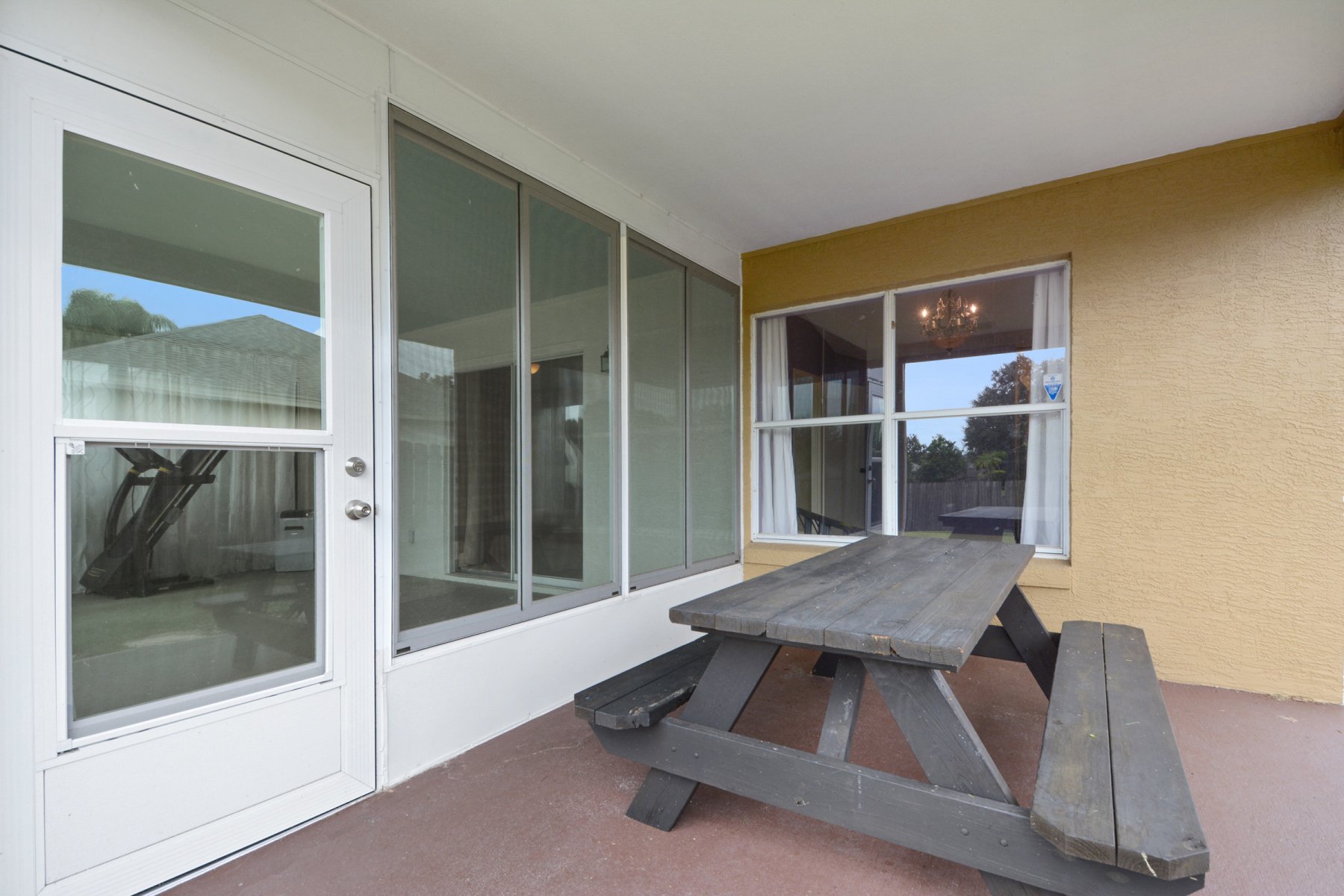 Sliding doors from the family room of 2885 Babylon Ct lead into a bright Florida room surrounded by windows that can be opened to enjoy a cool breeze. Just outside, a covered patio overlooks the expansive backyard. The fully fenced yard includes a storage shed and several citrus trees that enhance the tropical atmosphere. Additionally, the spacious yard offers plenty of room for outdoor gatherings, gardening, or pets to run and play.