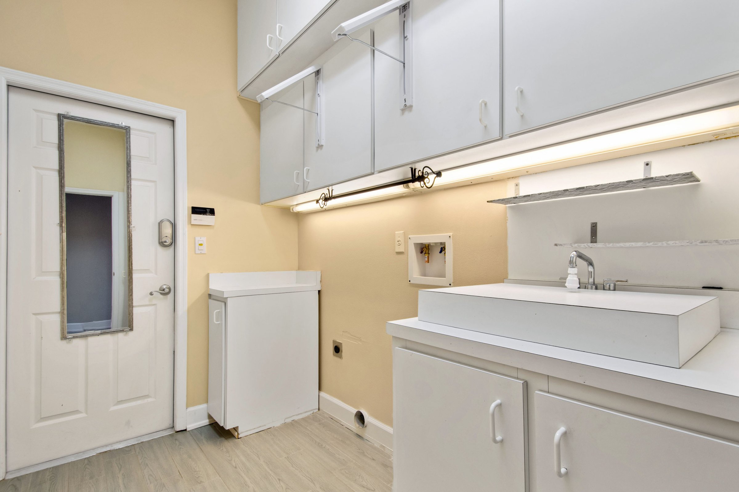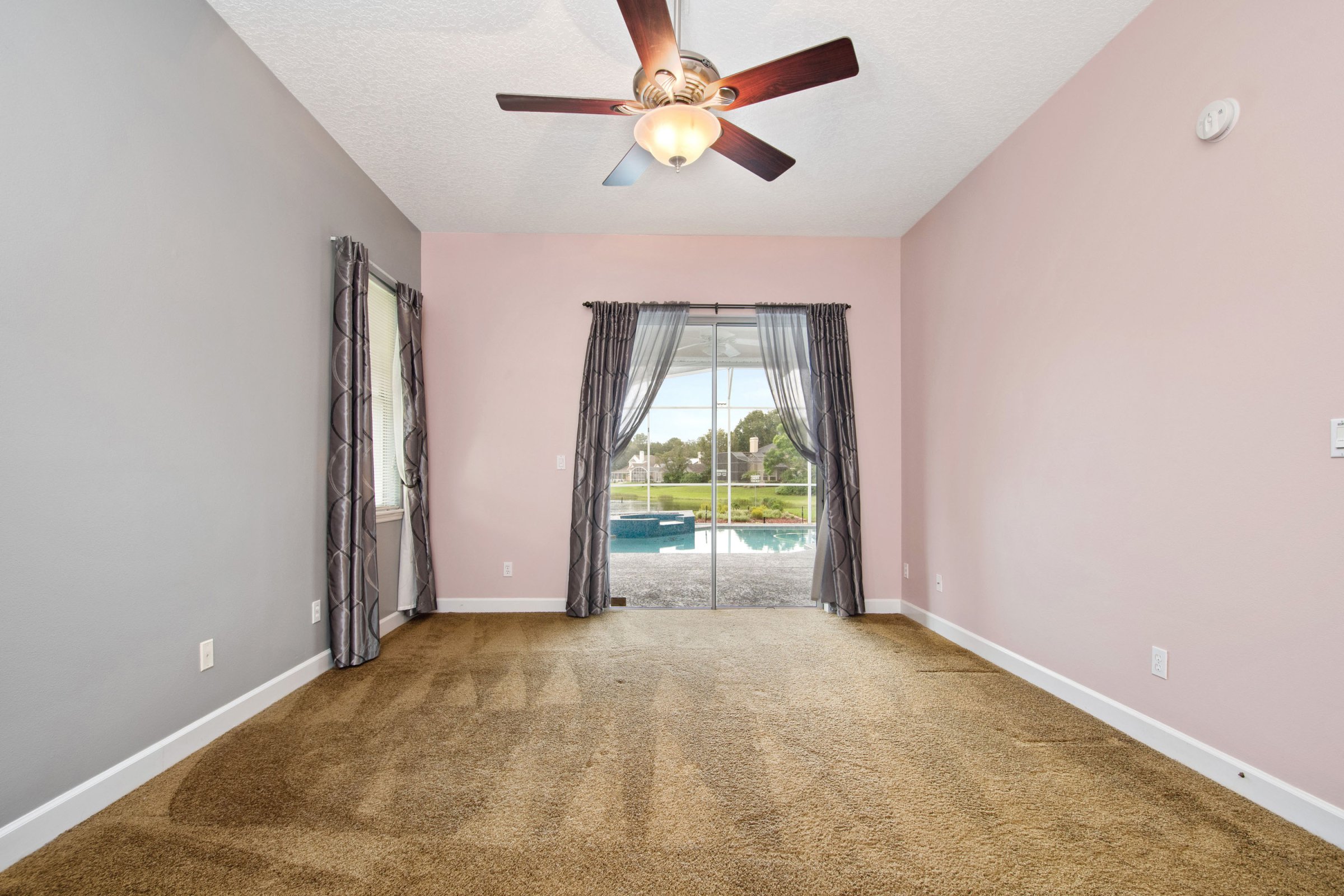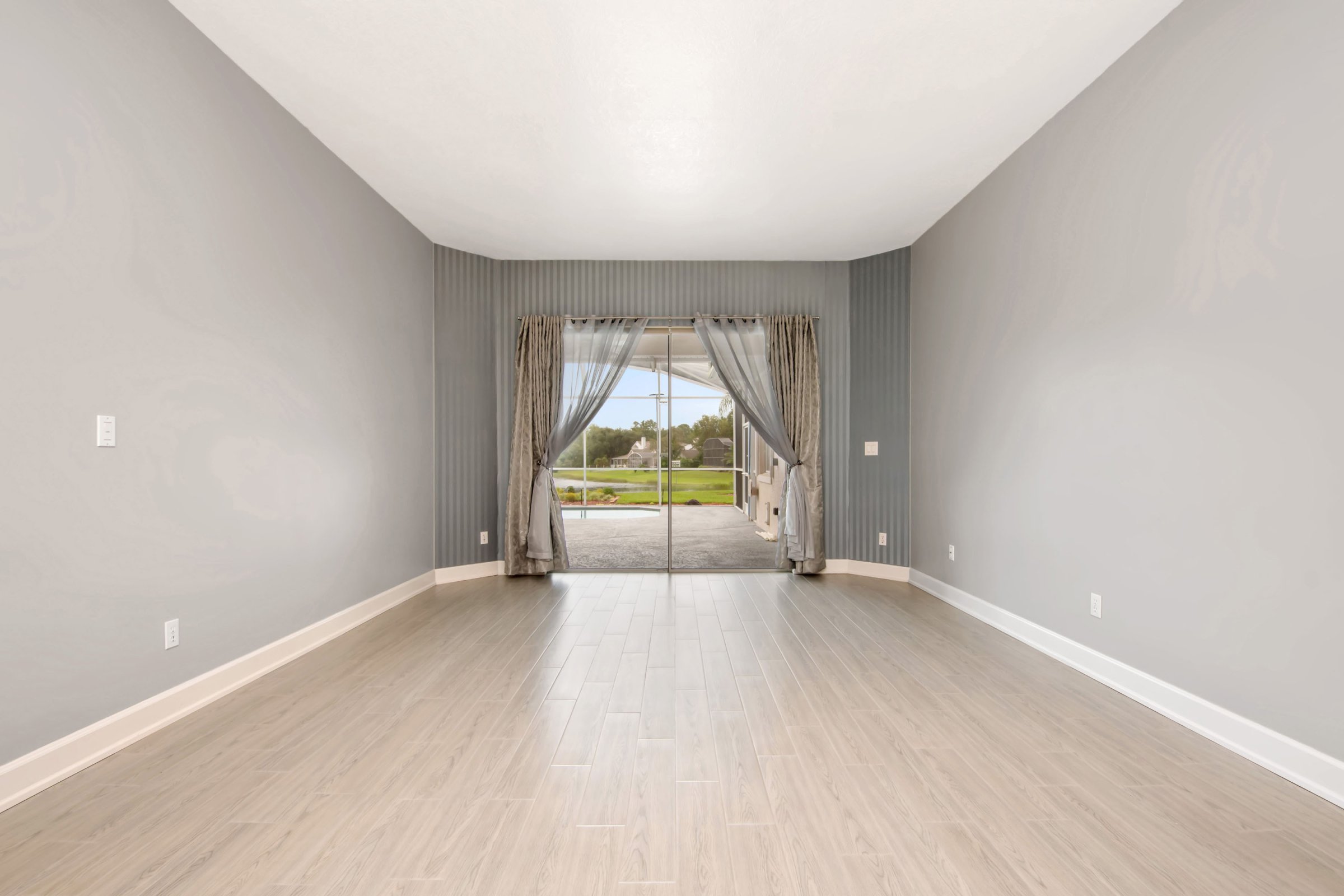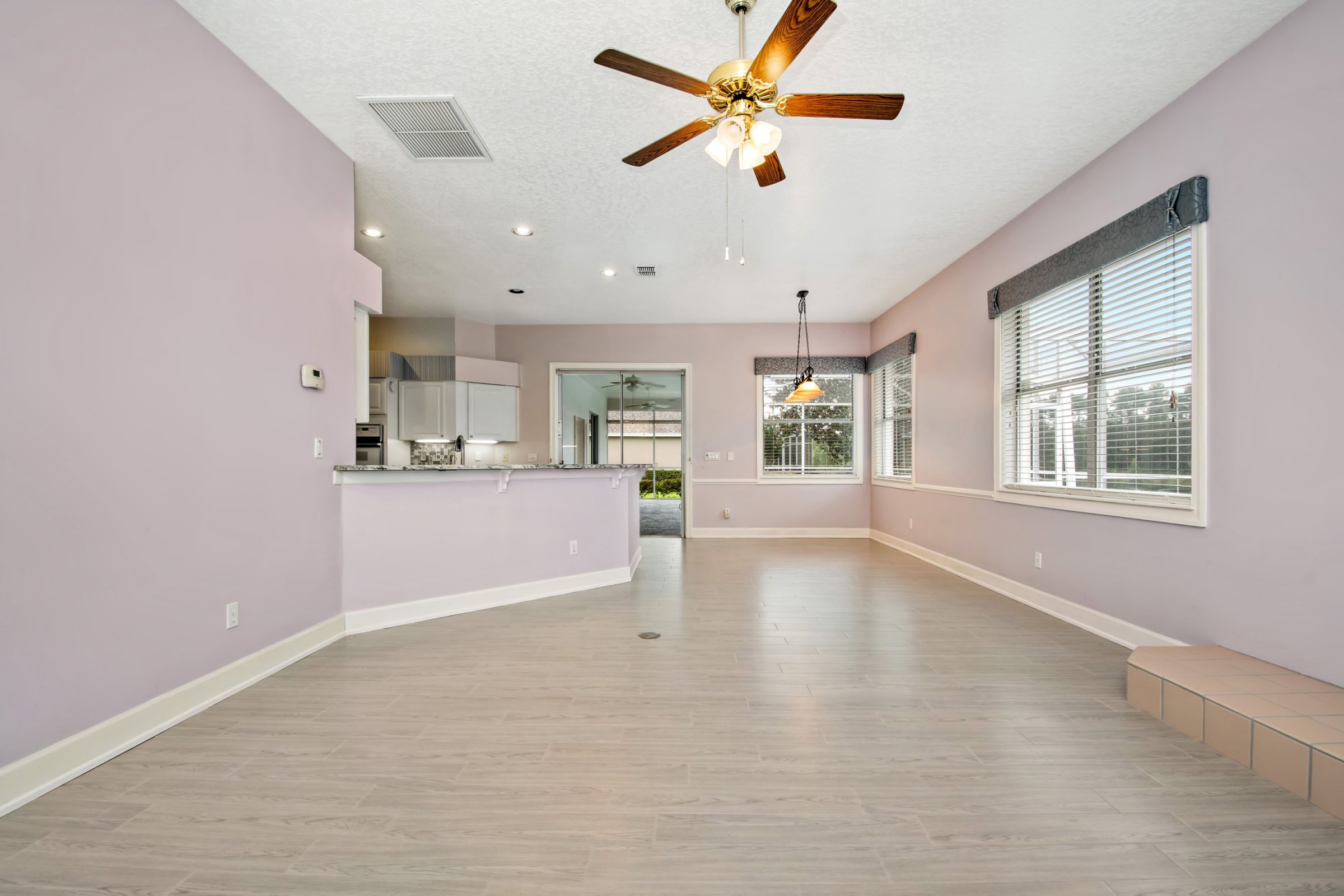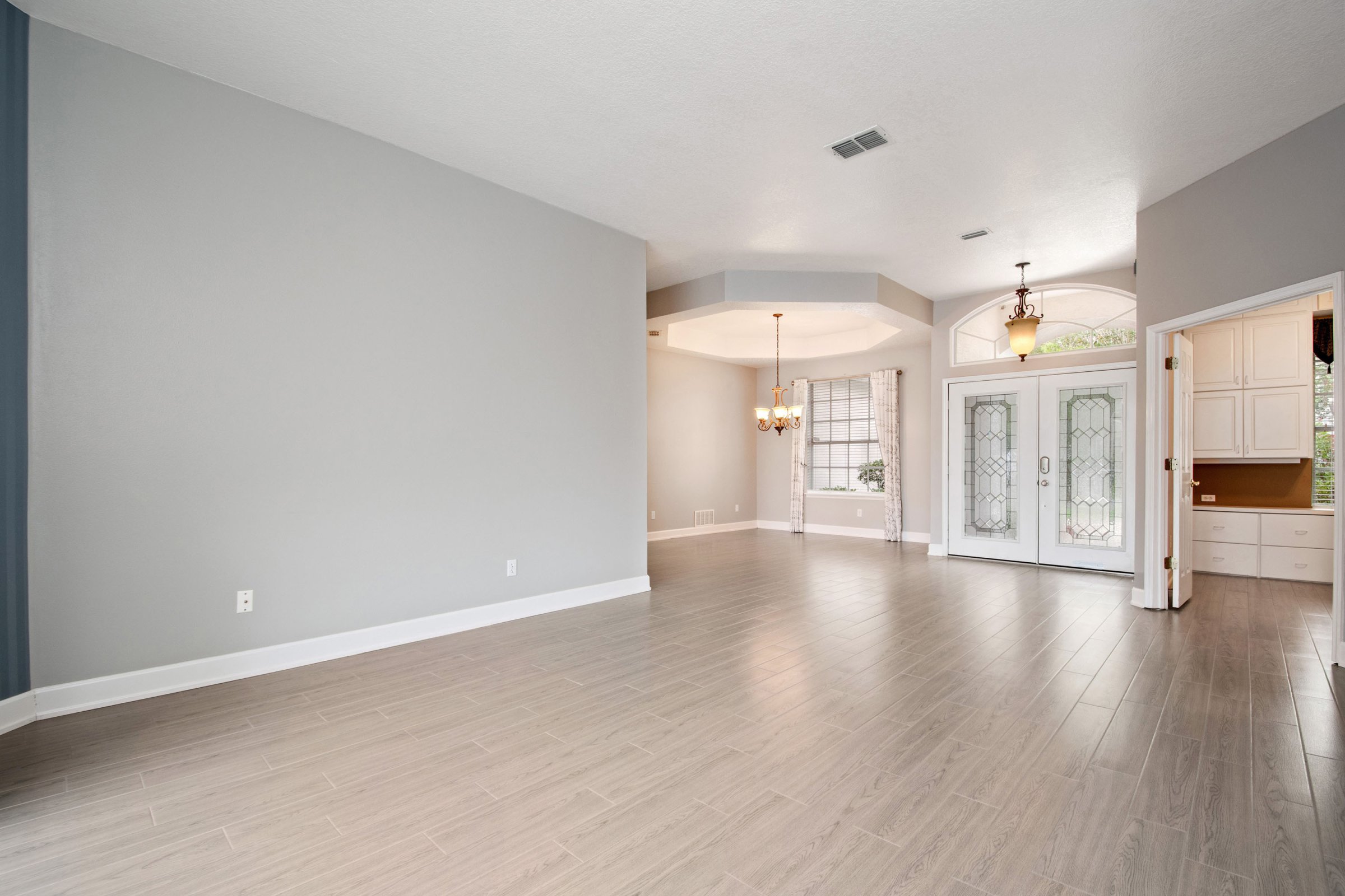 As you step through the front door, you enter the formal living and dining areas that create an inviting first impression. Straight ahead, the formal living room features sliding glass doors that open to the patio and showcase serene backyard and conservation views. Additionally, the master suite sits privately off this space, along with an office that easily functions as a nursery or fourth bedroom, plus a full bathroom. To the right, the formal dining room stands out with tray ceilings, an upgraded chandelier, and a large front-facing window. Furthermore, a hallway off the dining room leads directly to the laundry room, two secondary bedrooms, and another full bathroom, creating a practical and efficient layout.
