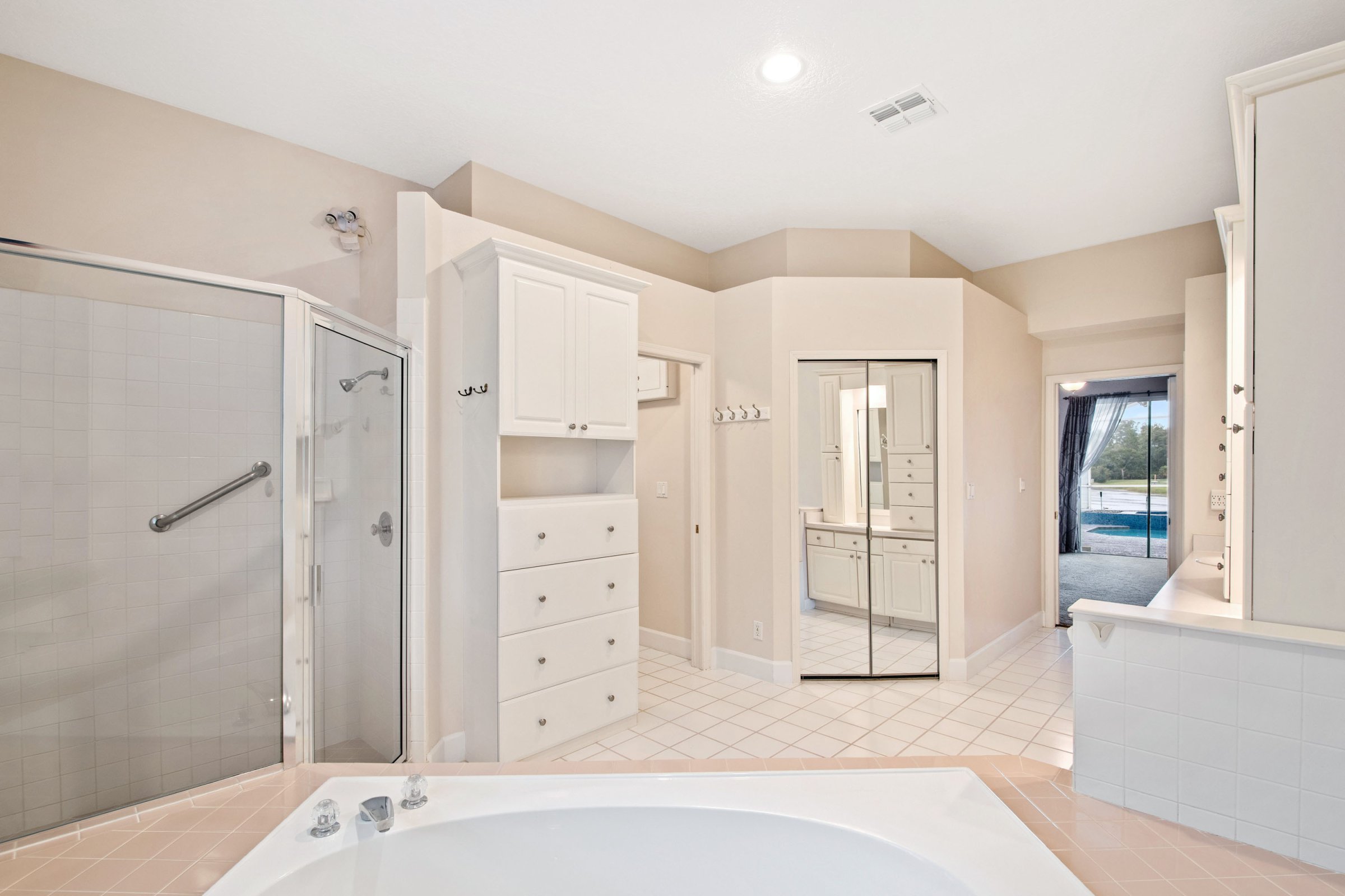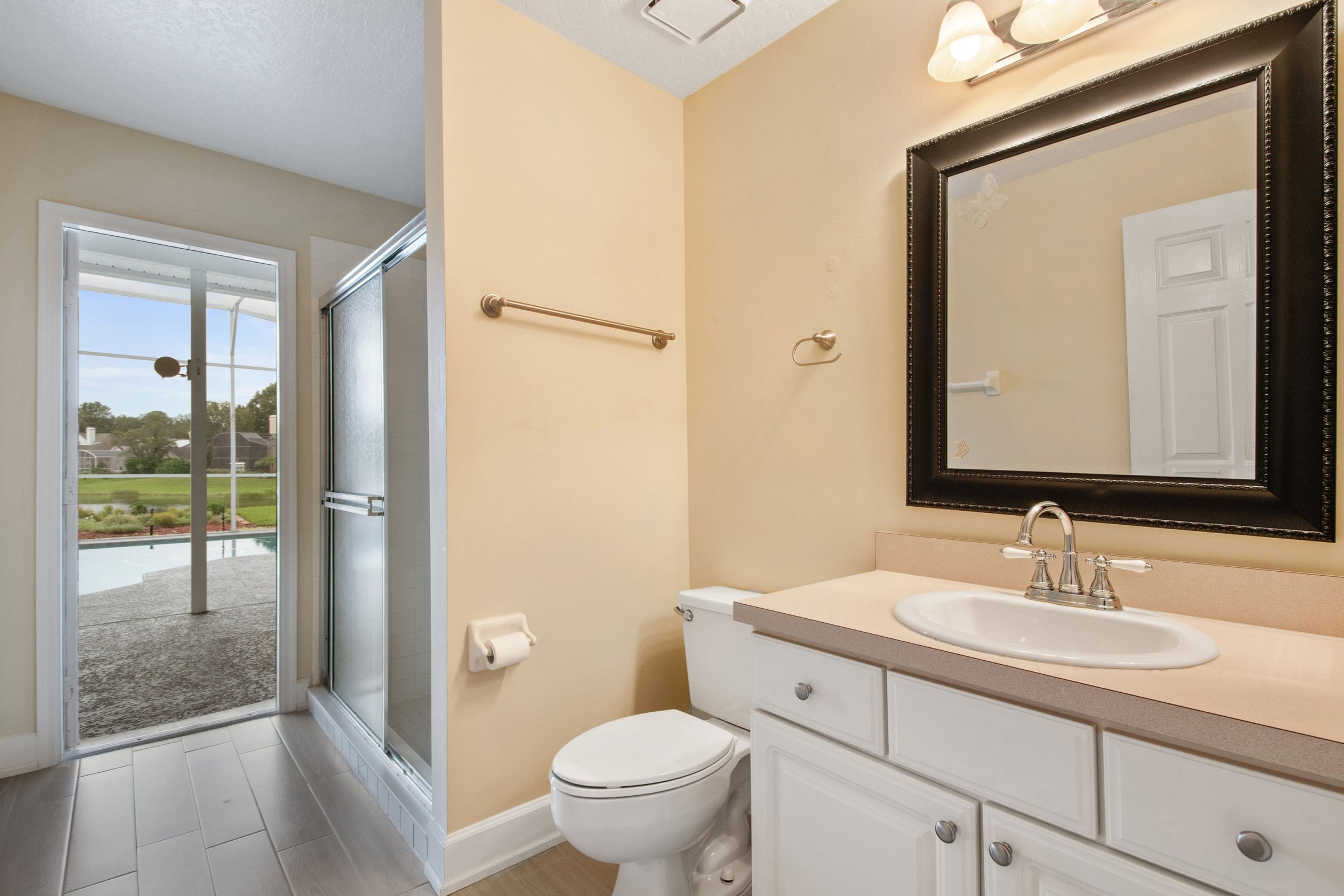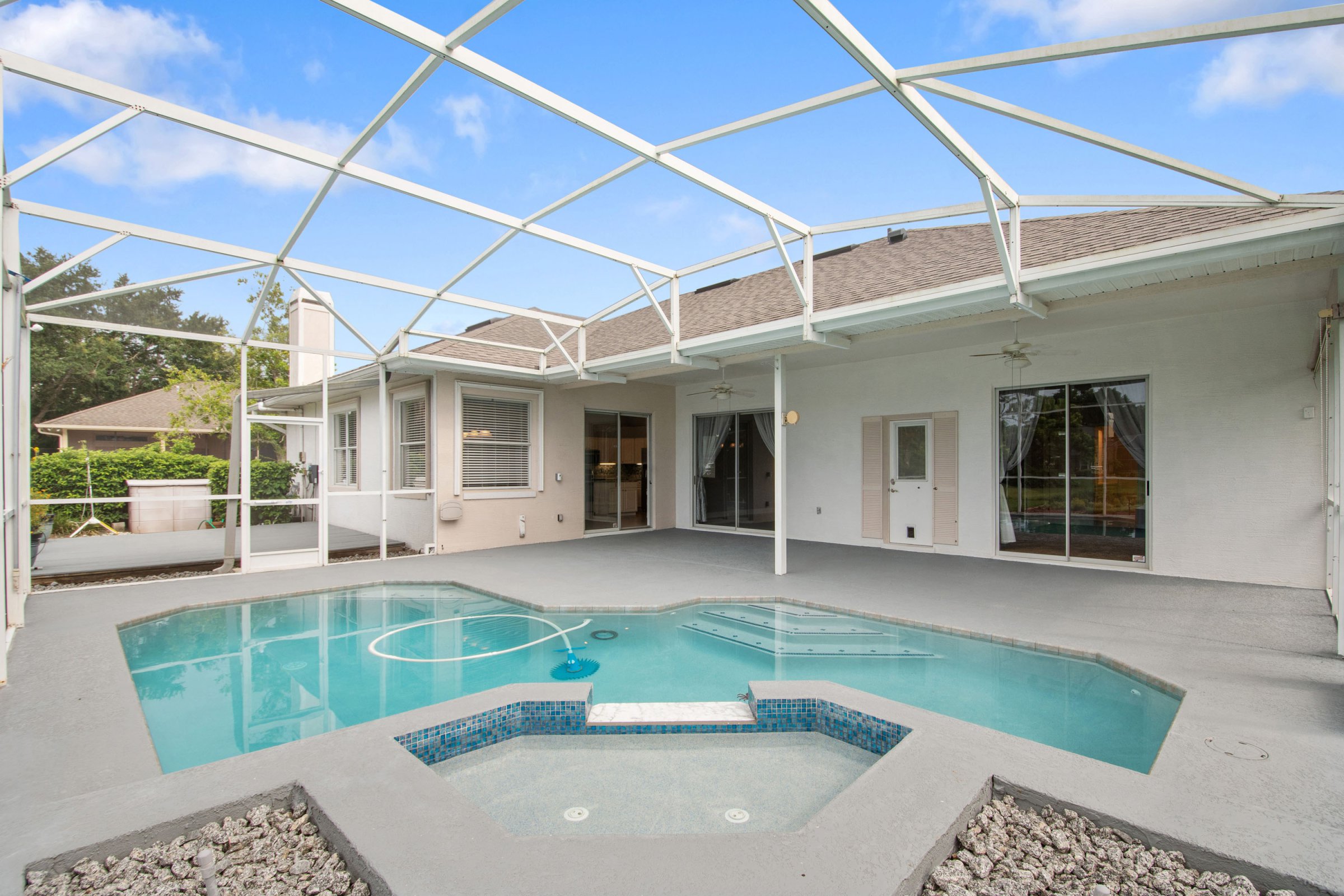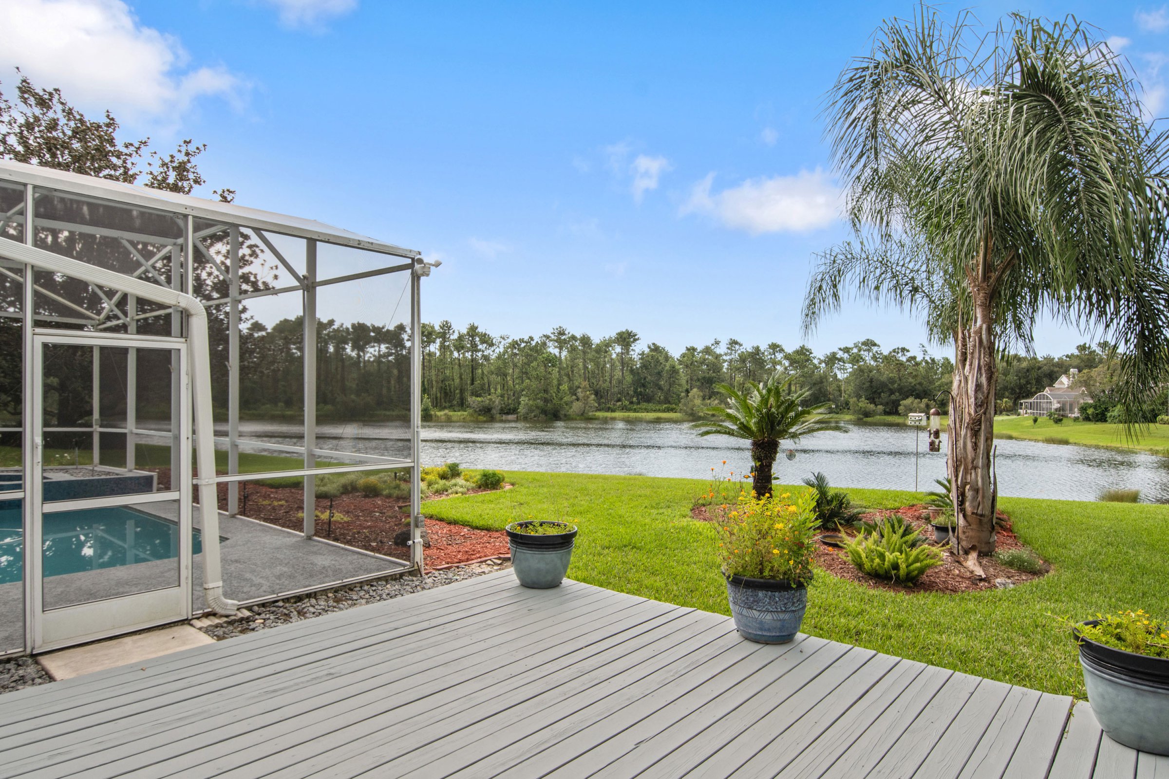 Equally impressive, the outdoor living space at 3284 Lordmall Ct invites both entertaining and relaxation. The expansive pool deck features a large covered patio with two ceiling fans that keep the space cool year-round. A screened enclosure surrounds the sparkling pool with decorative tile details and a relaxing spa. Beyond the enclosure, the pond and conservation views create a serene and private atmosphere. Additionally, a separate deck just outside the screen enclosure provides the perfect spot for barbecuing and outdoor gatherings. Altogether, this backyard feels like a private retreat.