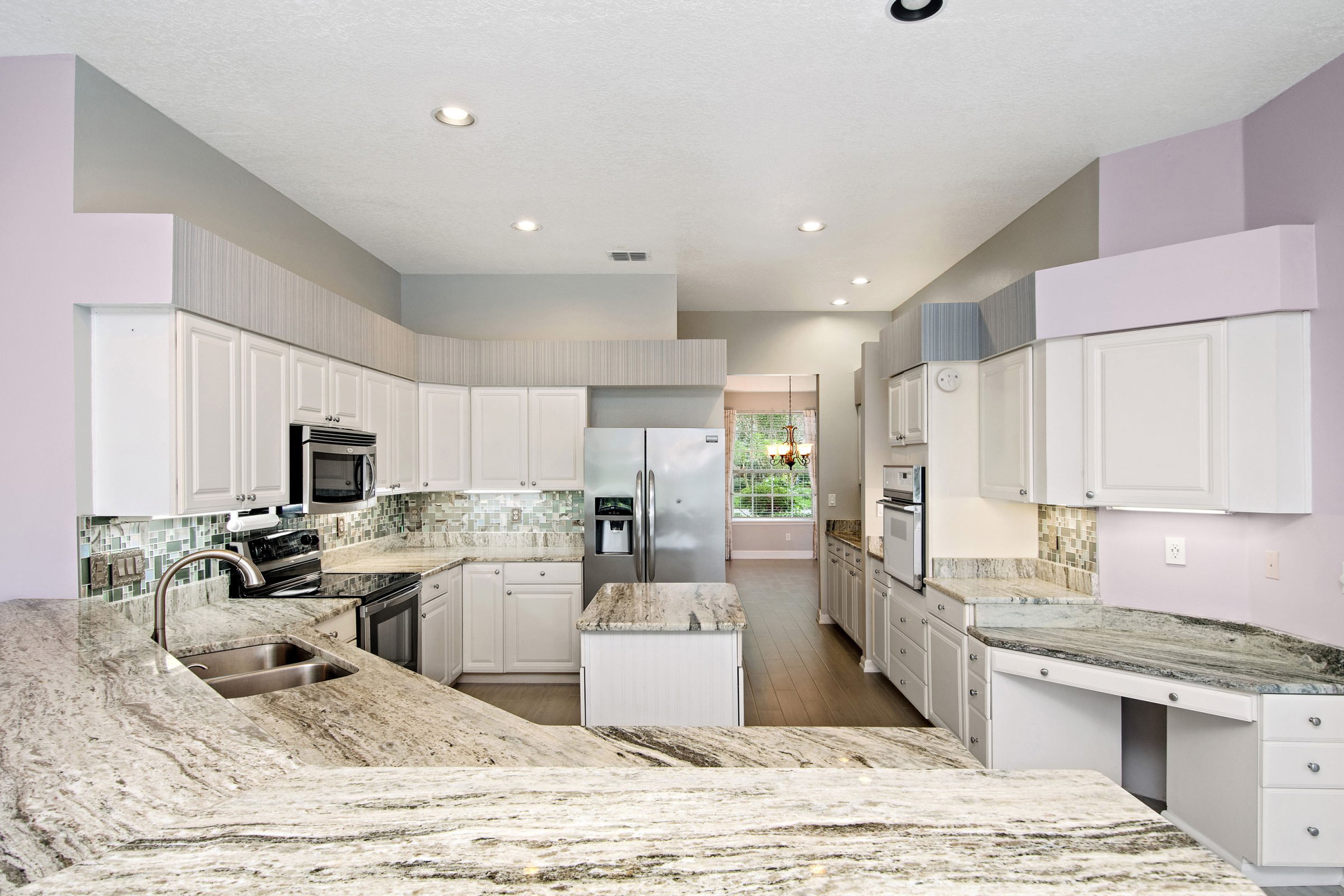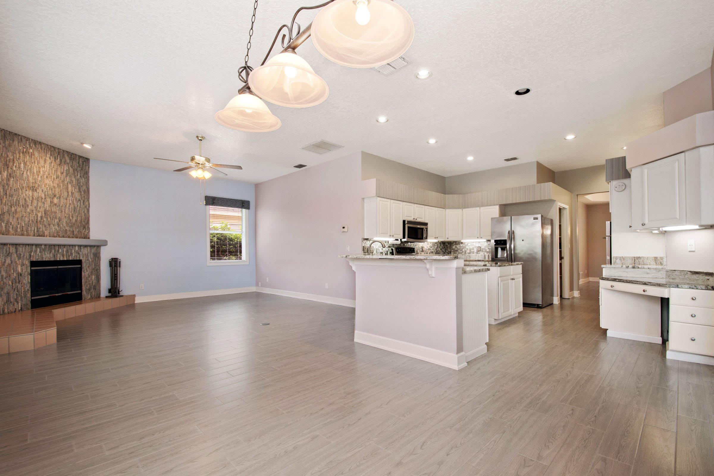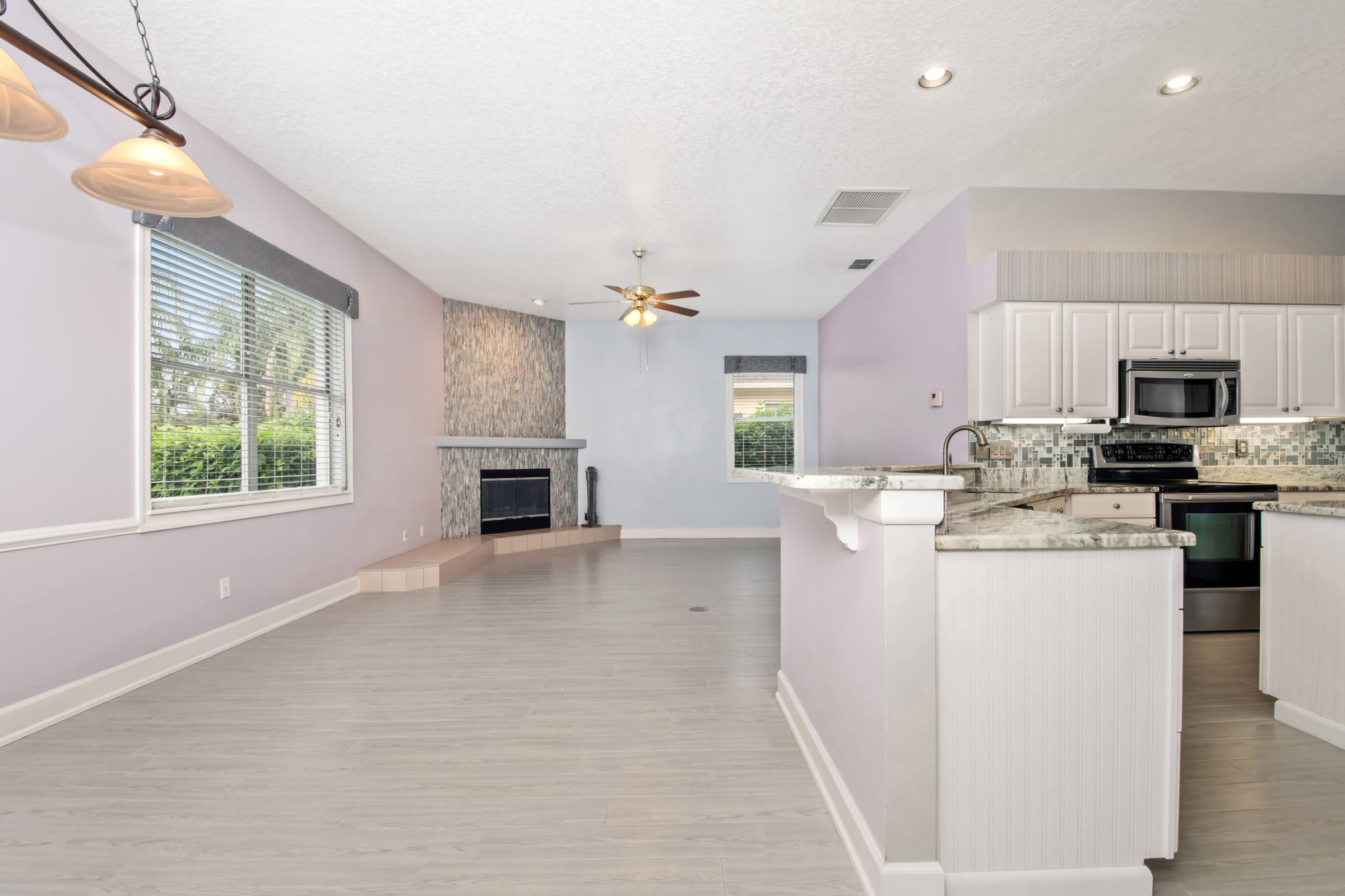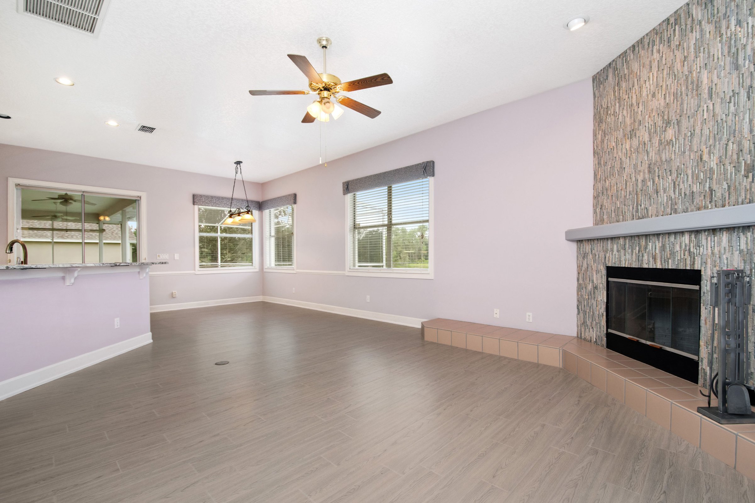 Across from the dining room, the fully upgraded kitchen truly serves as the heart of the home. It showcases granite countertops, a glass tile backsplash, stainless steel appliances, and new tile flooring that flows throughout the living areas. In addition, the kitchen includes an island, abundant counter space, a built-in desk, a closet pantry, and a spacious breakfast bar overlooking both the dinette and family room. The family room offers generous space and highlights a striking stack-stone fireplace. Meanwhile, large windows frame beautiful views of the pool, pond, and conservation area beyond.