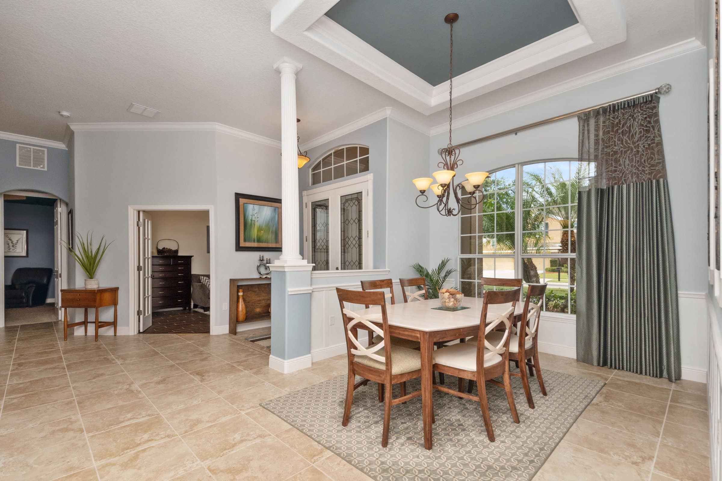 Stepping into 332 Skyview Pl, you walk through large double glass doors into a bright open floor plan. Right away, 12-foot ceilings with crown molding and neutral tile flooring set a warm and elegant tone. Further ahead, the formal living room provides convenient access to the patio. Meanwhile, the right side leads to the master suite and a nearby secondary bedroom that works well as an office or nursery.