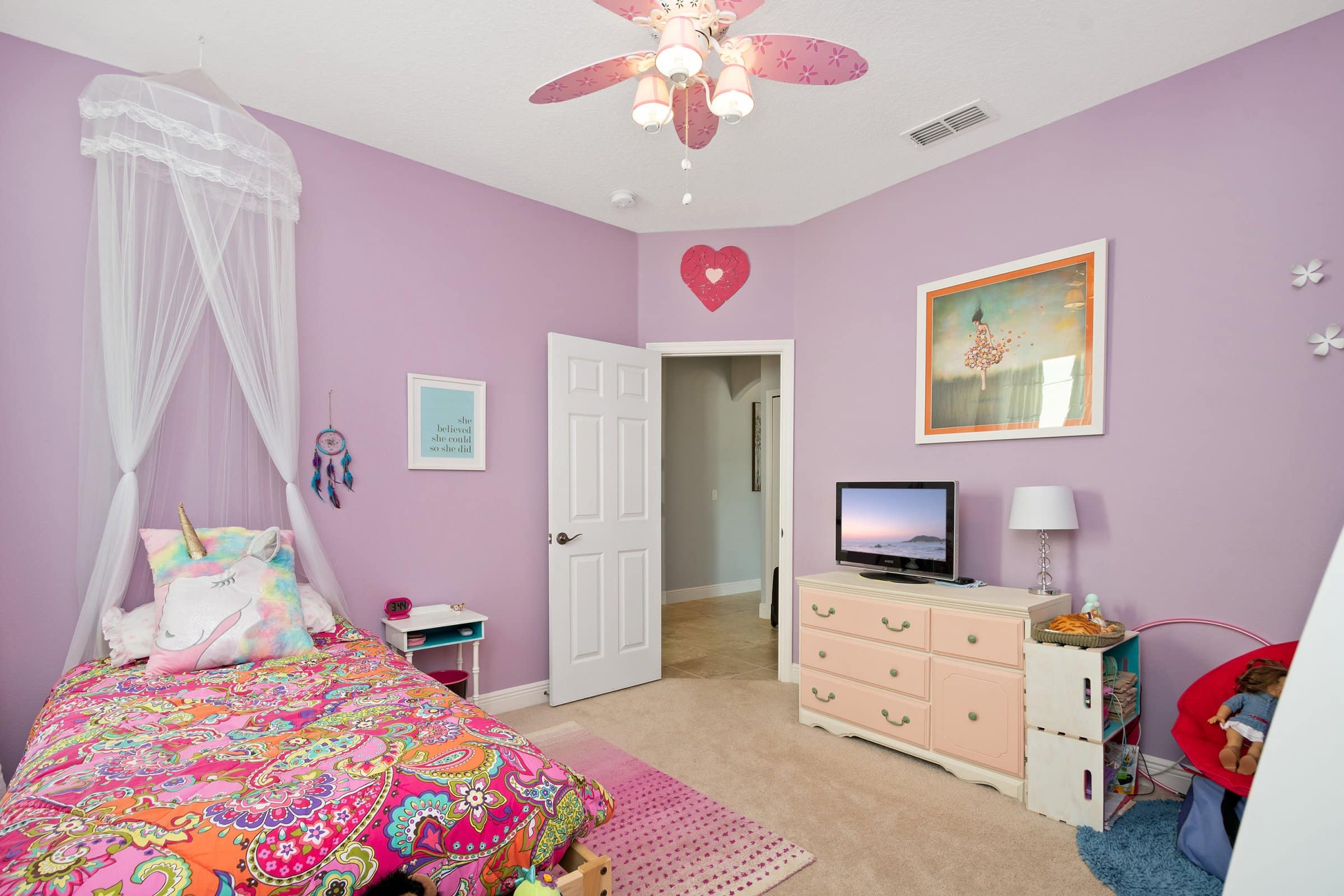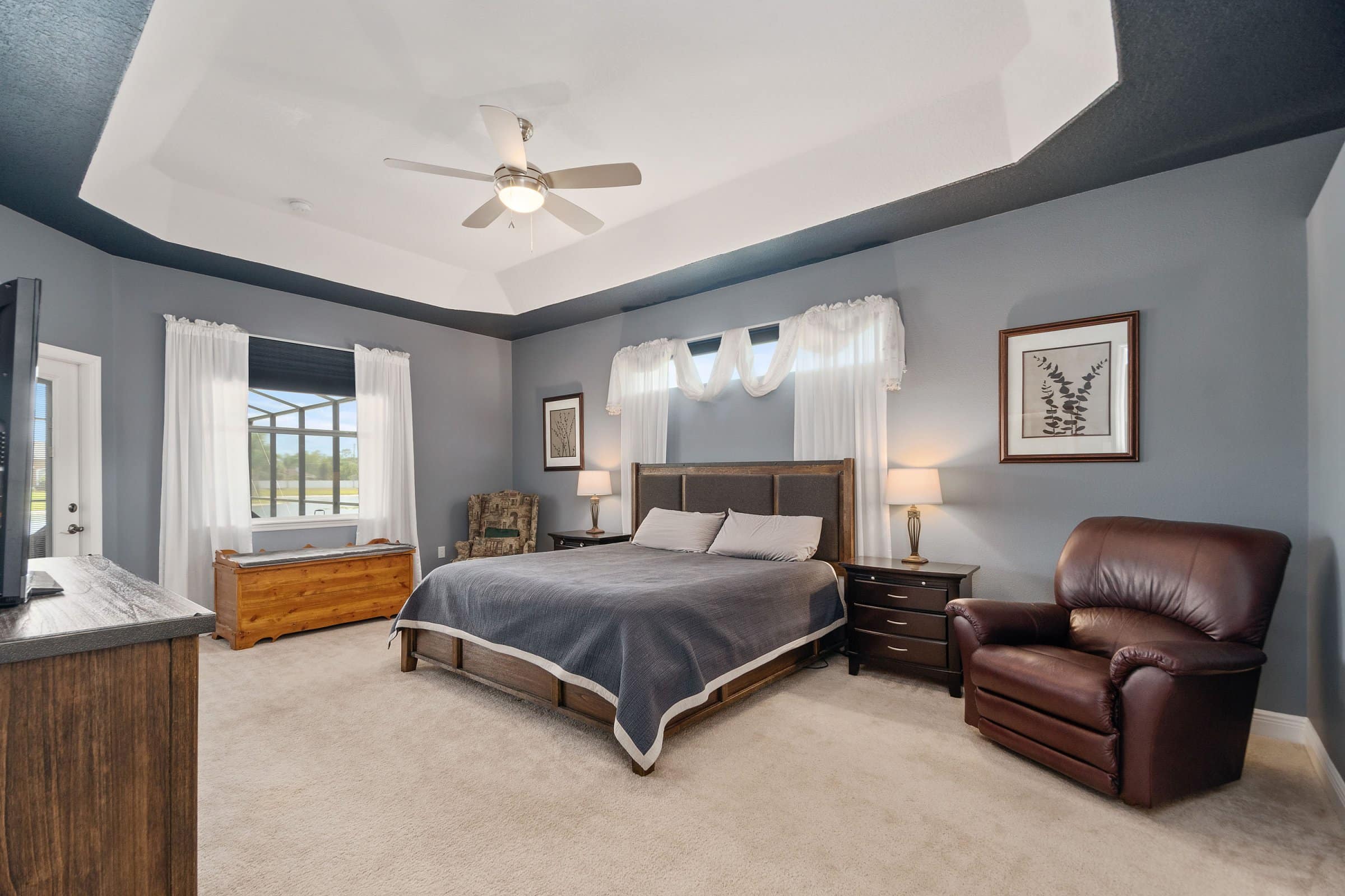 To the left of the foyer at 332 Skyview Pl, you’ll find the formal dining room with a detailed ceiling design. From there, the hallway leads to two secondary bedrooms, a full bathroom, and the laundry room. As a result, the home offers a practical and comfortable layout for everyday living.