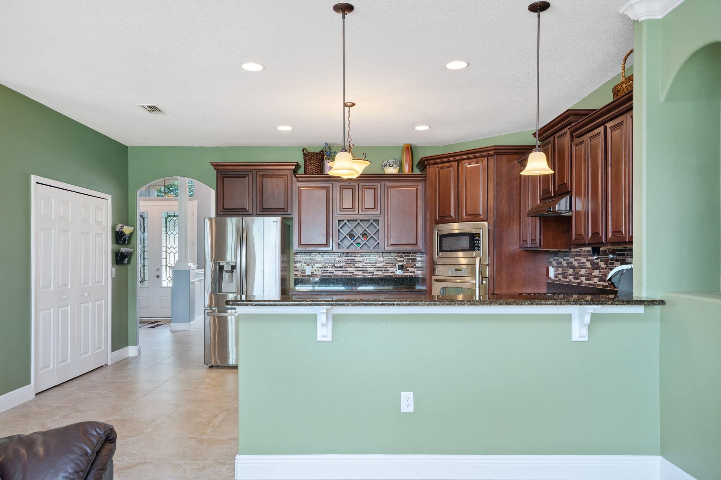 Moving through the arched entryway into the kitchen and family room, 332 Skyview Pl showcases solid wood 45-inch cabinetry and granite countertops. The kitchen includes an island, a breakfast bar, and stainless steel appliances. Nearby, the dinette sits comfortably at the center of the space. Additionally, the area opens into a spacious family room ideal for entertaining. At the back left, you’ll find a private bedroom and a secondary bathroom perfect for guests.
