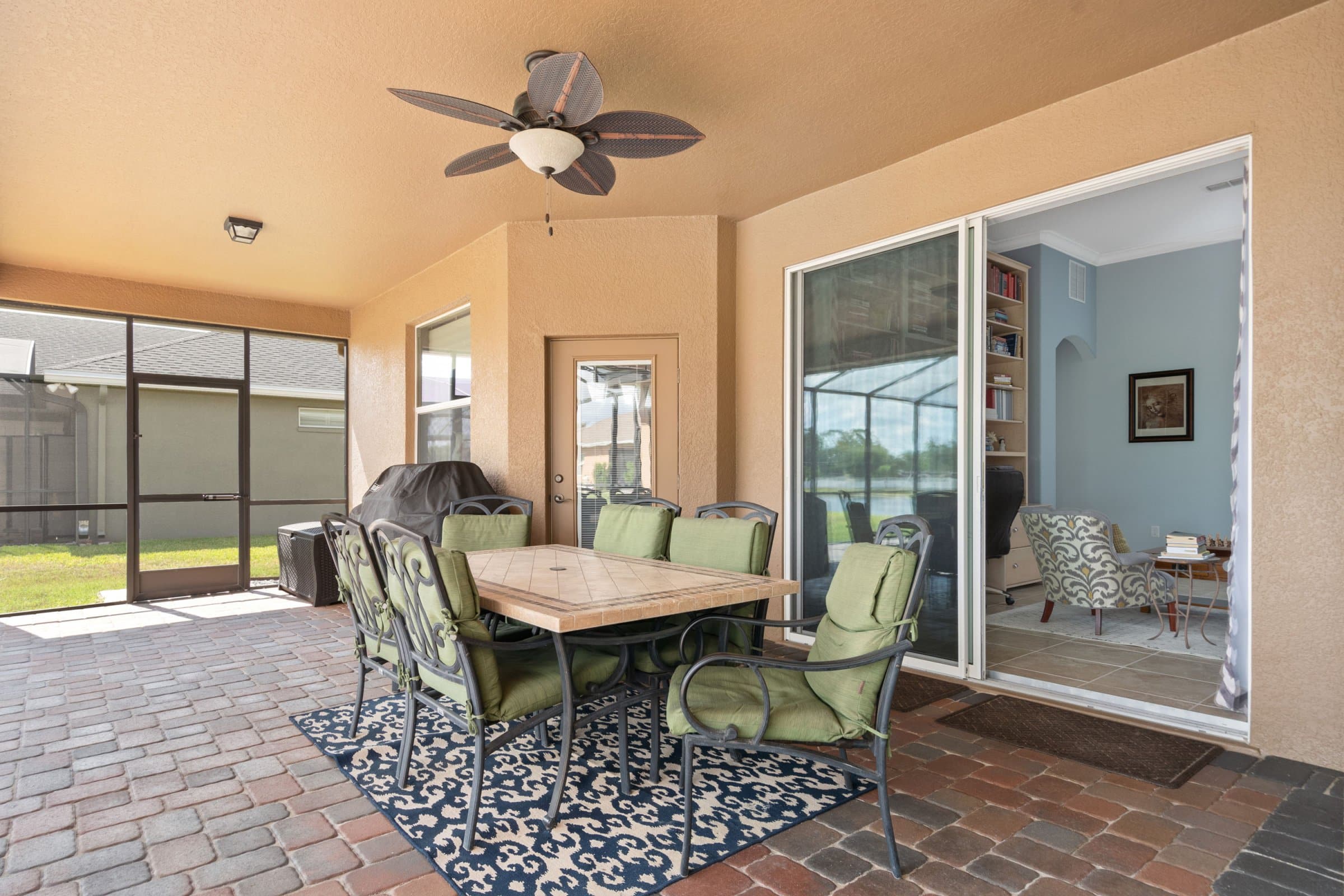 Stepping out the sliding glass doors, 332 Skyview Pl offers a large screened-in patio with a covered area for shade. This outdoor space is perfect for relaxing, grilling, or enjoying Florida evenings. Beyond the enclosure, an extended paver patio adds even more room for activities. Moreover, the pond view provides a peaceful and calming backdrop.