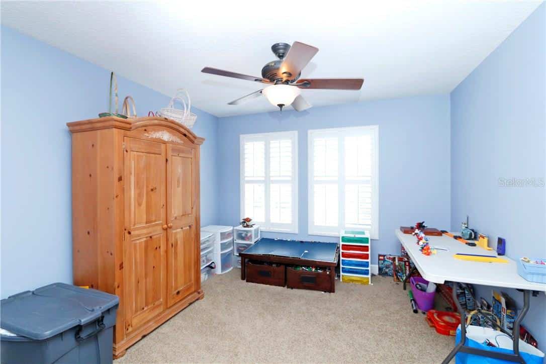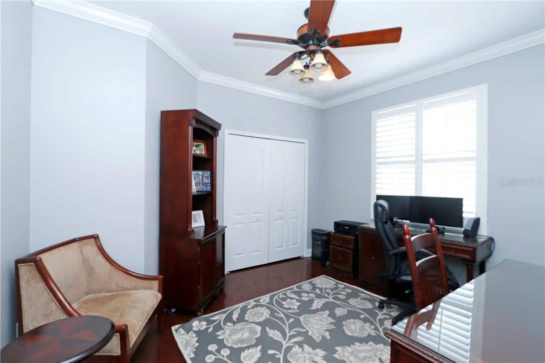 Inside 3470 Diamond Leaf Ln, a spacious foyer opens into split formal living and dining rooms. Beautiful wood flooring flows throughout these spaces. Furthermore, the kitchen is perfect for entertaining with stone countertops, crown molding, a large bar, and an oversized eat-in area. It overlooks the family room, and glass doors lead directly to the patio. Meanwhile, the master bedroom sits on the ground floor for easy access and privacy. A fifth guest room is located on the opposite side of the home, offering excellent separation. It is adjacent to a full third bath and provides a private exit to the patio. Upstairs, three additional bedrooms offer generous storage, and an open loft serves as an ideal office or playroom. Altogether, the upgraded features, including plantation shutters, contribute to a polished and functional layout.