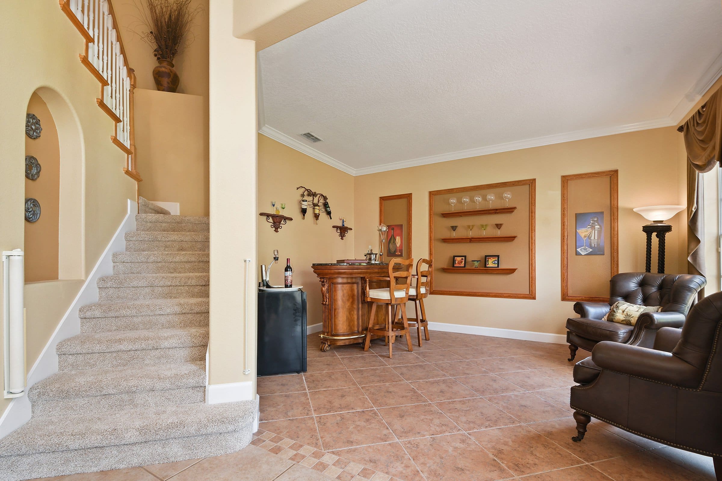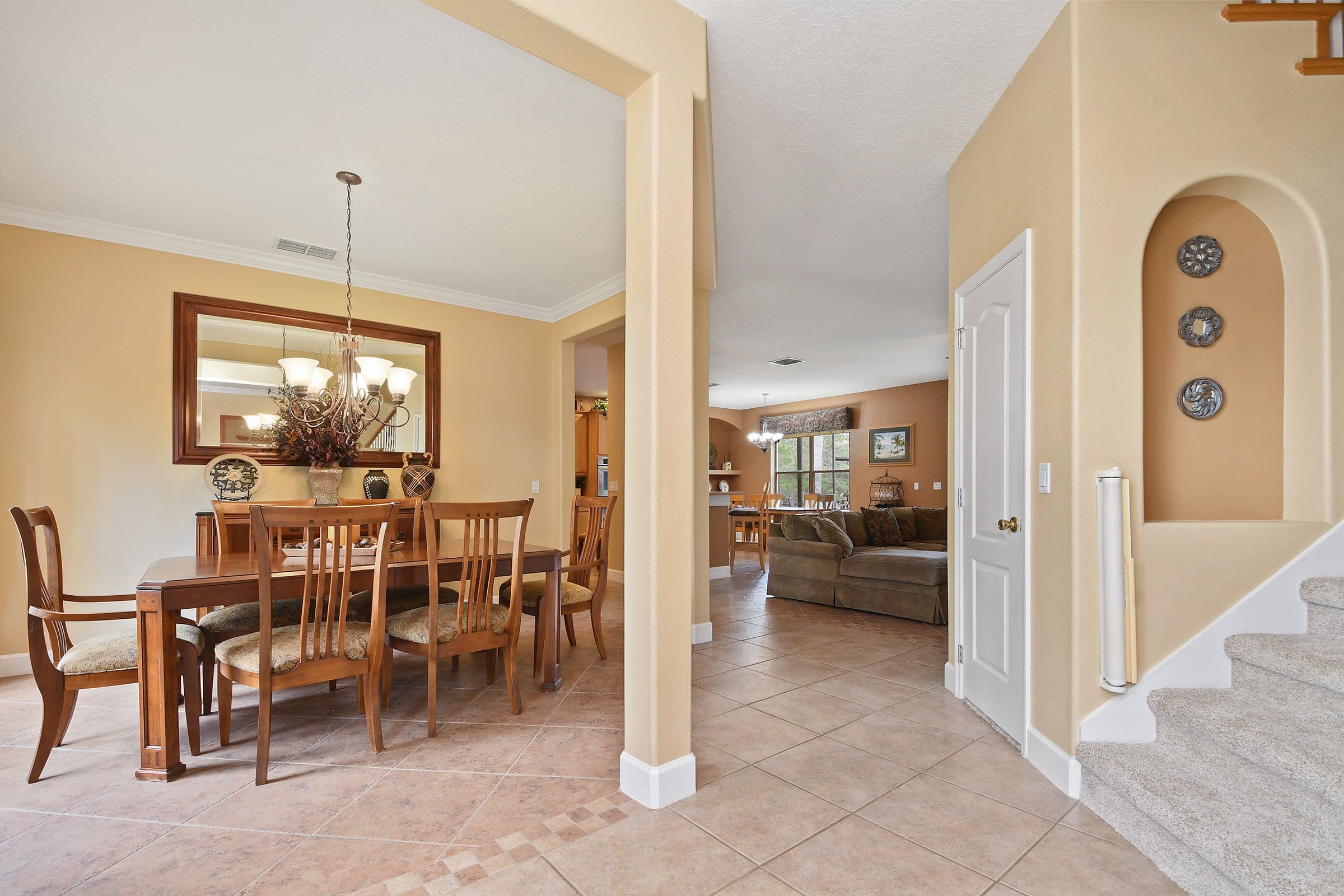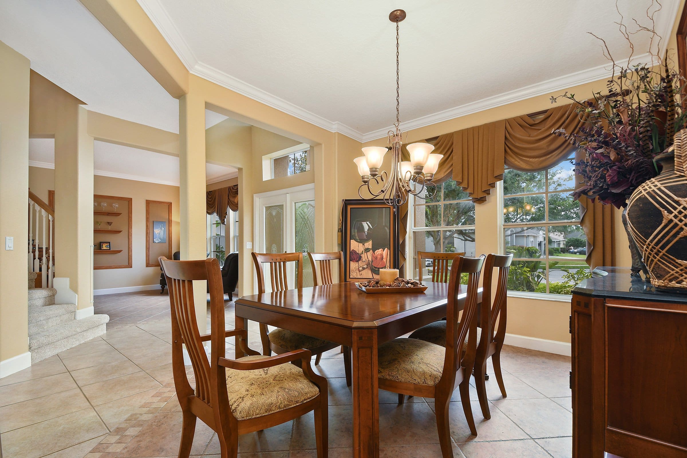 As you walk through the front door of 3535 Wading Heron Ter, a grand stairwell welcomes you straight ahead. On either side, the formal living and dining rooms create a balanced and elegant layout. The living room sits to the right, while the dining room rests to the left. A decorative tile border defines both spaces beautifully. Moreover, crown molding adds a refined finishing touch. Throughout the home, neutral paint tones and cohesive flooring enhance the bright, airy feel. In addition, brand-new carpet refreshes the second floor and the primary suite.
