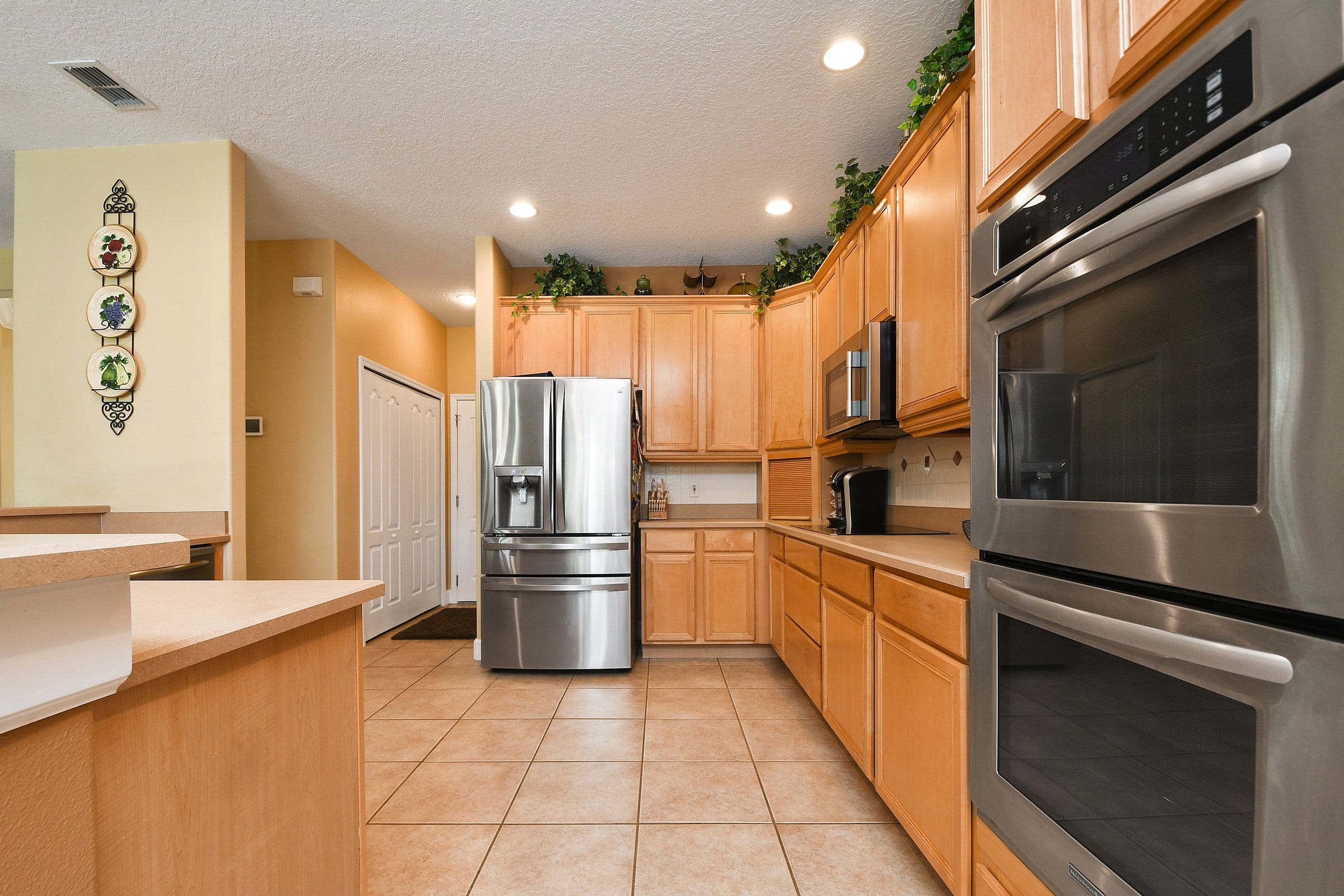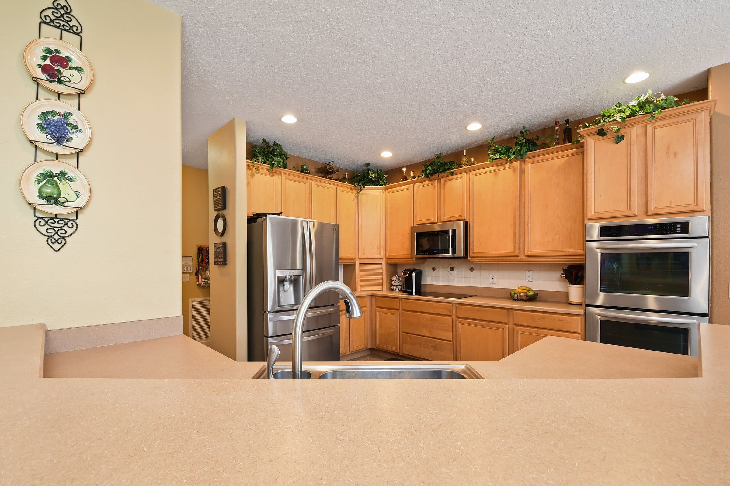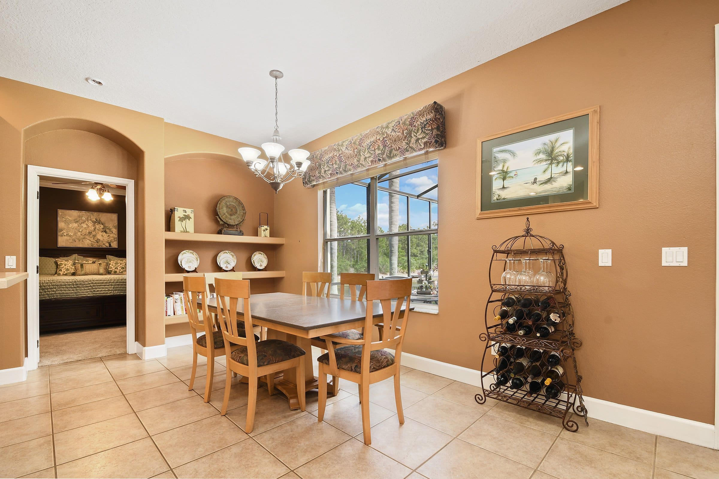 Across from the dining room, the spacious family room offers comfort and functionality here at 3535 Wading Heron Ter. Built-in shelving, an upgraded ceiling fan, and double doors lead directly to the patio. Just off this space, a bedroom and full bathroom provide an ideal guest retreat. Nearby, the kitchen serves as the heart of the home. It features expansive countertops, a large breakfast bar, and stainless steel appliances with a double oven. Furthermore, the built-in range, tile backsplash, and large closet pantry enhance both style and storage. The adjoining dinette overlooks the pool and conservation, creating a relaxing spot for daily meals.