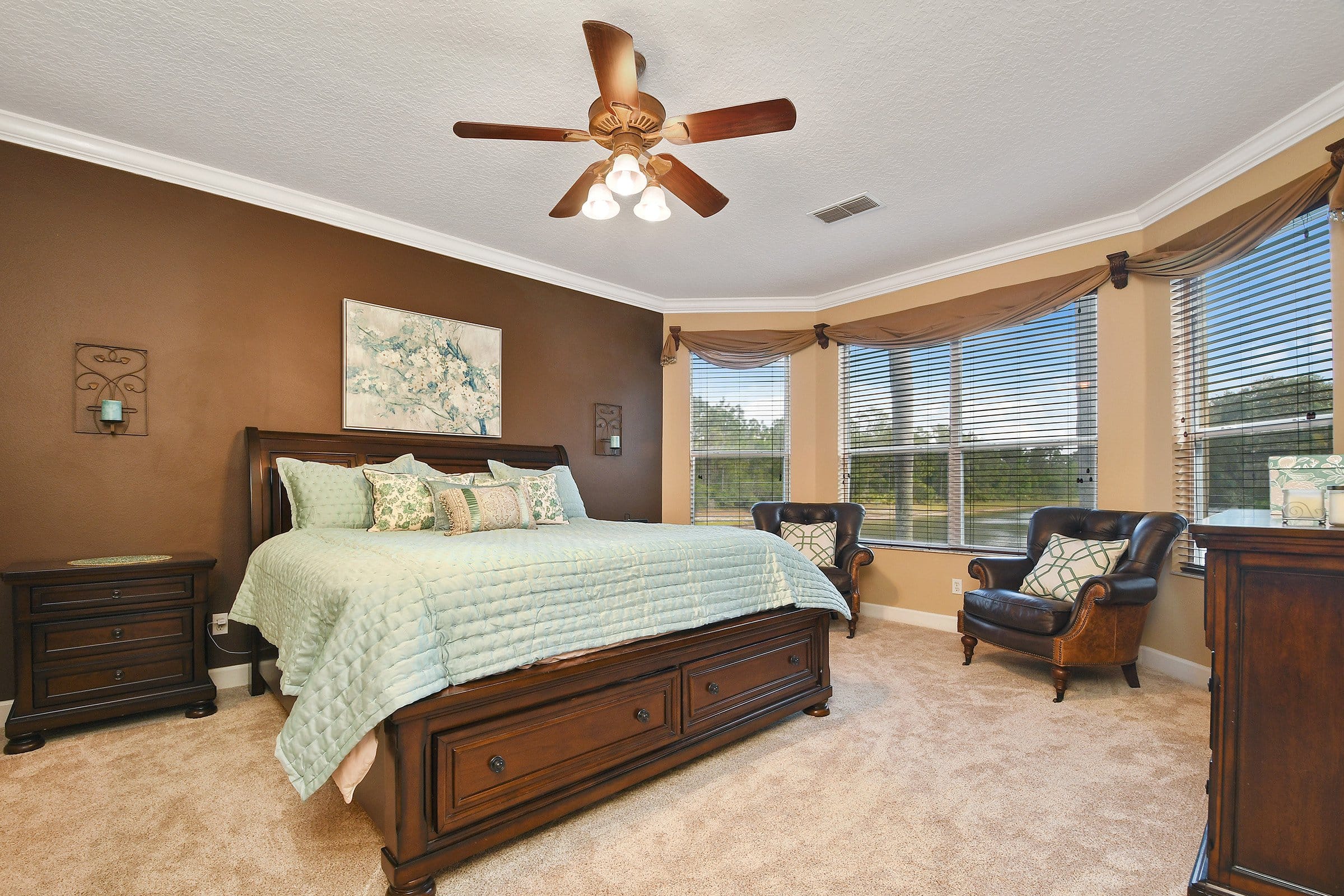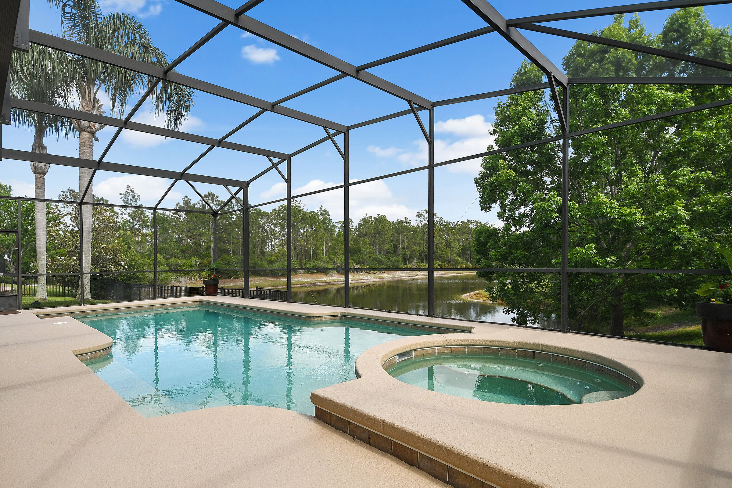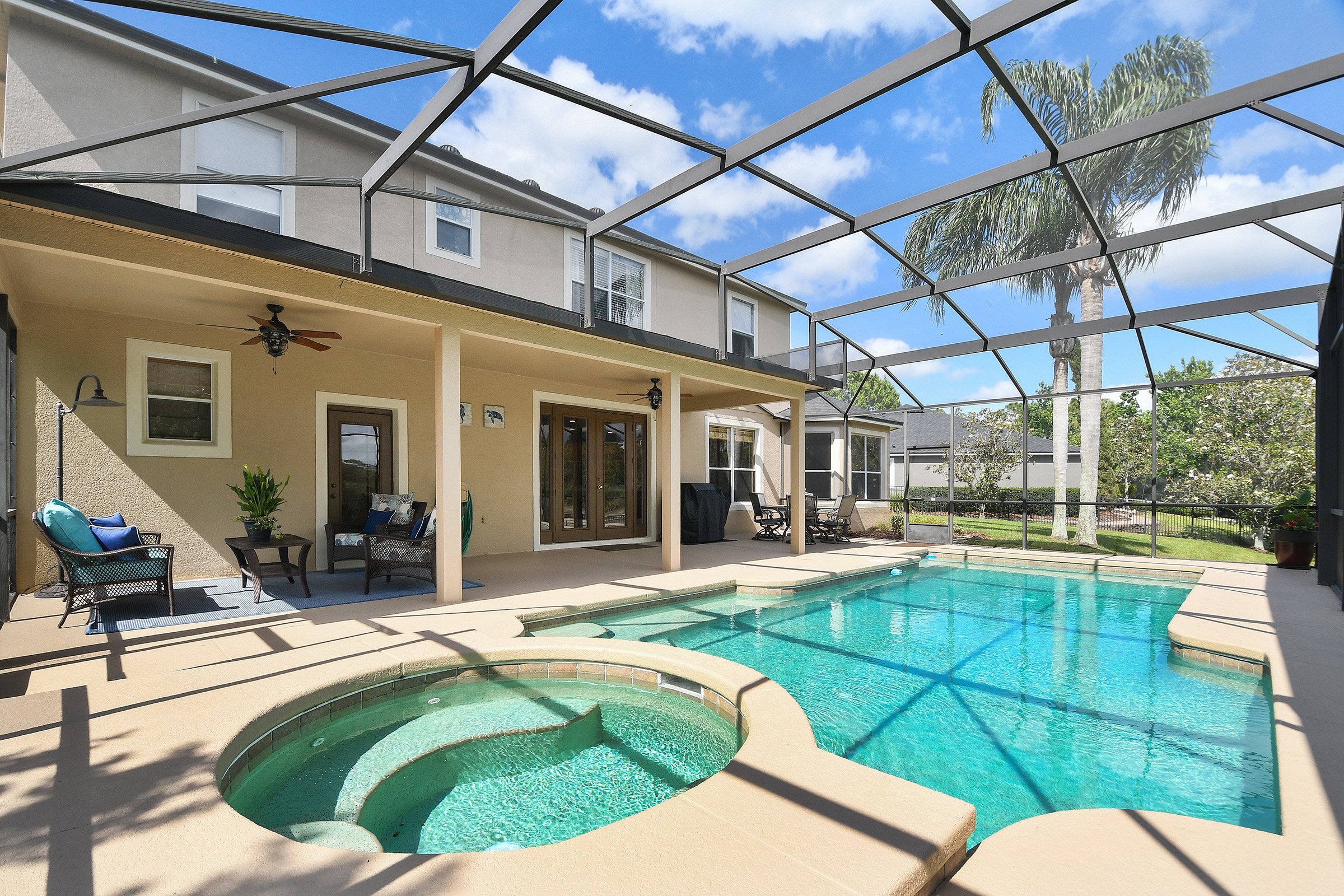 Conveniently located off the kitchen of 3535 Wading Heron Ter, the primary suite offers privacy and comfort. Double doors open directly onto the pool deck, blending indoor and outdoor living. Outside, a spacious covered patio includes two new ceiling fans to keep you cool year-round. Beyond the patio, the large private pool invites hours of fun in the Florida sunshine. Additionally, a full-screen enclosure surrounds the pool and patio area. As a result, you can enjoy uninterrupted views of the pond and conservation while relaxing in a serene setting.