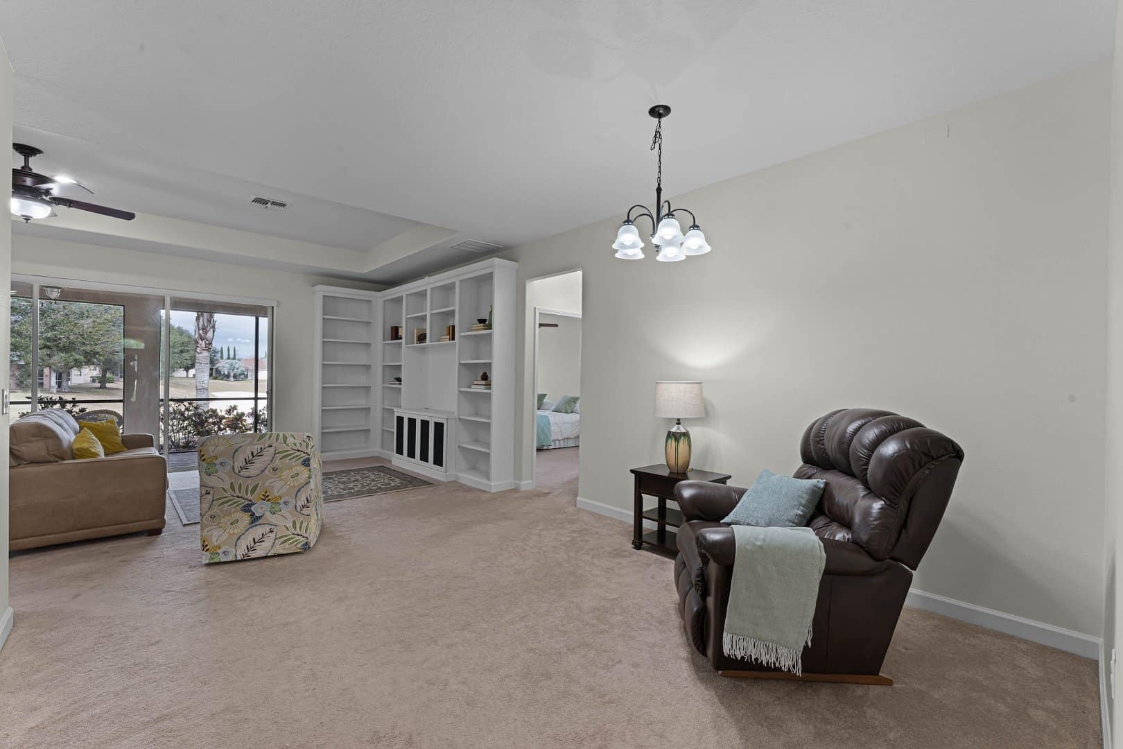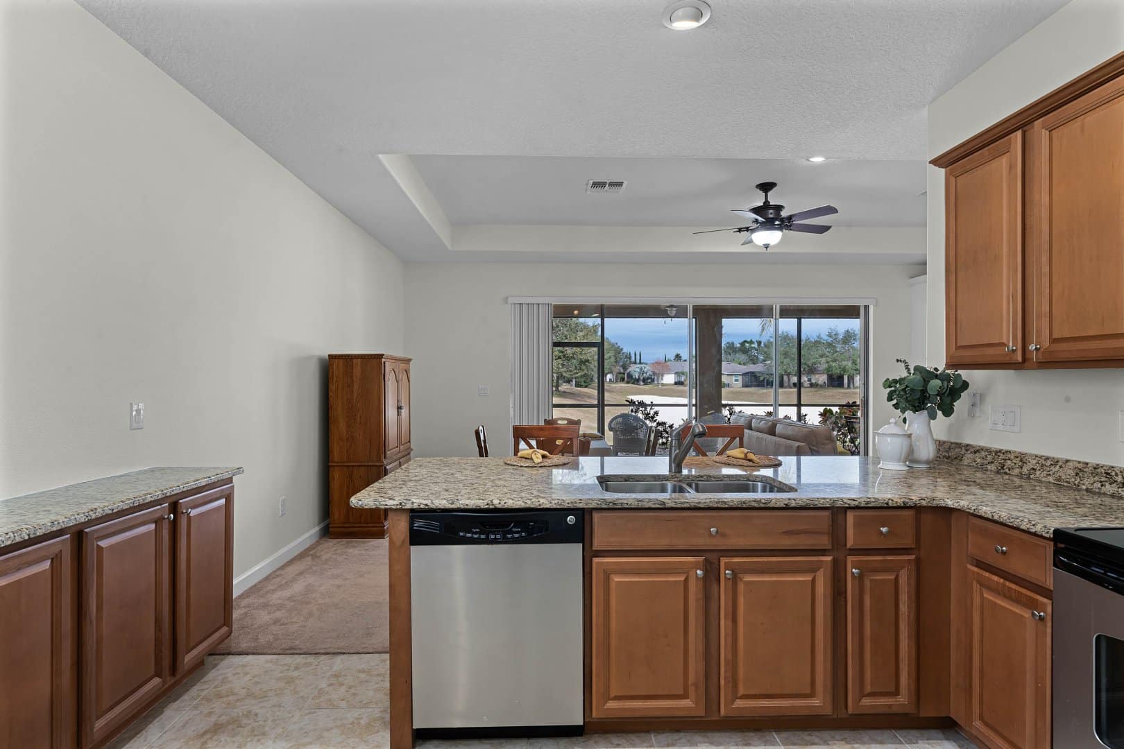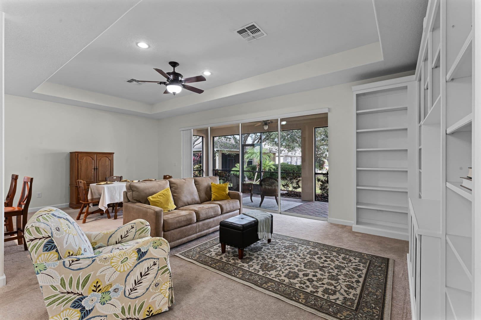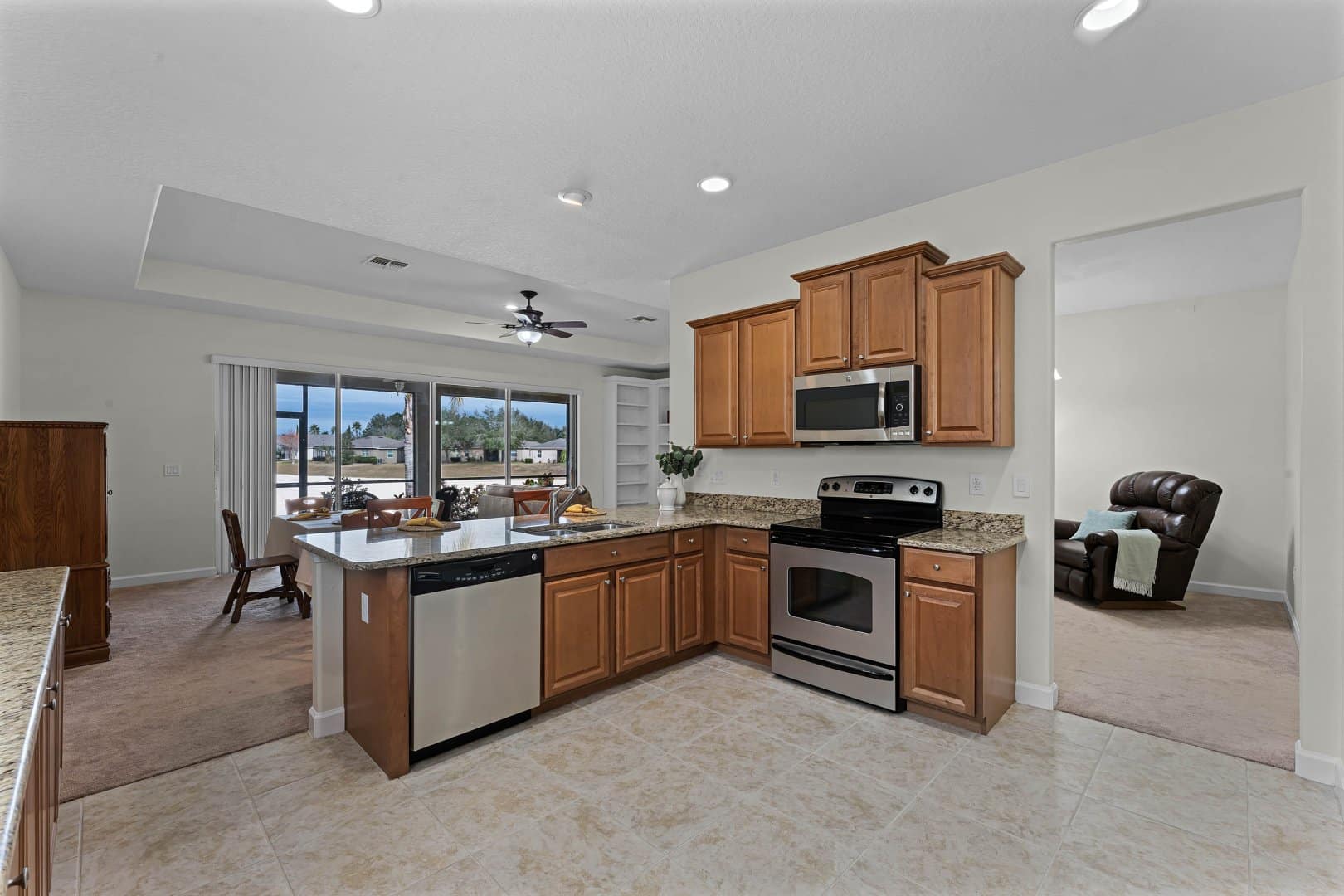 The expansive great room at 3667 Caladesi Rd seamlessly integrates living, dining, and kitchen spaces. Large sliding doors open to a covered patio, encouraging indoor-outdoor living—a must-have feature in Heritage Hills’ active adult community. Whether hosting family or enjoying quiet evenings, this layout enhances your lifestyle.