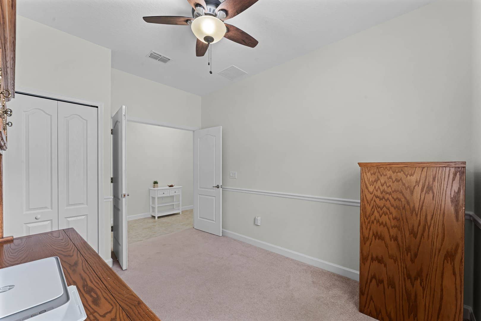 This home features a spacious foyer leading to two sizable secondary bedrooms, both equipped with ceiling fans and ample closet space. The nearby full bathroom offers a tub/shower combo and an extended vanity. A conveniently located laundry room adds to the functionality of this well-designed layout—ideal for comfortable 55+ living.