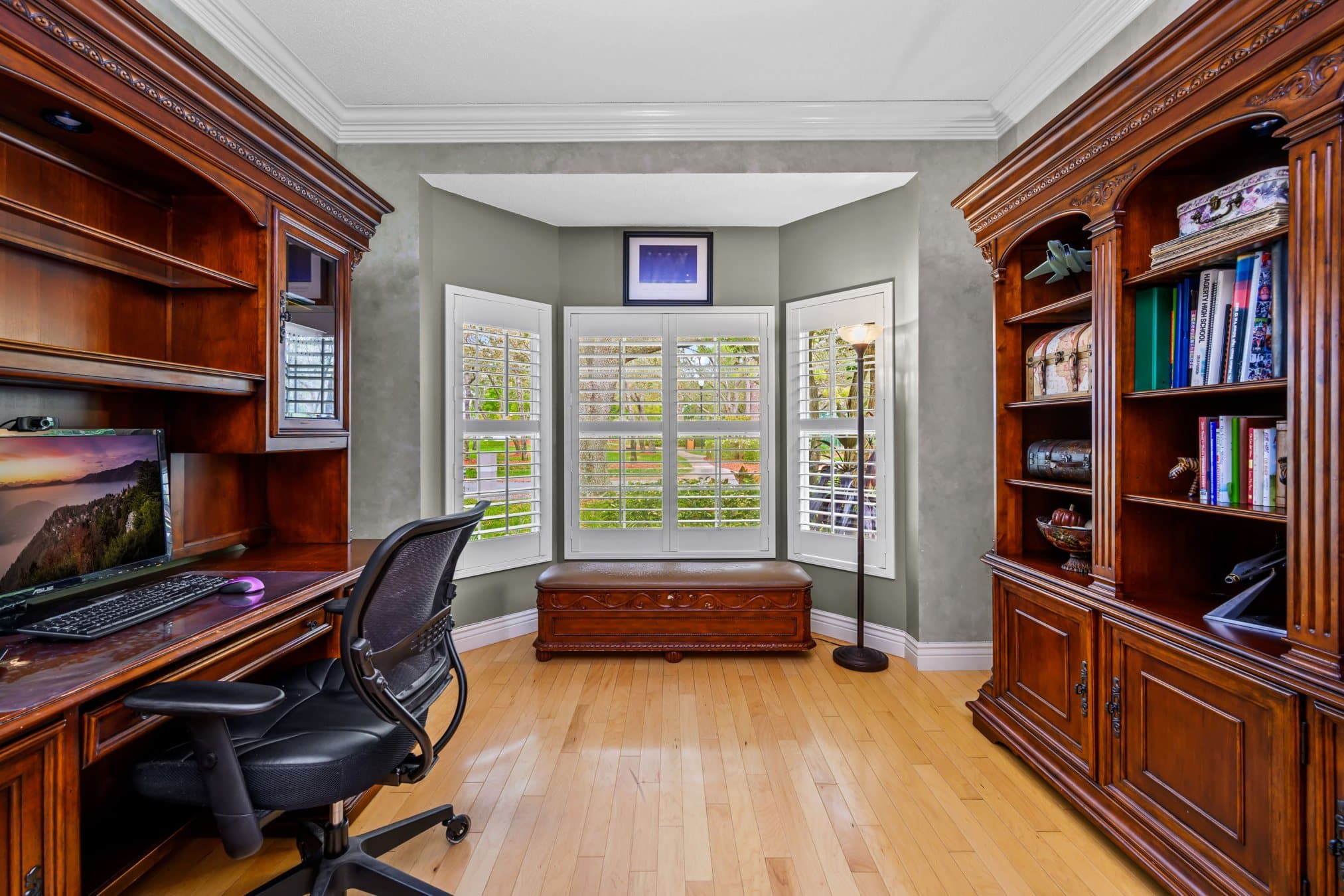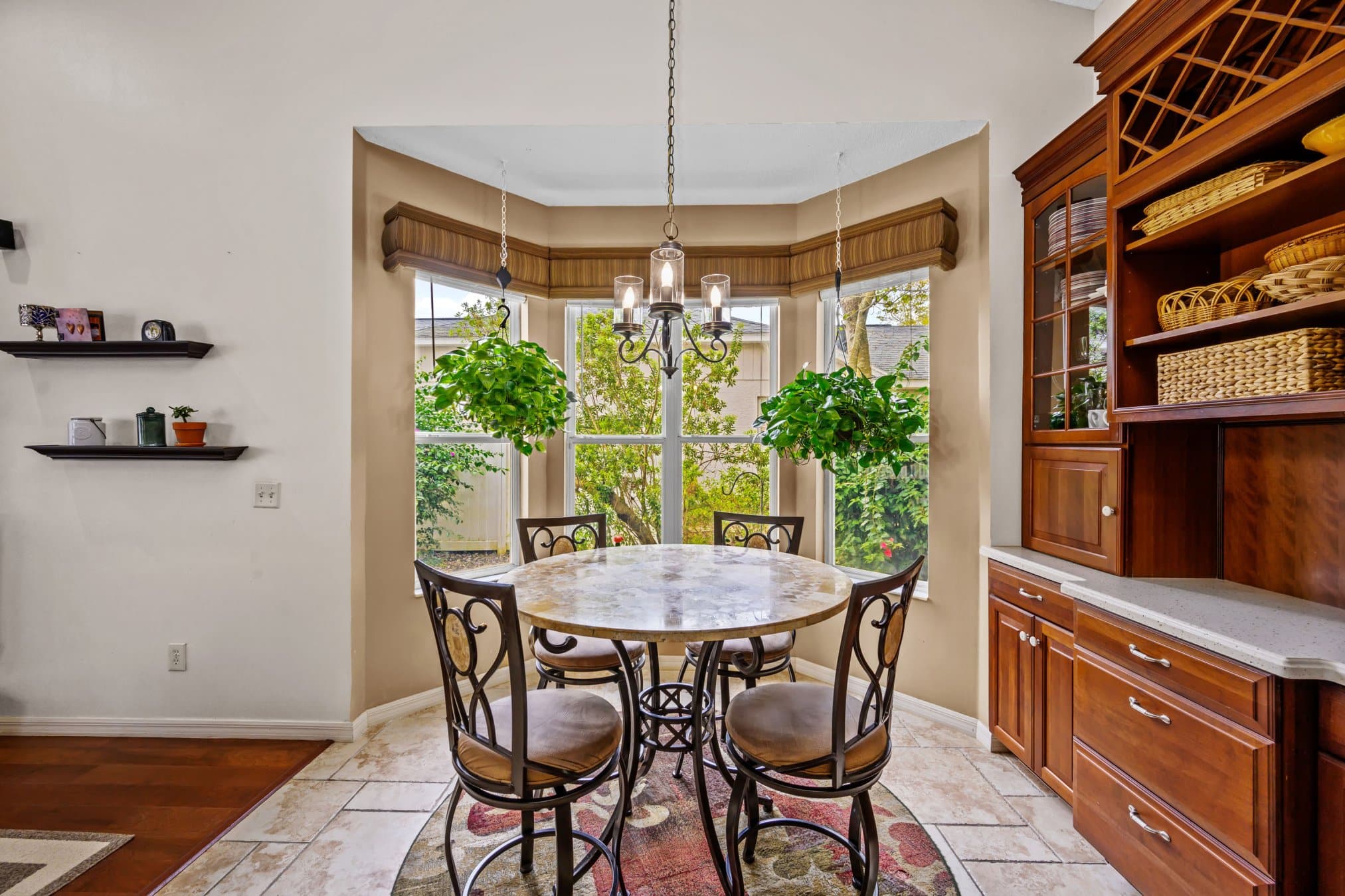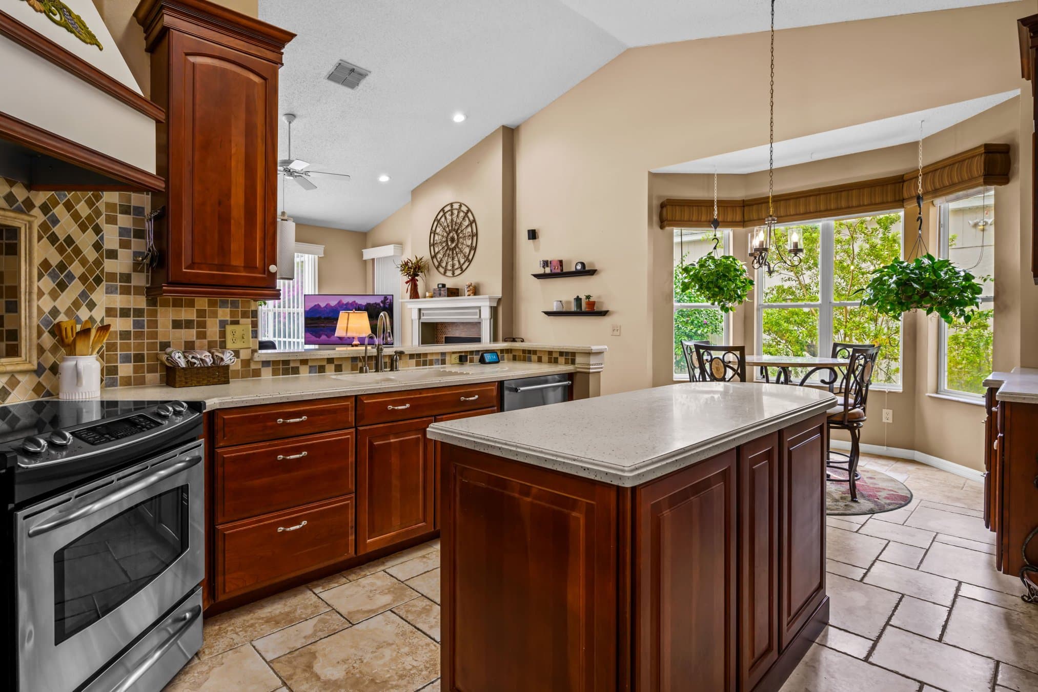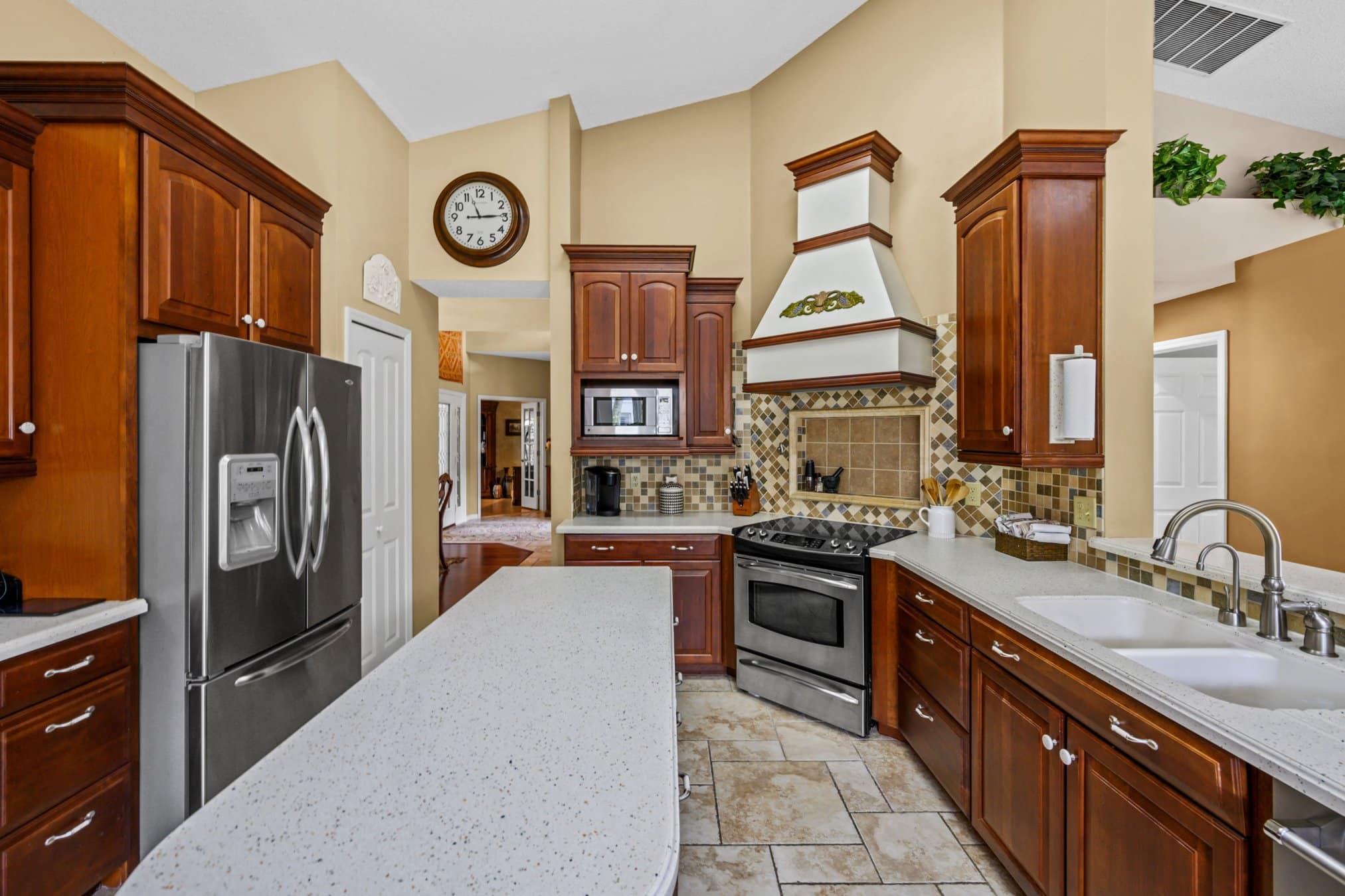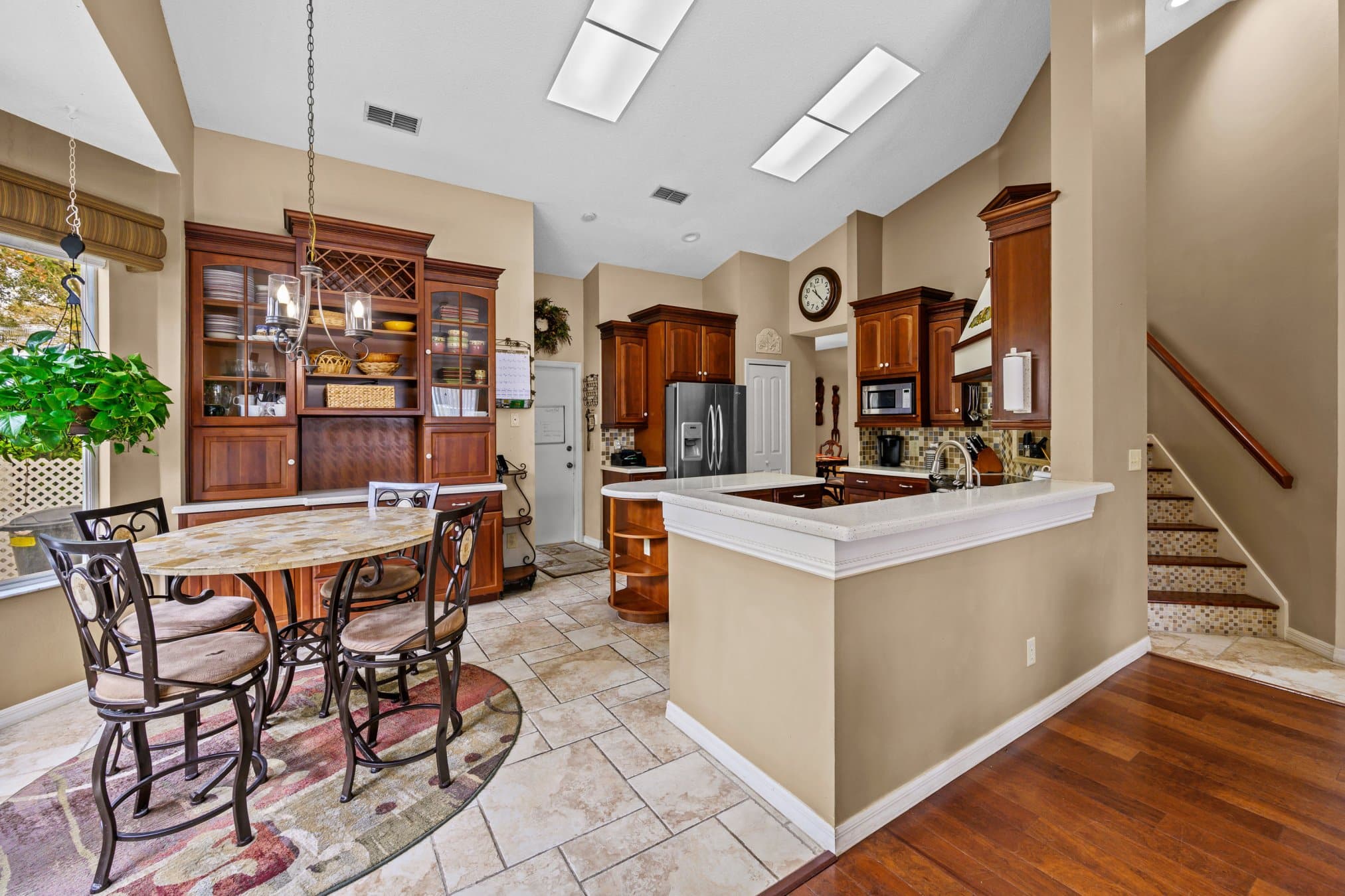 The kitchen at 3875 Carnaby Dr has been beautifully updated for both style and everyday use. It has tall cabinets with crown molding, stainless steel appliances, and a tile backsplash with a custom nook. In addition, Corian countertops, a big island, and a built-in wine rack give plenty of space for cooking and storage. From there, the kitchen opens into the family room, which has a wood-burning fireplace and access to the patio. Meanwhile, warm cherry wood floors run through the dining, living, and family rooms, adding warmth to the space. Near the front, there’s a private office or den with French doors—perfect for working from home. Even better, the first-floor master suite has pool views, a walk-in closet, and a roomy bathroom with two sinks, a garden tub, and a large shower.