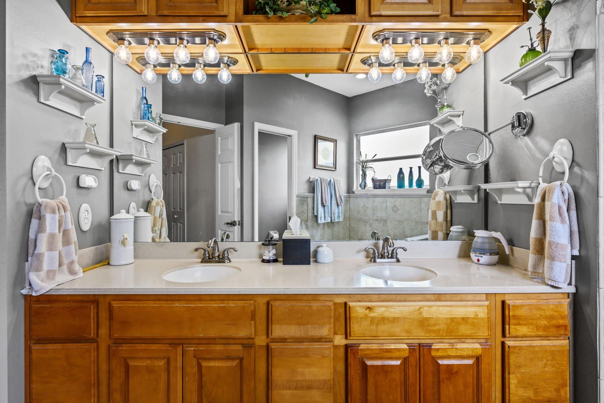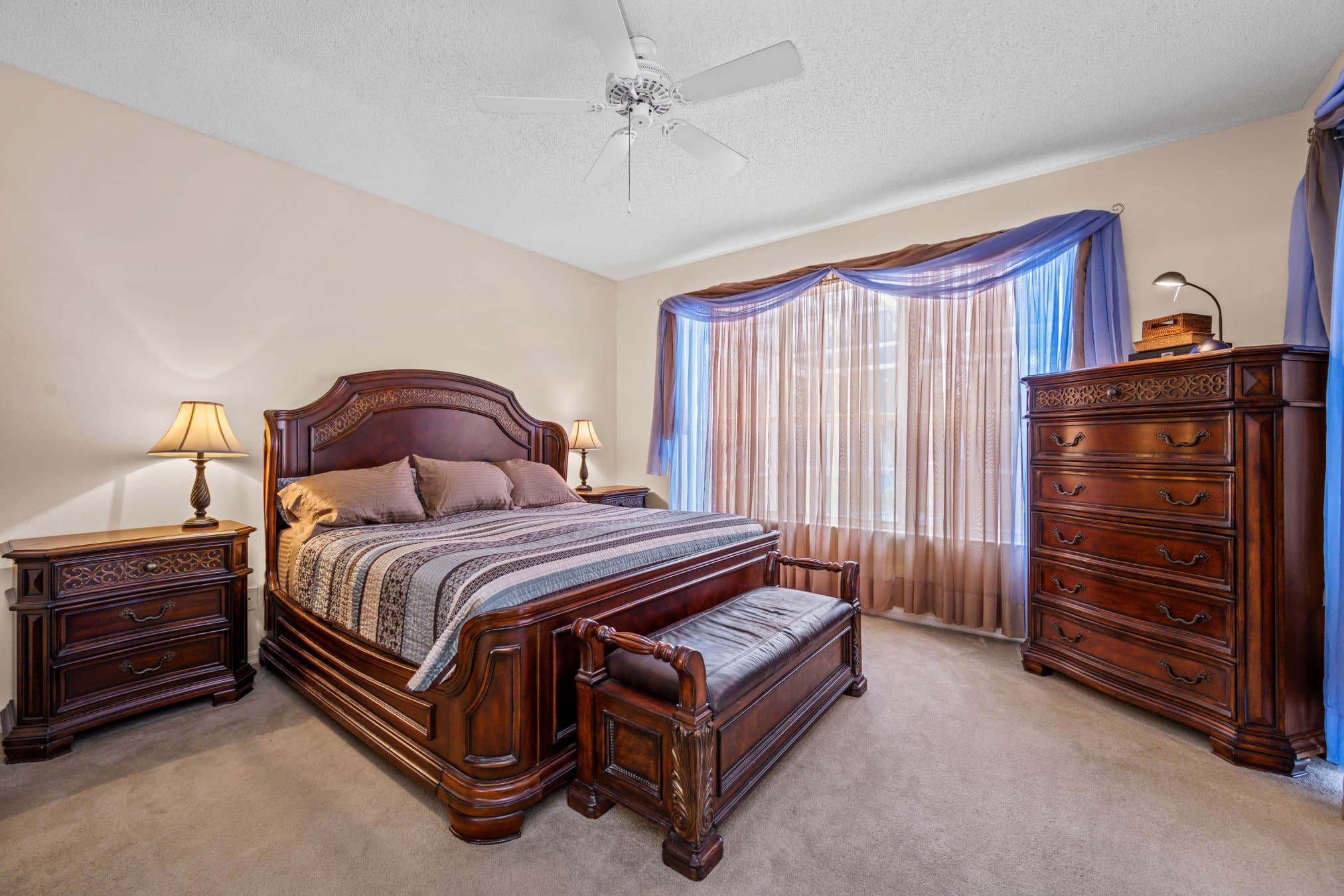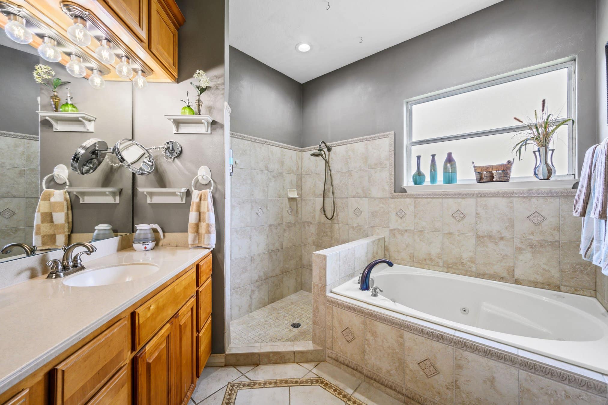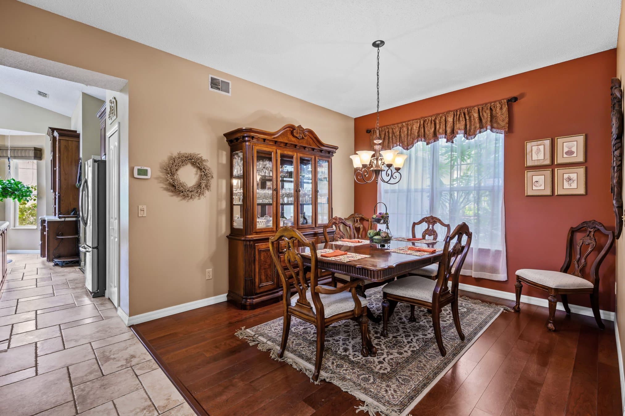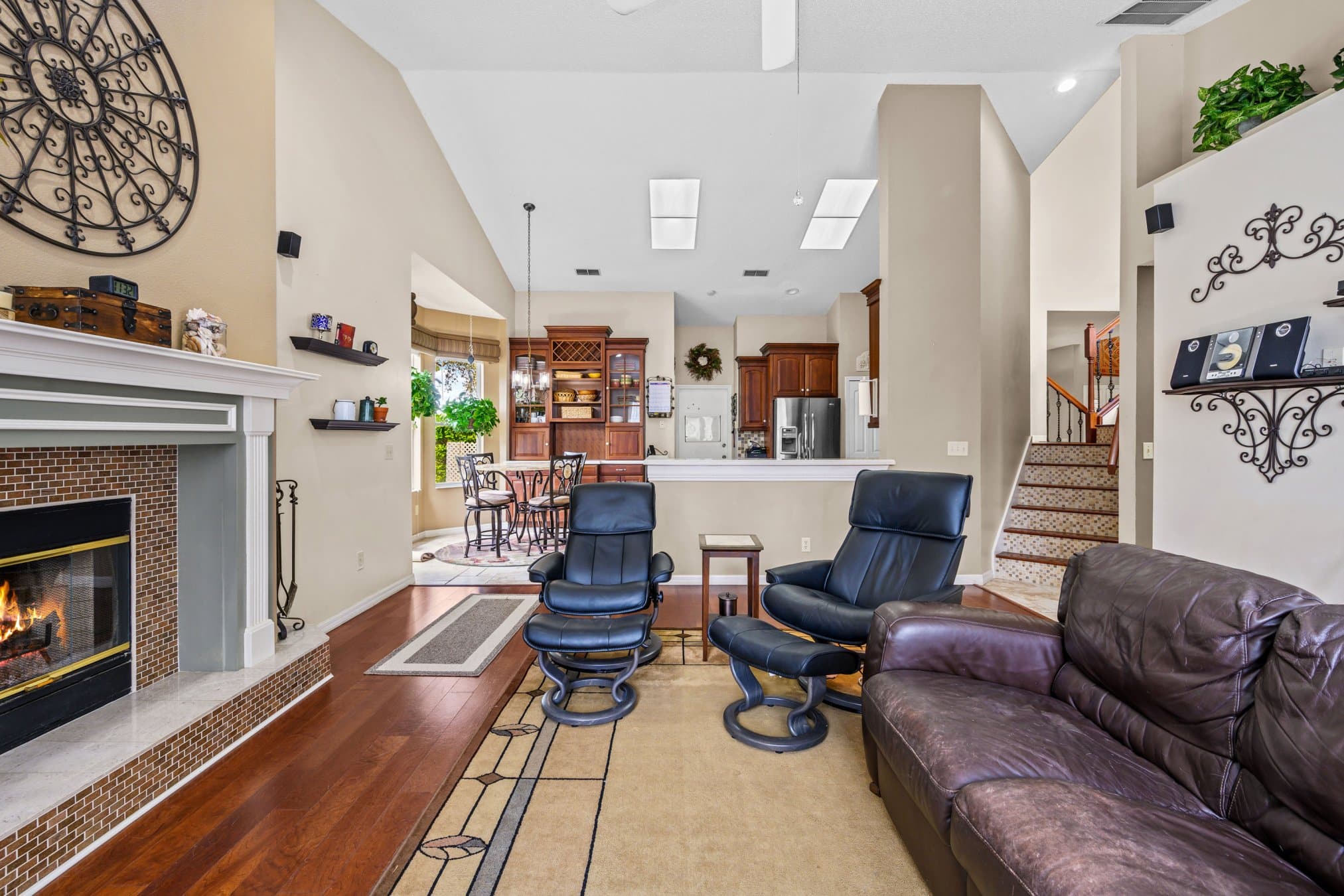 The kitchen at 3875 Carnaby Dr has been beautifully updated for both style and everyday use. It has tall cabinets with crown molding, stainless steel appliances, and a tile backsplash with a custom nook. In addition, Corian countertops, a big island, and a built-in wine rack give plenty of space for cooking and storage. From there, the kitchen opens into the family room, which has a wood-burning fireplace and access to the patio. Meanwhile, warm cherry wood floors run through the dining, living, and family rooms, adding warmth to the space. Near the front, there’s a private office or den with French doors—perfect for working from home. Even better, the first-floor master suite has pool views, a walk-in closet, and a roomy bathroom with two sinks, a garden tub, and a large shower.