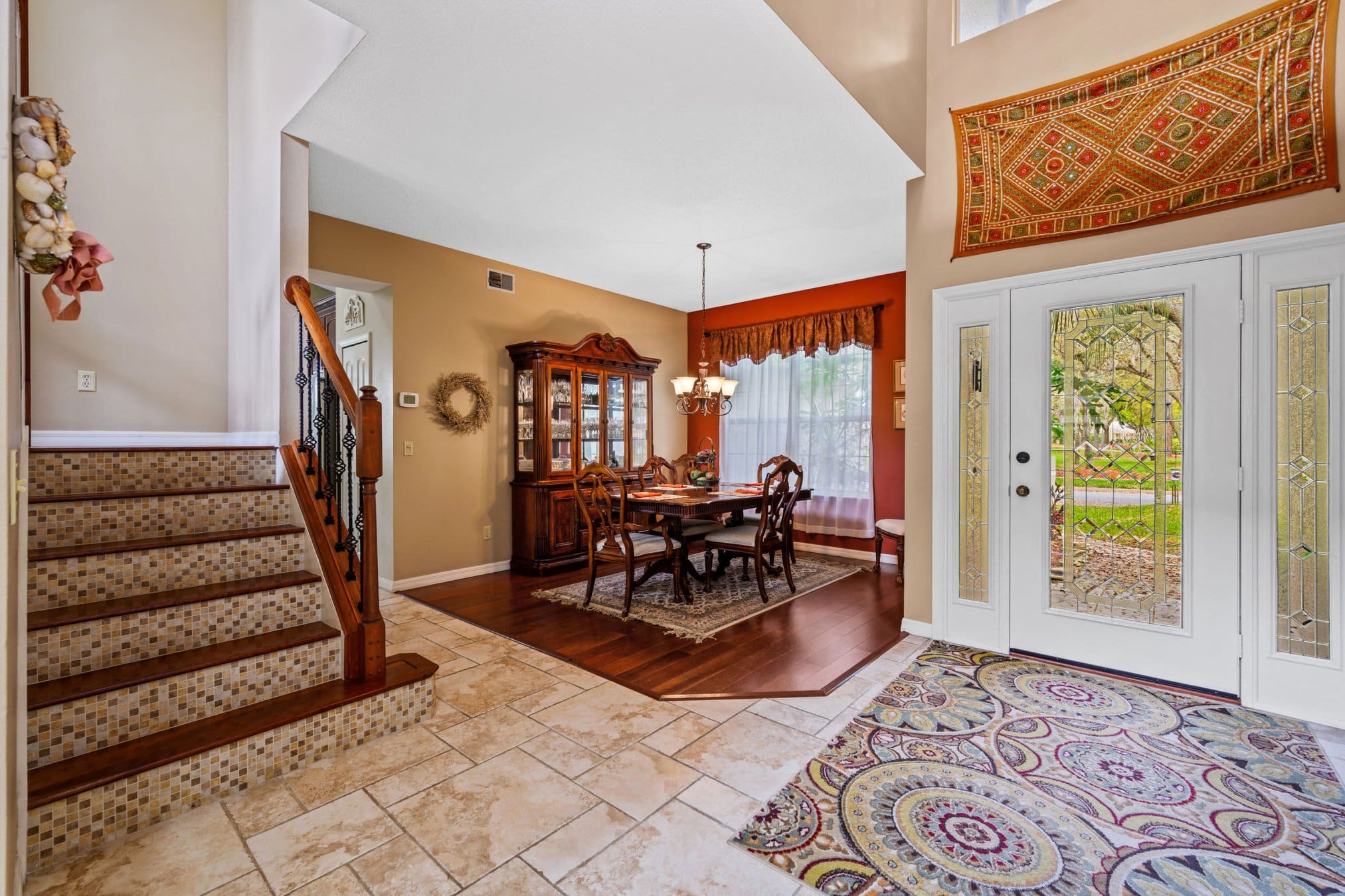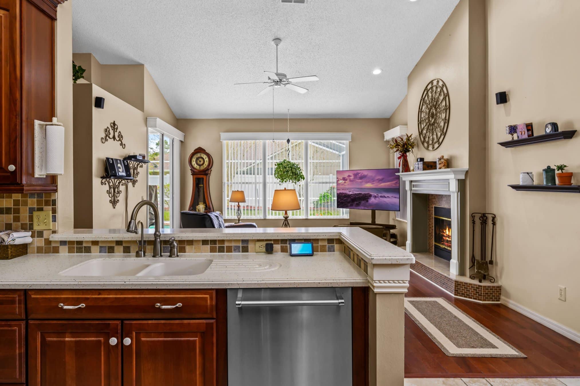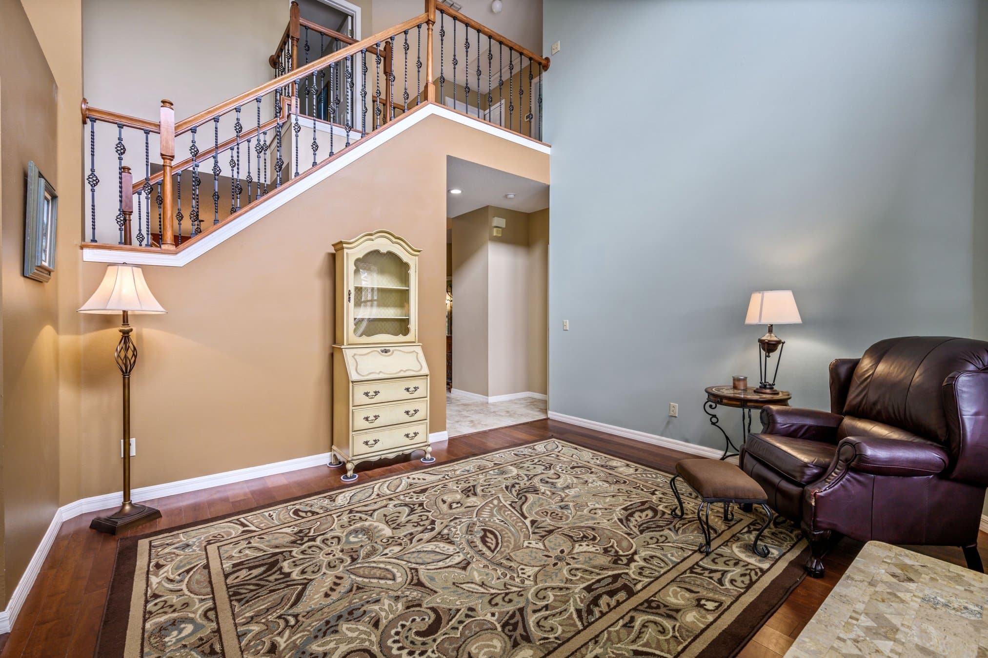 When you walk in the front door of 3875 Carnaby Dr, you’ll notice plenty of natural light and a tall, two-story foyer. The travertine floors, soft paint colors, and wrought-iron stair rails add a touch of elegance. To the right, the formal dining room has a pretty chandelier and a large window. Straight ahead, the formal living room is perfect for guests and has peaceful pool views. Nearby is a remodeled half bathroom that also works as a pool bath. The open kitchen and family room are great for gatherings with friends and family. High ceilings and an open design make this space feel large and welcoming.