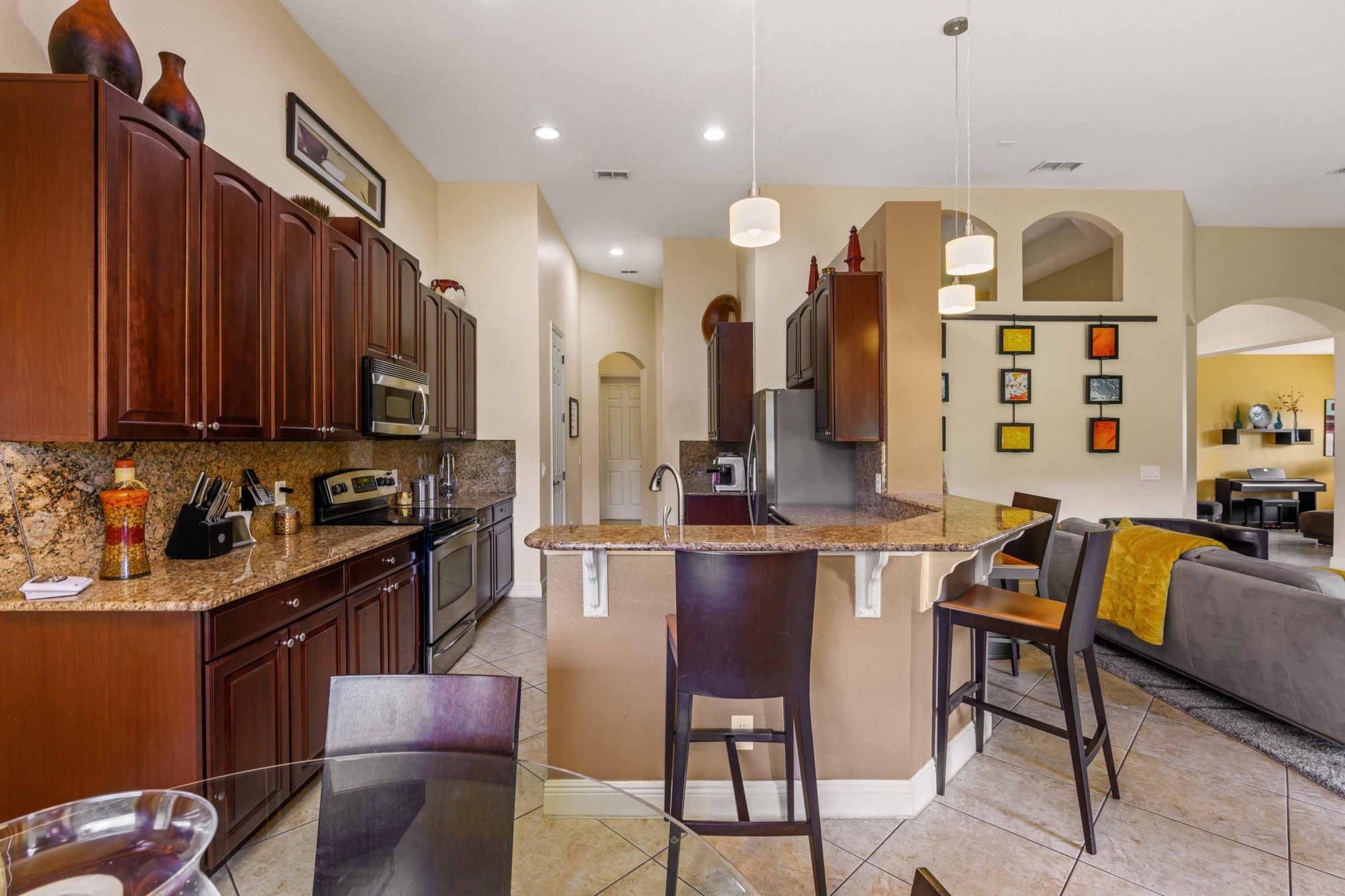 Continuing through 4020 Freesia Cv, you’ll find an open-concept kitchen and family room, perfect for entertaining or casual evenings. The family room is generous in size, featuring French door access to the patio for seamless indoor-outdoor living. Meanwhile, the kitchen boasts granite countertops, a stylish backsplash, stainless steel appliances, and 42” cabinets. An expansive pantry, coffee bar, and breakfast bar add both style and function. The dinette area offers backyard views, making every meal more enjoyable. 🌿