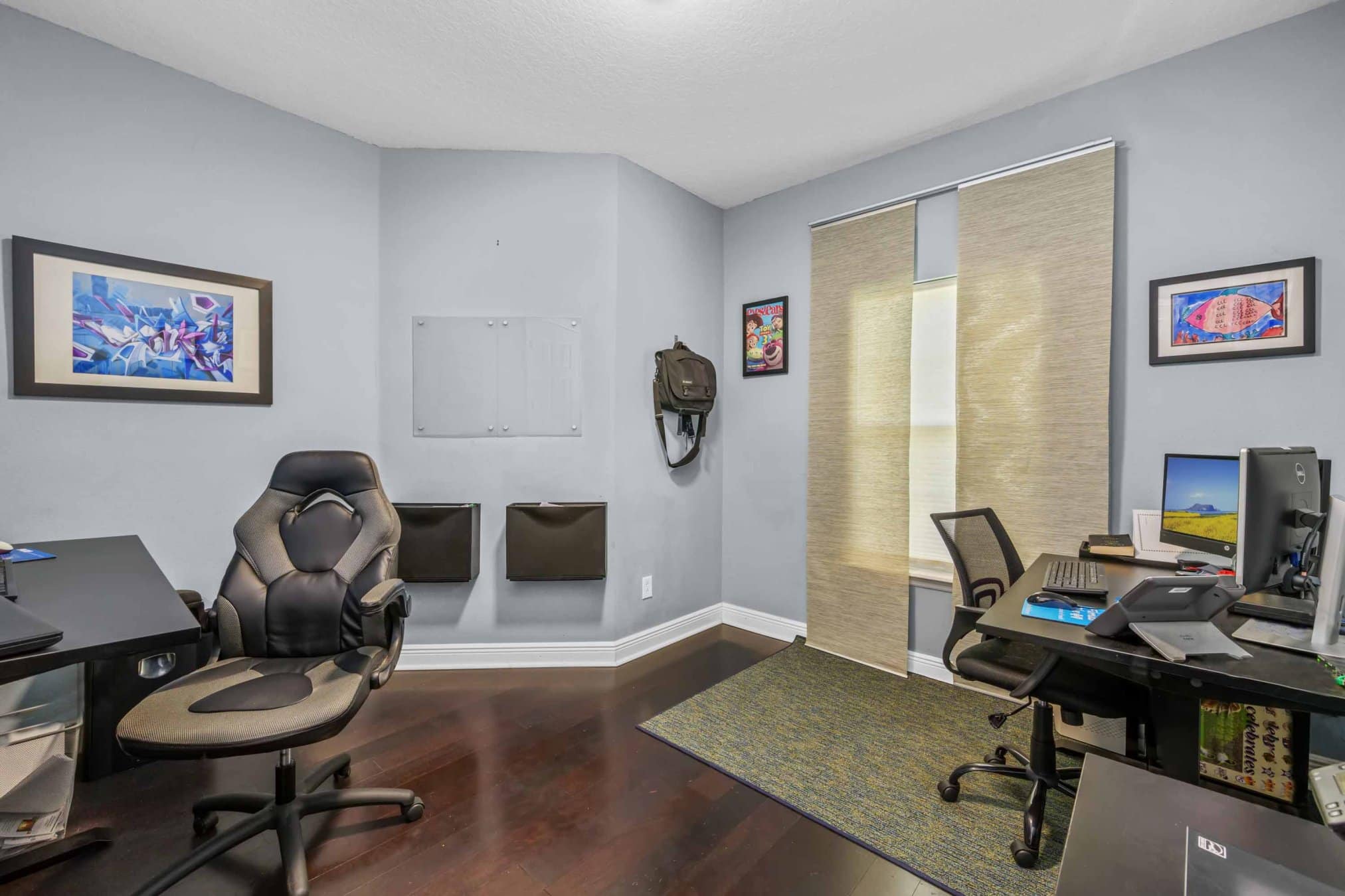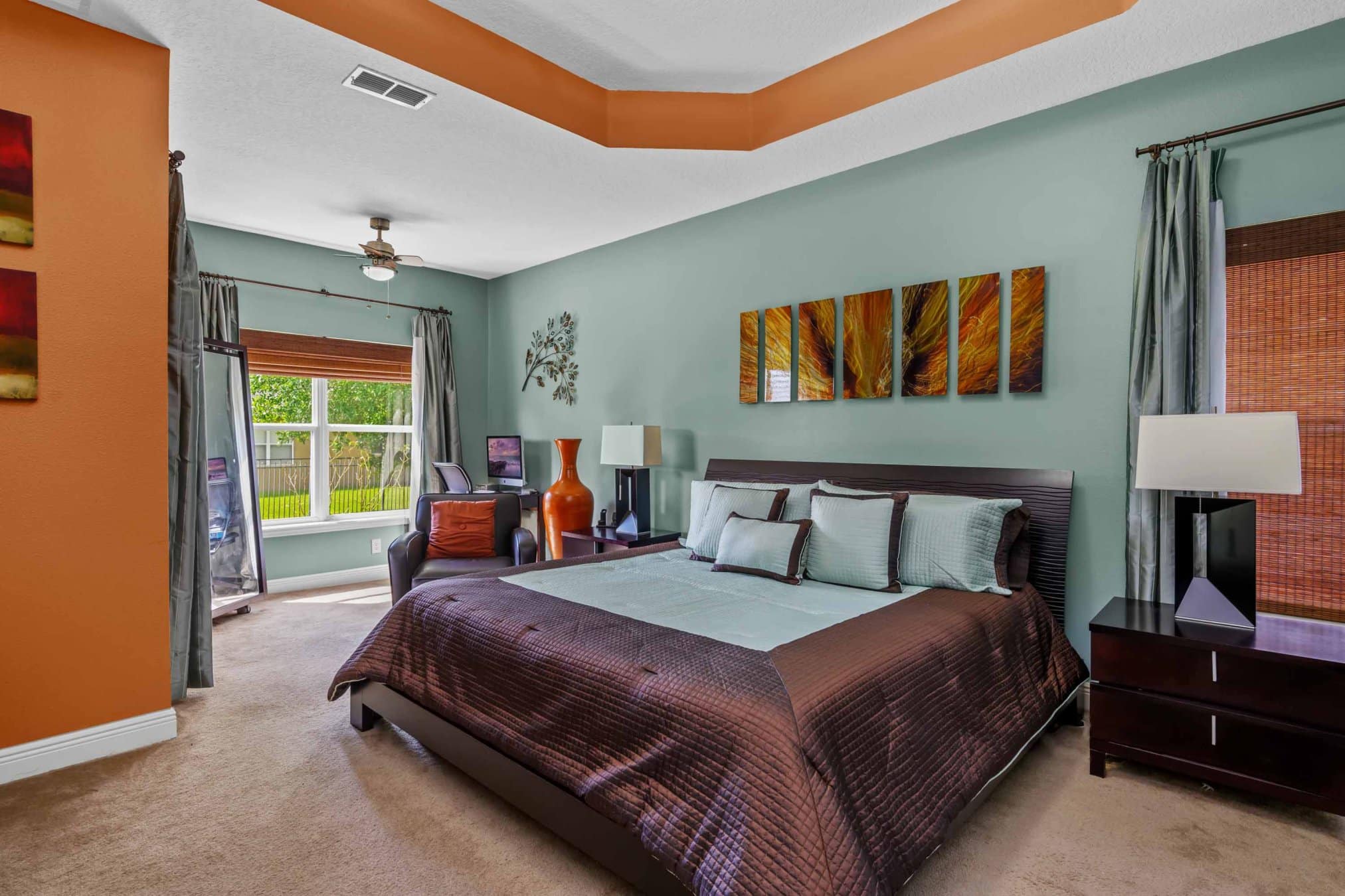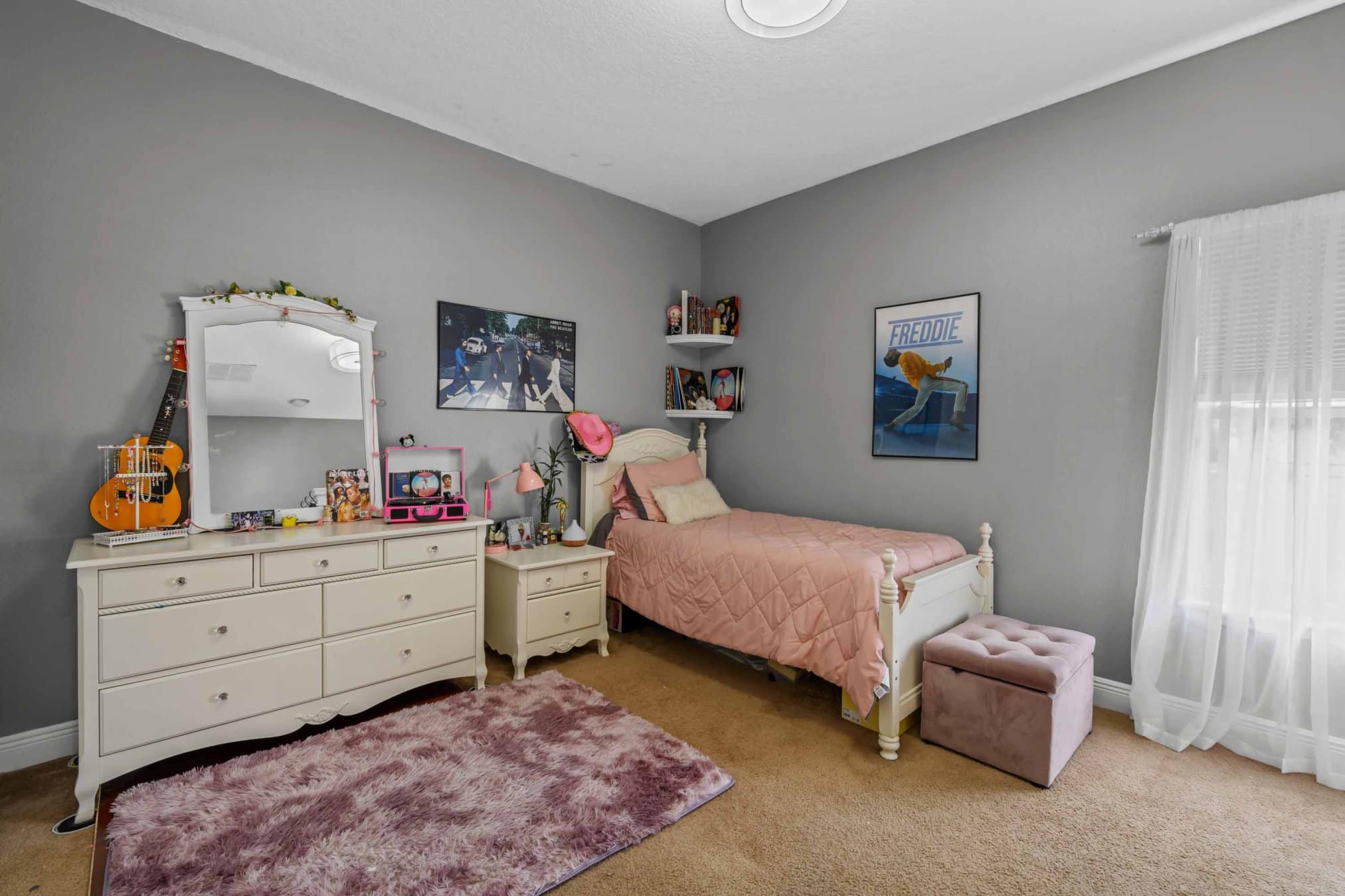 In a triple-split layout, 4020 Freesia Cv offers three secondary bedrooms, each with large closets and bright windows. The front-left bedroom is paired with a nearby bathroom, while two bedrooms at the back share a cabana bath with patio access. This cabana bath is perfect for future pool plans. The dedicated office could also serve as a fifth bedroom if needed. Additionally, the laundry room includes built-in cabinetry and a countertop for added convenience.