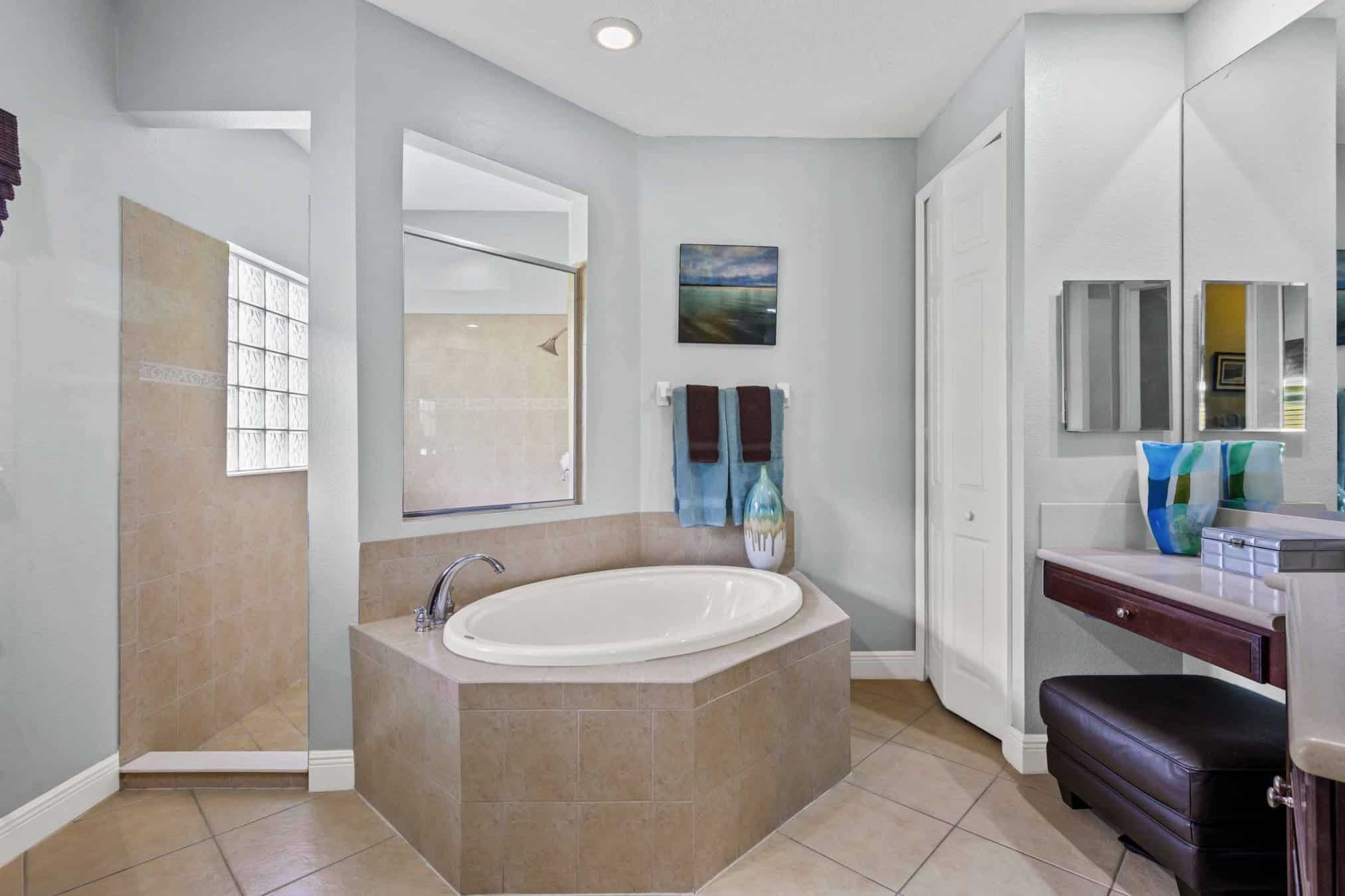On the right side of 4020 Freesia Cv, the master suite provides a peaceful retreat. A spacious sitting area and direct patio access make it ideal for morning coffee or evening relaxation. The large walk-in closet, complete with a custom organization system, keeps everything tidy. In addition, the master bath features double vanities, a garden tub, a separate shower, and a water closet. This setup combines luxury with practicality, ensuring a private space to unwind. 🛏️