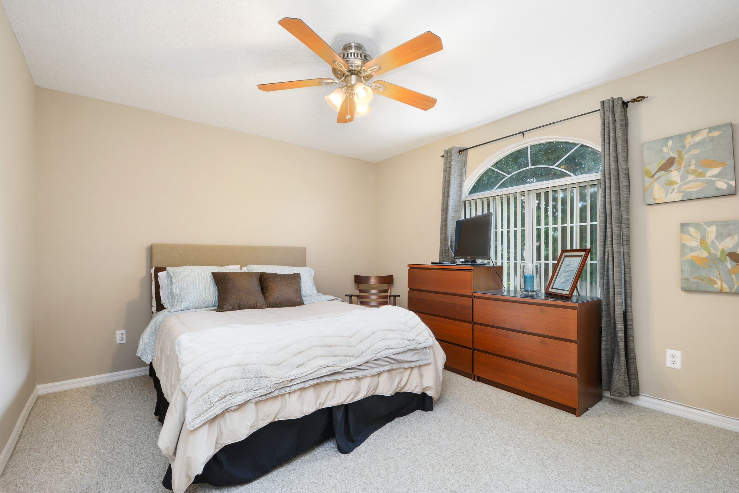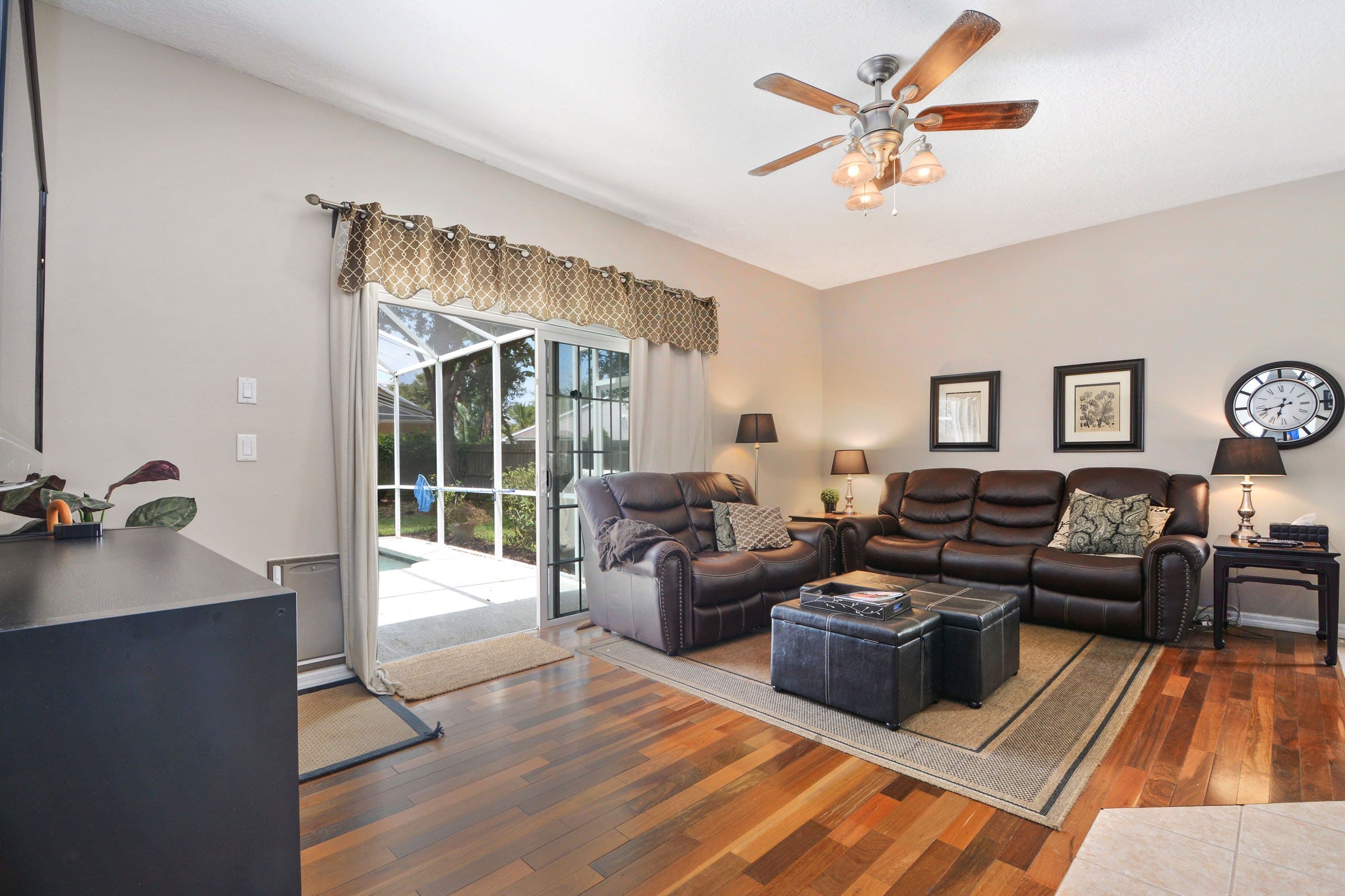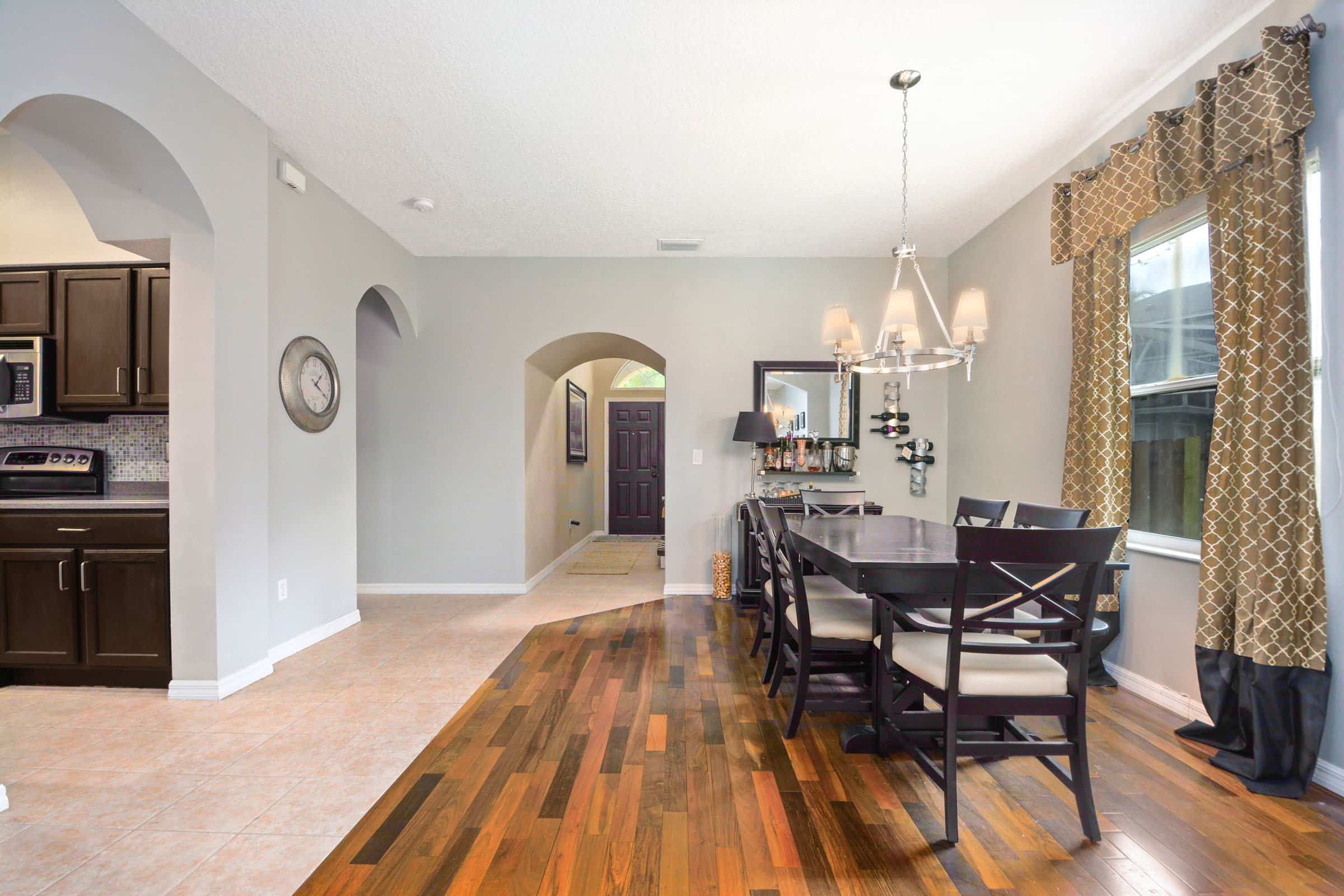 Beyond these spaces, arched openings guide you into the heart of the home. The spacious family room continues the hardwood flooring and cohesive color palette. In addition, an upgraded ceiling fan enhances comfort. Meanwhile, sliding doors provide easy access to the patio. Because the family room flows directly into the kitchen, it creates an ideal setup for entertaining and everyday living.