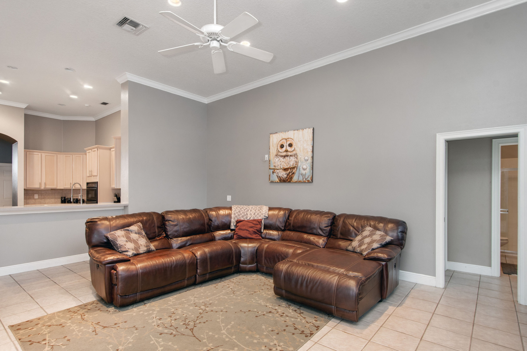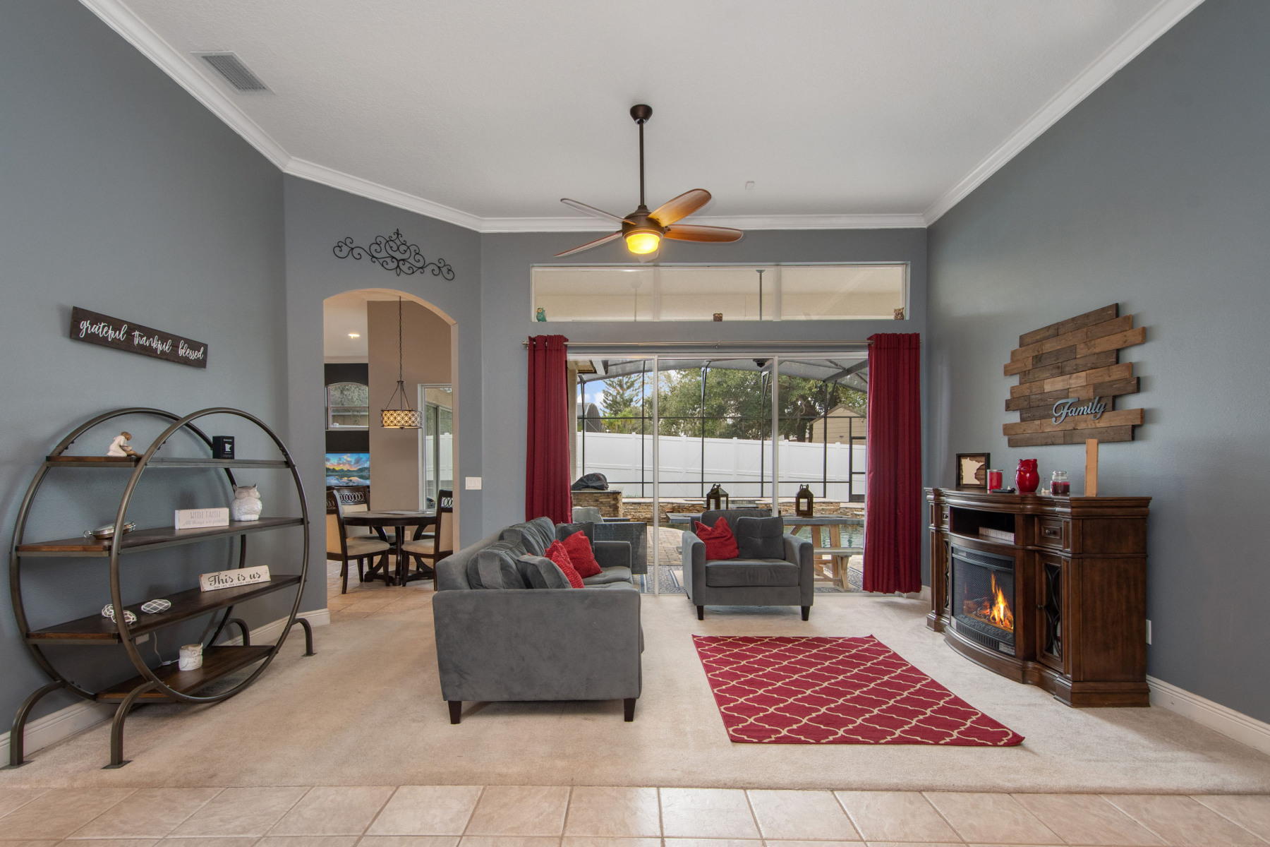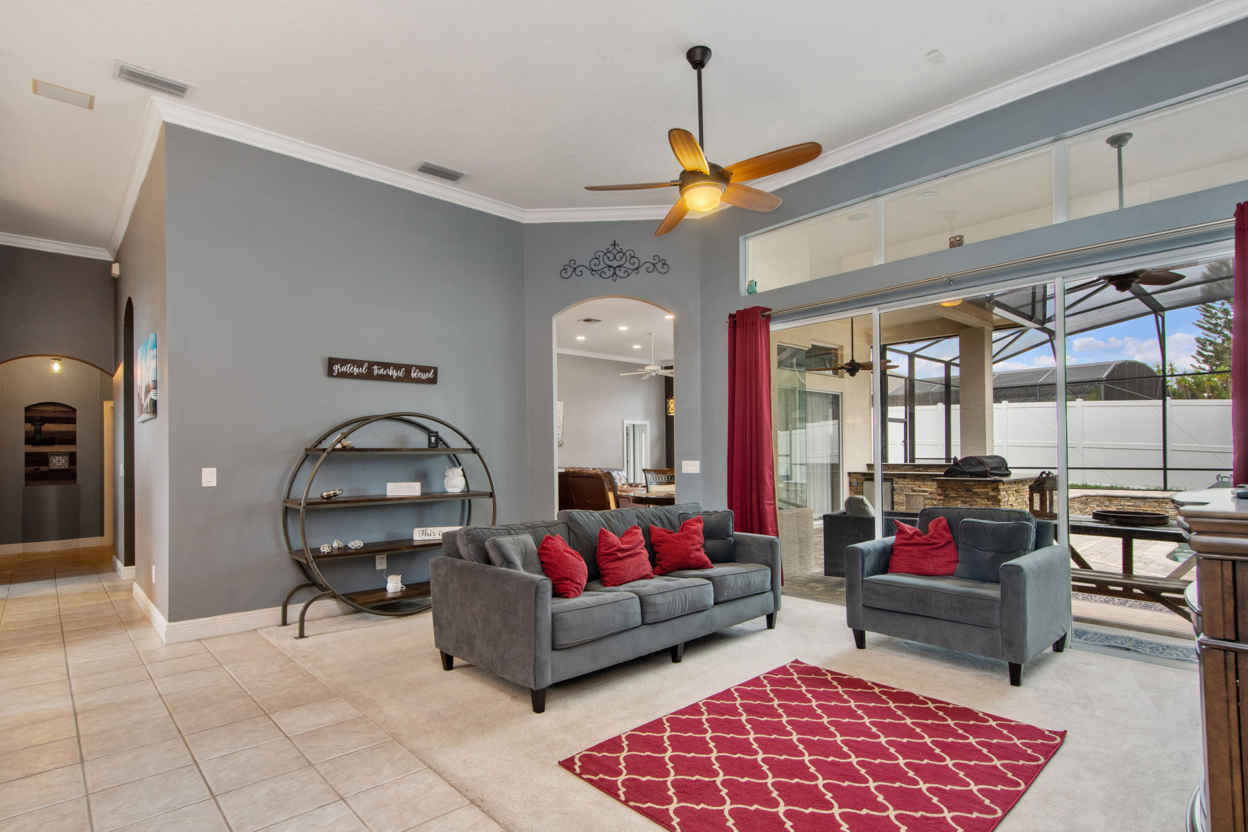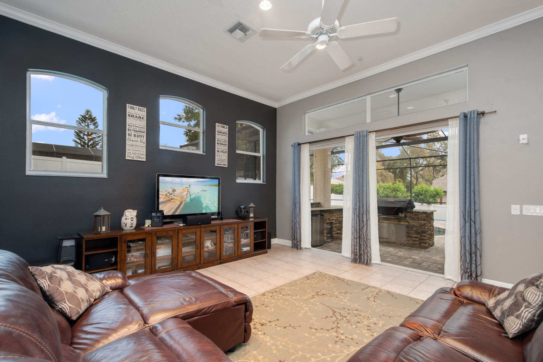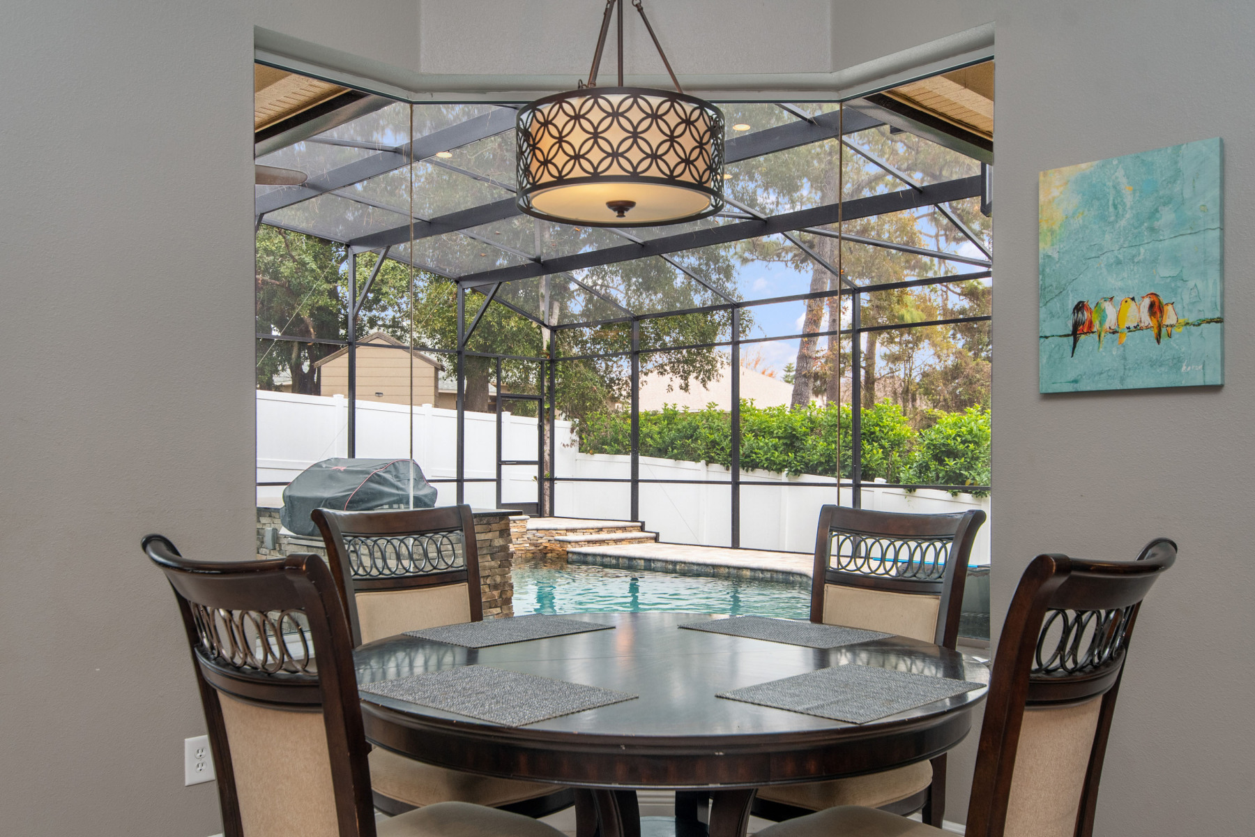 Nestled in the secure, gated community of Estates at Aloma Woods, 5725 Oak Lake Trl offers elegance and comfort. Step through the double doors into a spacious, open floor plan that immediately draws your attention. Natural light flows effortlessly, creating a warm and inviting ambiance throughout the home. From the entryway, breathtaking views of the sparkling pool and spa capture your gaze. Additionally, the well-appointed outdoor kitchen can be admired through the living room’s sliding doors. To the left of the entrance sits a formal dining room, highlighted by a chandelier and front-facing window. This residence truly combines beauty and practicality.