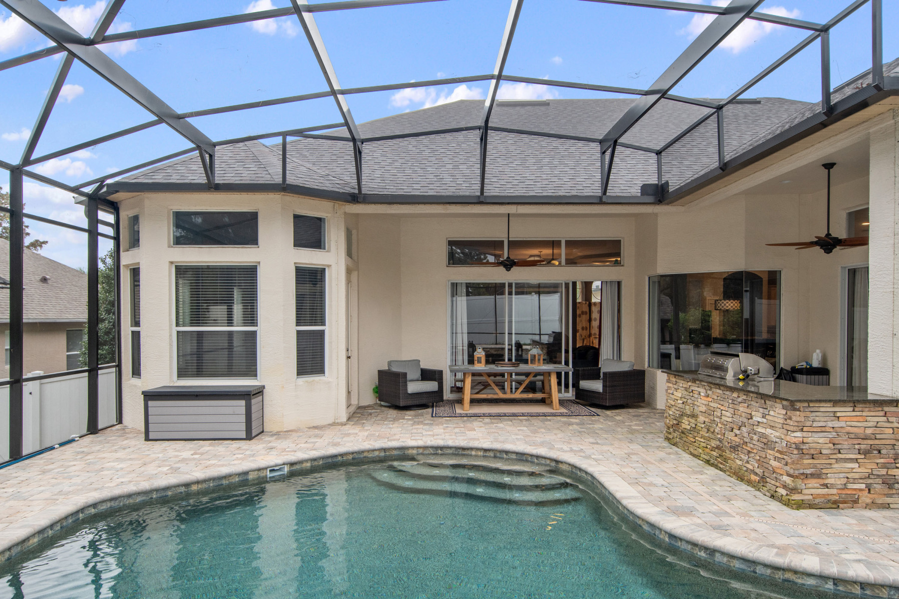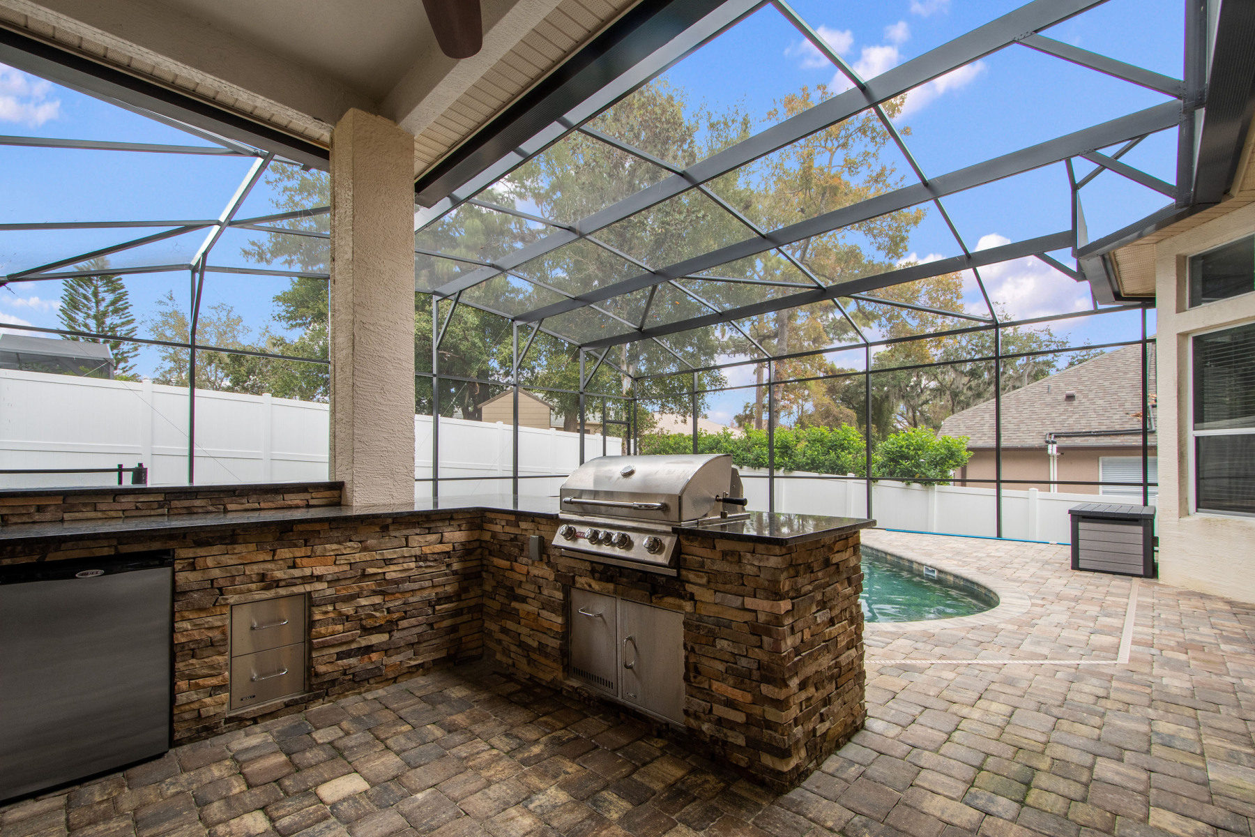 Undoubtedly, the outdoor living area of 5725 Oak Lake Trl sets this property apart. Beautiful pavers frame the entertainment space, all enclosed within a screen for year-round enjoyment. A saltwater pool and heated spa provide relaxation in every season. The outdoor kitchen, perfect for grilling and gatherings, adds even more appeal. Moreover, the fenced backyard offers safety and space for pets or children. Whether hosting pool parties or enjoying quiet evenings, this backyard delivers unmatched versatility. Beyond functionality, the outdoor retreat captures the true Florida lifestyle.