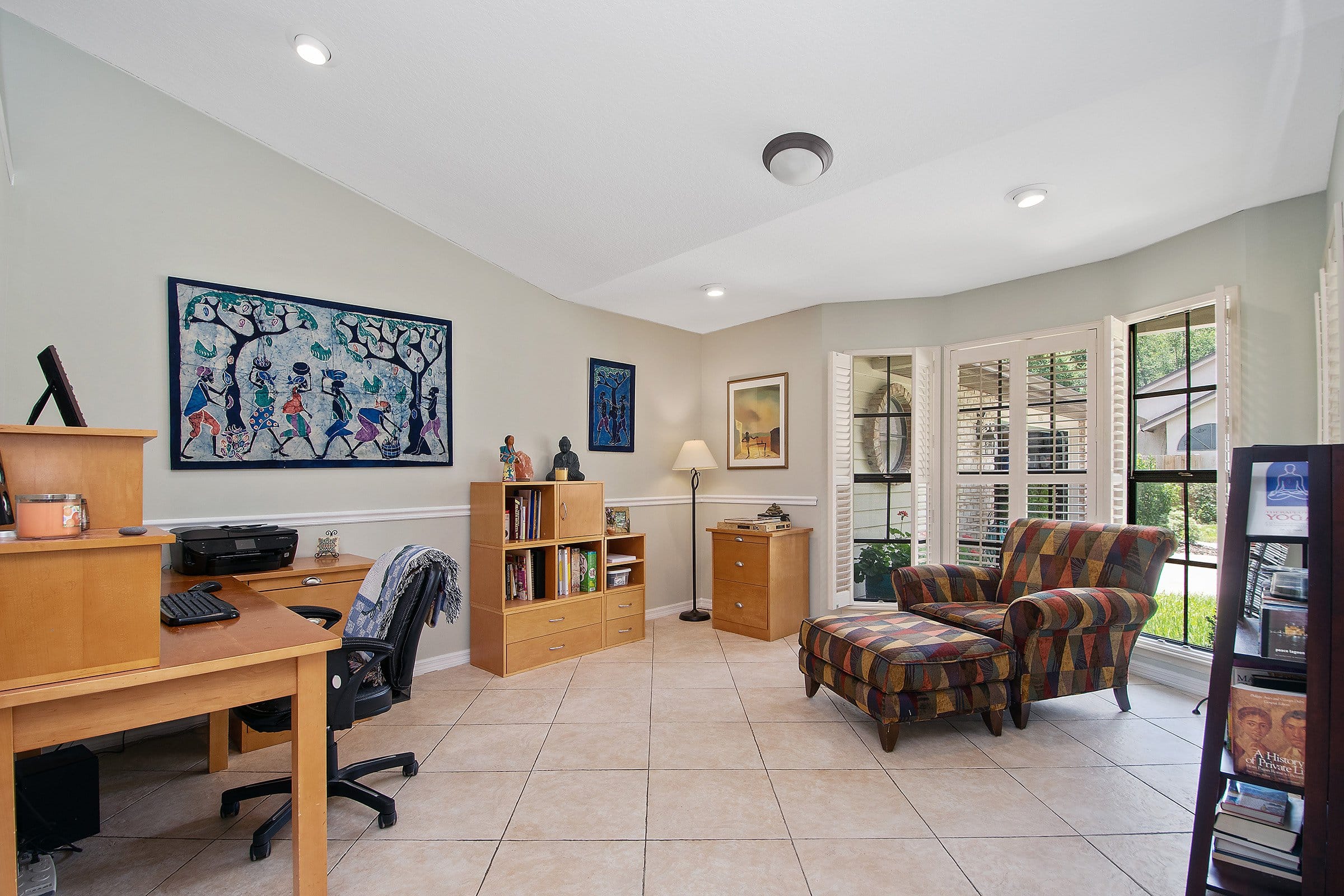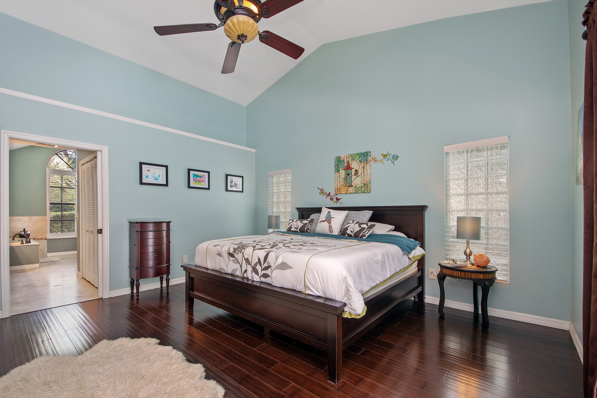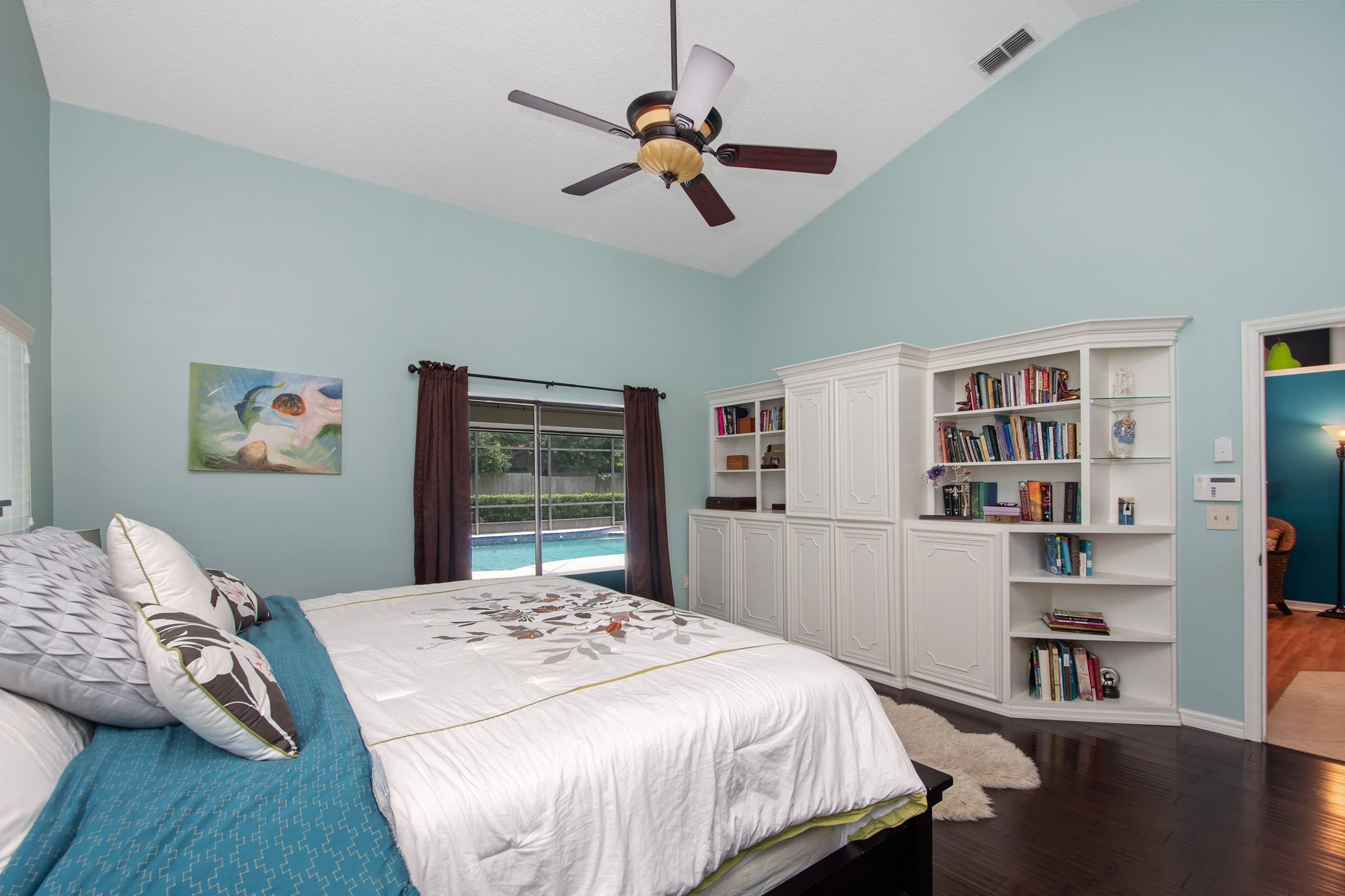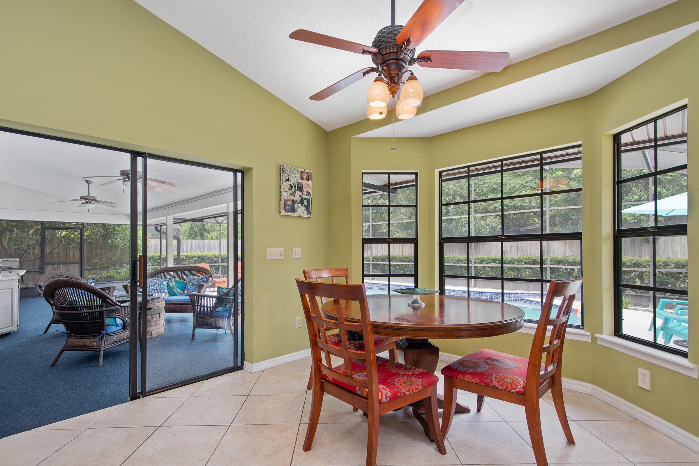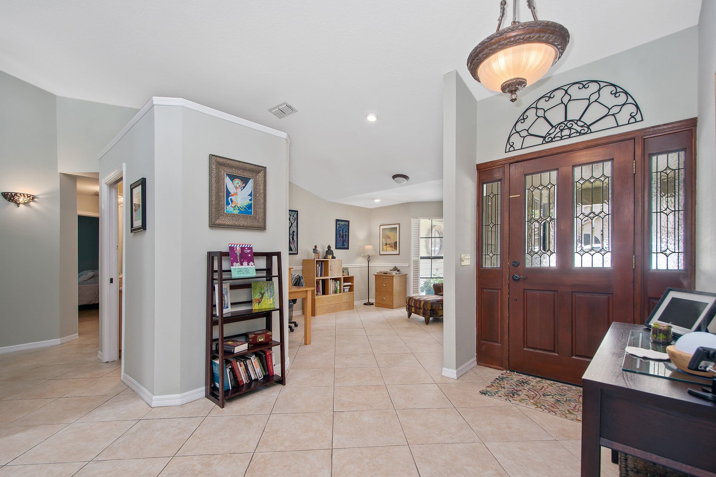 Step through the front door of 681 N Glenn Dr and enjoy tall vaulted ceilings and abundant natural light. As a result, the home feels light, bright, and airy. To the right, the formal dining room offers flexibility and currently serves as an additional living area. Straight ahead, the formal living room features laminate flooring and an upgraded ceiling fan. Moreover, sliding glass doors lead to the patio while offering beautiful pool views. Just off this space, the primary suite and a secondary bedroom create a private retreat.
