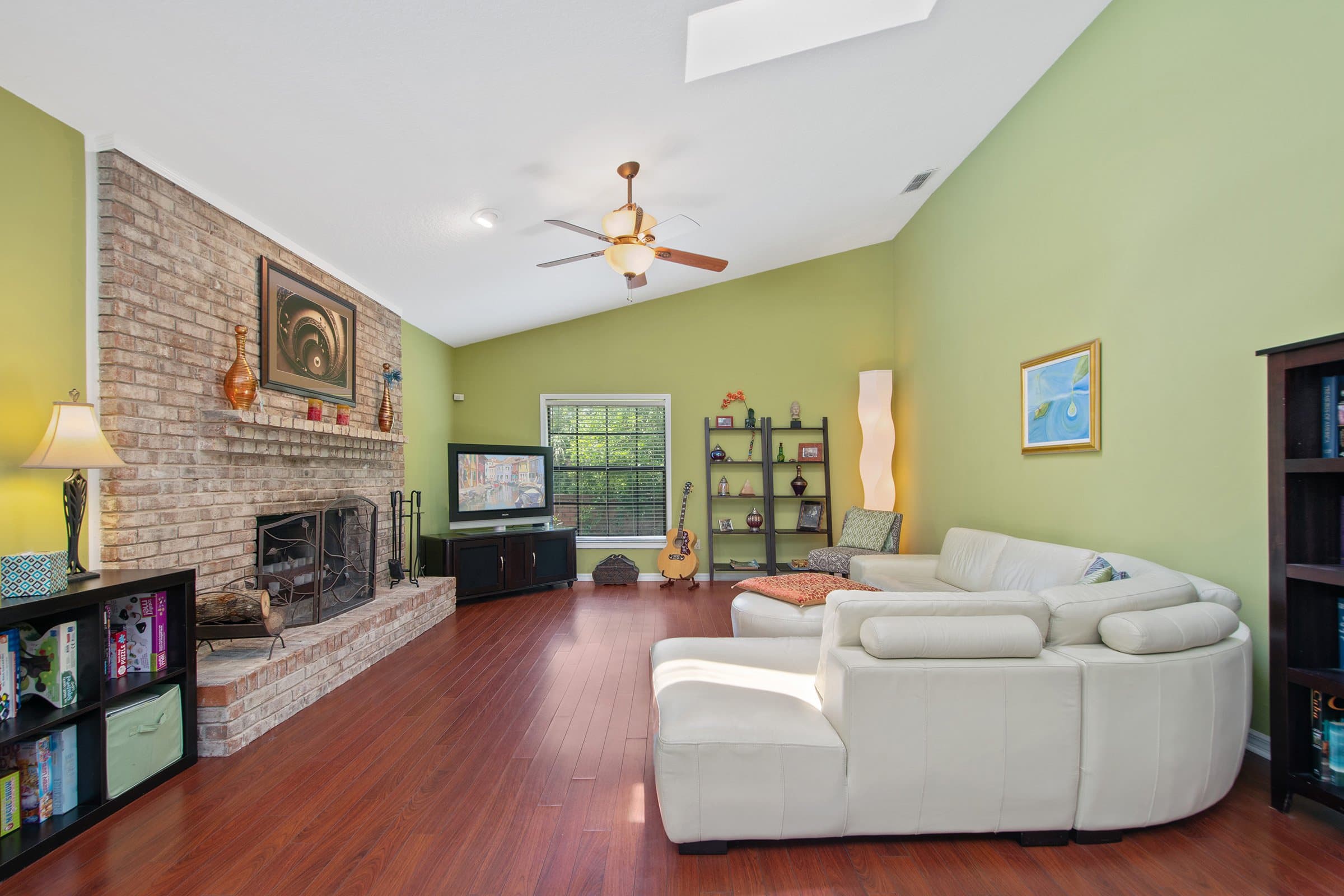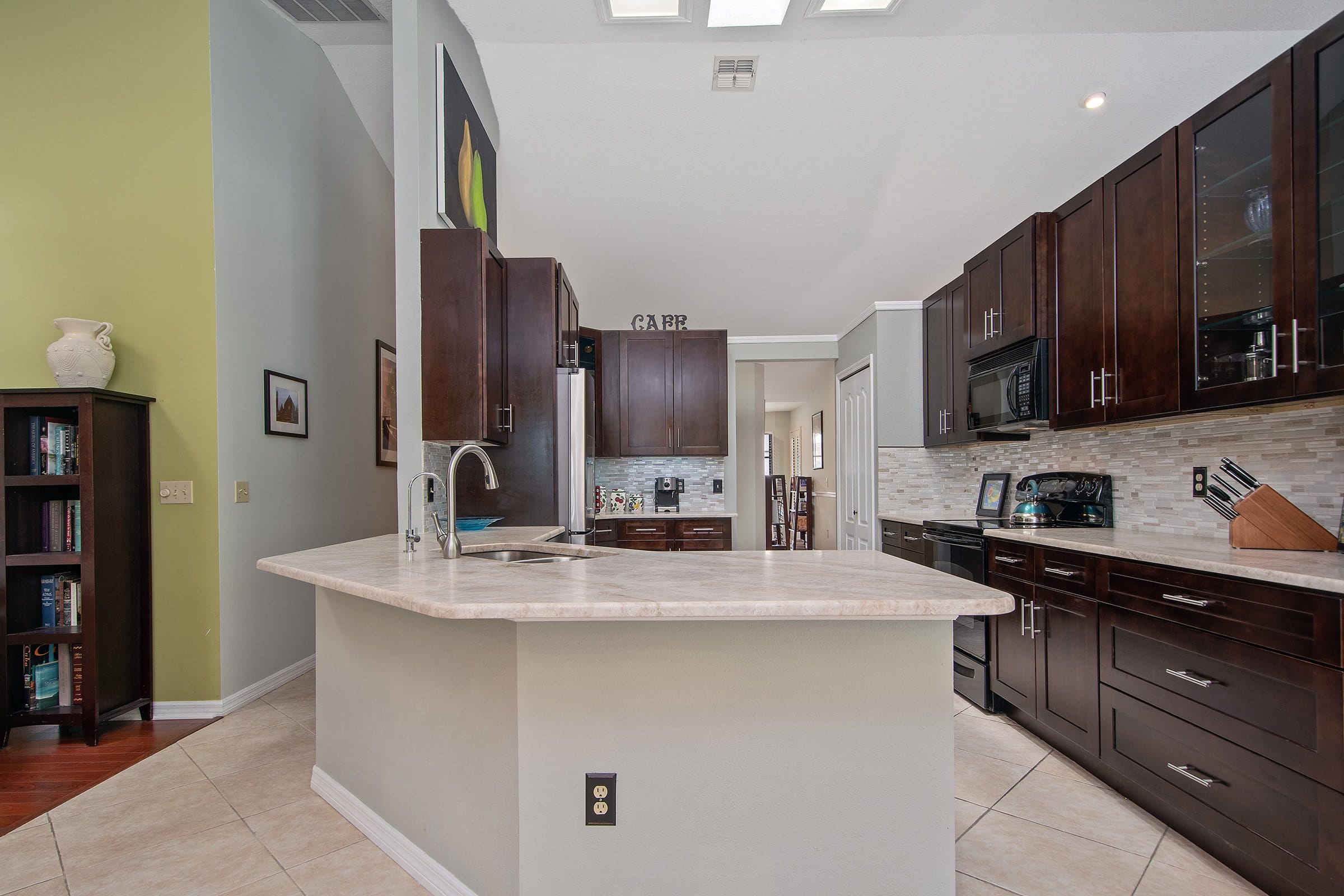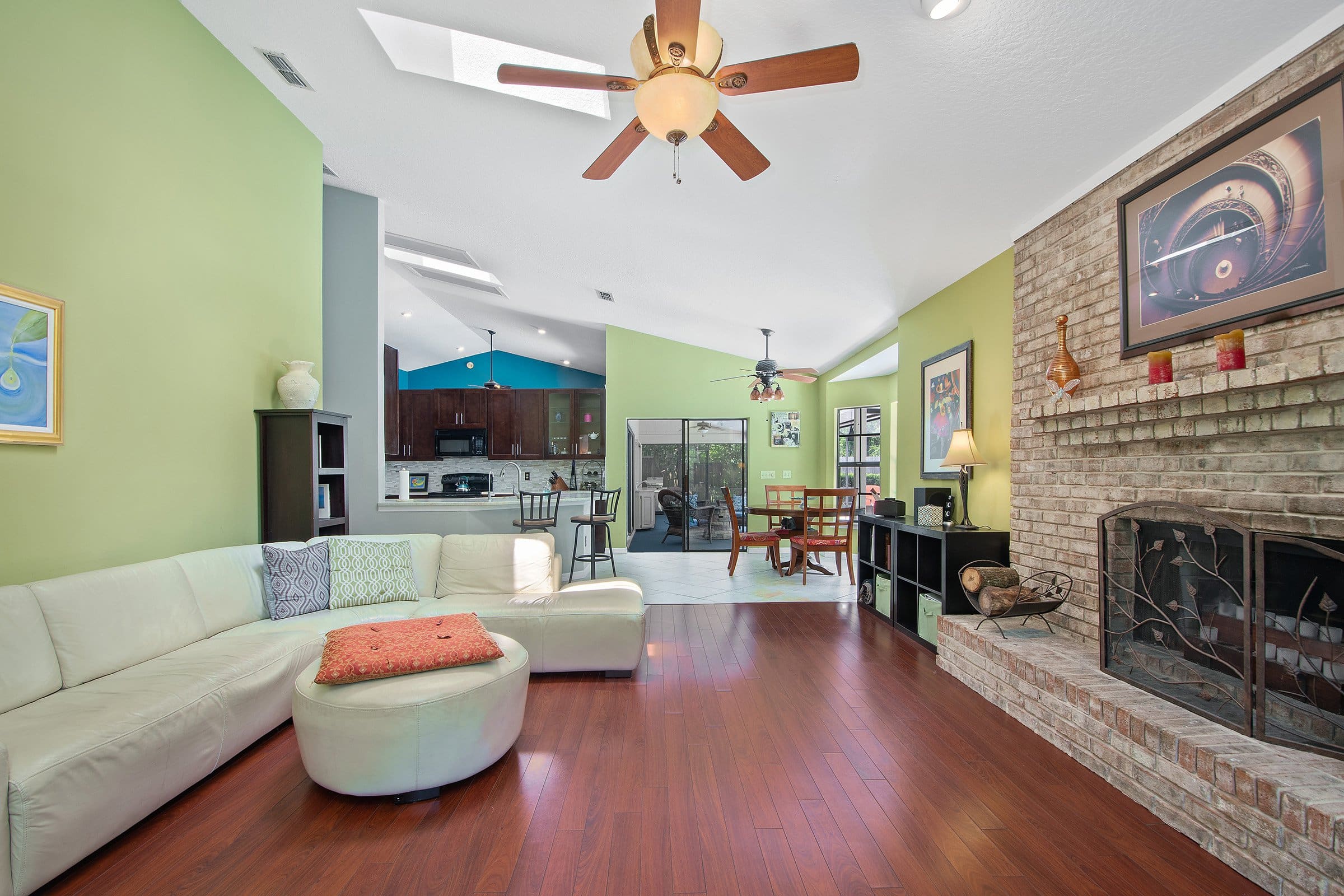 Down the hallway, the upgraded kitchen anchors 681 N Glenn Dr. It features 42-inch solid wood cabinetry, leathered décor-style countertops, tile backsplash, and upgraded appliances. In addition, the breakfast bar overlooks the dinette and family room, making entertaining effortless. The spacious family room includes vaulted ceilings, a skylight, and an upgraded ceiling fan. Furthermore, a wood-burning fireplace adds warmth and charm. Together, these spaces create an inviting gathering area.