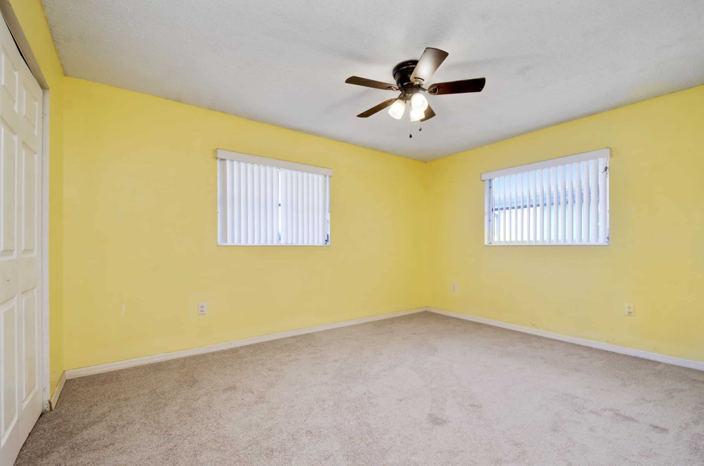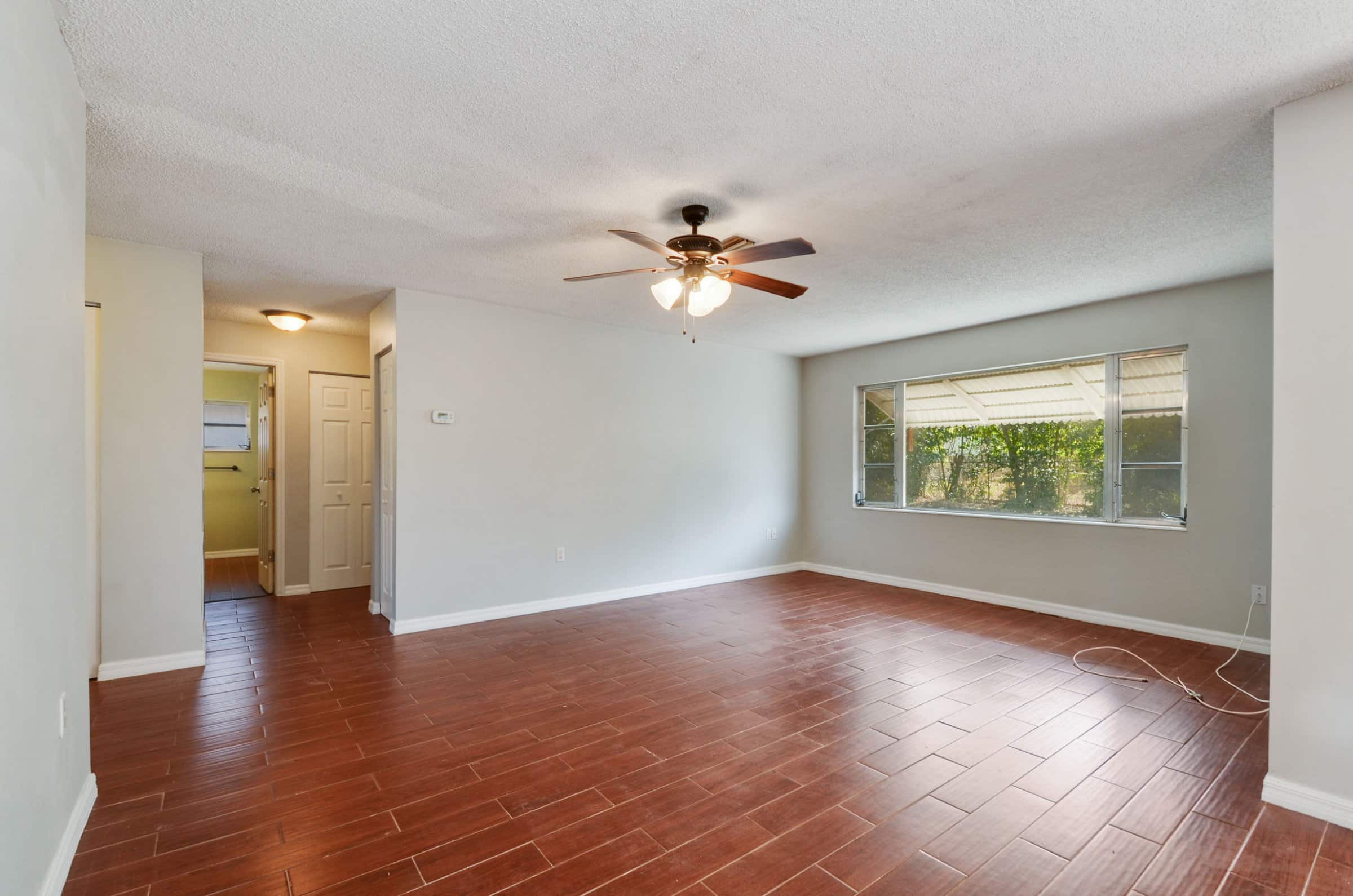 Adjacent to the dining area, a versatile Florida room offers flexible use as an office, playroom, or sun-filled retreat. At the same time, a separate hallway off the living room leads to two spacious bedrooms. Each bedroom includes carpet, ceiling fans, windows, and generous closet space. Additionally, the second bathroom offers an upgraded vanity, a large linen closet, and a shower/tub combination. Altogether, the layout supports both privacy and adaptability.