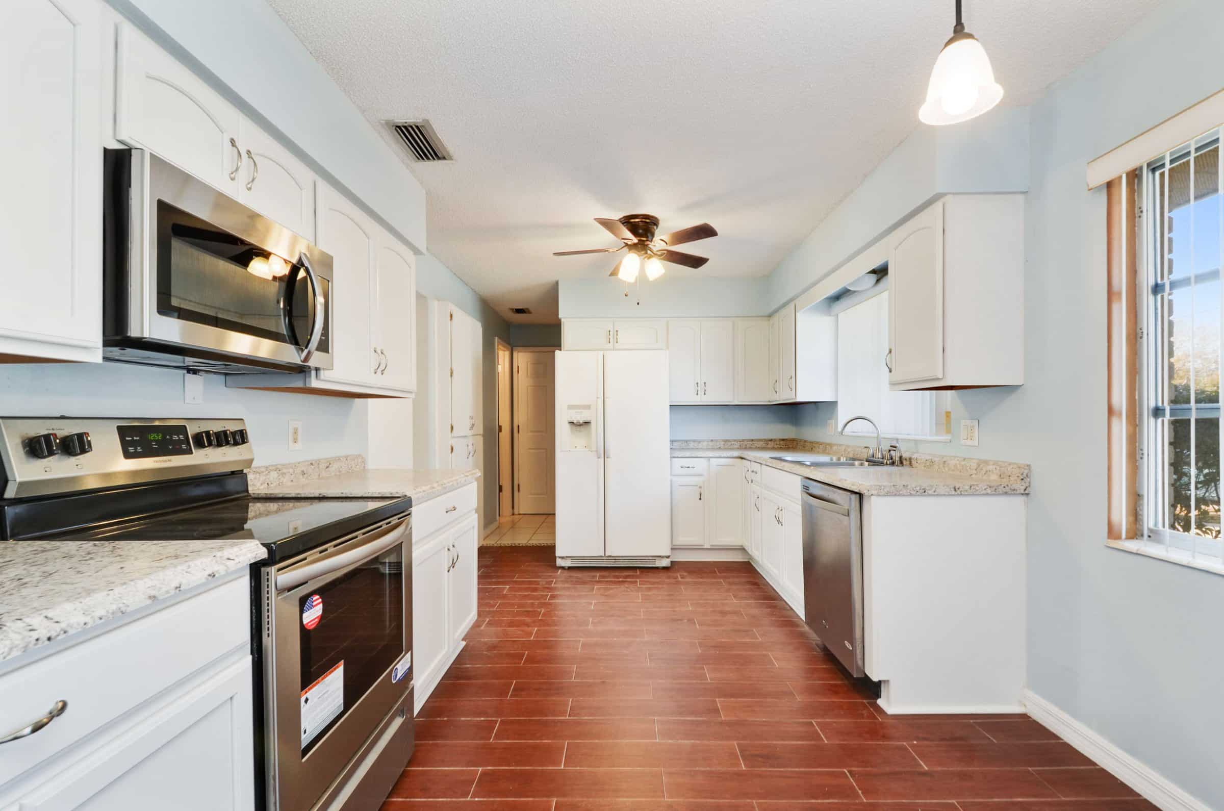 Upon entry, a coat closet sits to the left while the kitchen appears to the right. Notably, the kitchen features light countertops, solid-wood cabinetry, stainless steel appliances, and a ceiling fan. Beyond the kitchen, a hallway leads to the laundry room, a full bathroom, and an oversized one-car garage. Meanwhile, straight ahead, the combined living and dining area fills with natural light from large windows. Furthermore, neutral paint and upgraded light fixtures enhance the open feel of the space.
