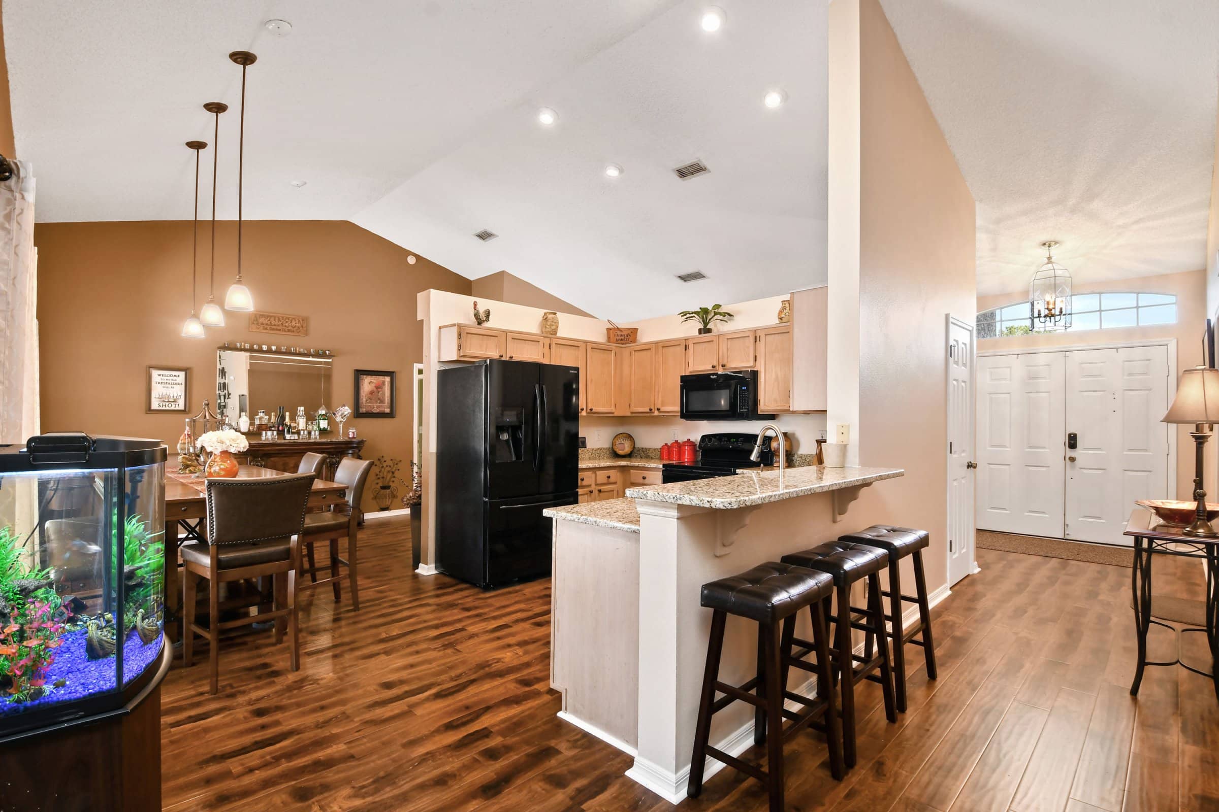 Stepping inside, you’ll immediately notice the beautiful laminate flooring, vaulted ceilings, and upgraded light fixtures that enhance the home’s bright and open feel. Furthermore, the neutral paint scheme provides a clean and cohesive look throughout. The kitchen truly serves as the heart of the home, offering granite countertops, a generous workspace, and a layout ideal for cooking and entertaining. Meanwhile, the open floor plan ensures effortless flow from room to room, making gatherings comfortable and enjoyable for all.