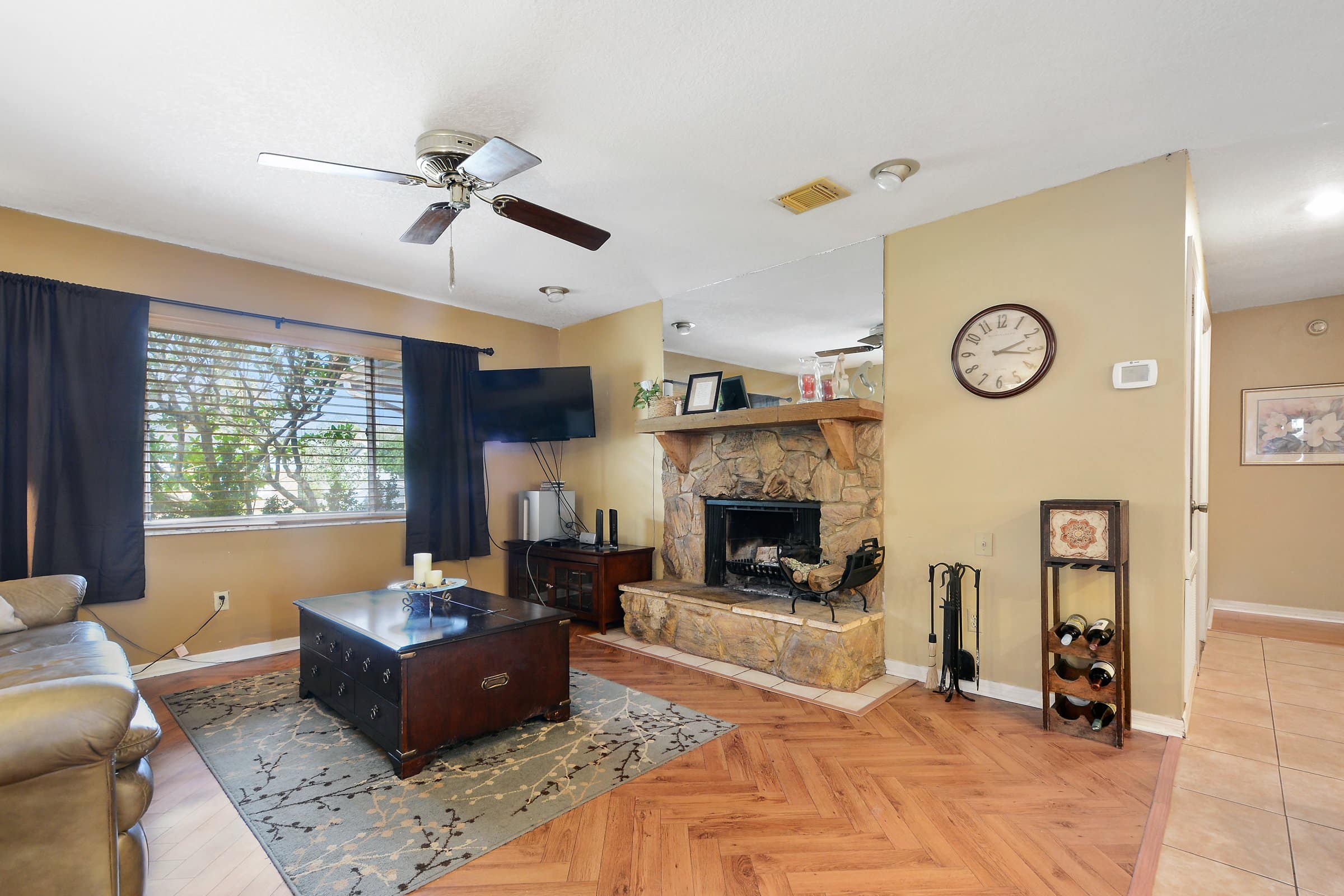 Across from the living areas, the kitchen and family room combination creates a functional and inviting hub of the home. The kitchen includes a convenient island with a breakfast bar, generous countertop space, solid wood cabinetry, and stainless steel appliances. Furthermore, the layout allows for easy interaction while cooking or entertaining. Down the hallway, you’ll find three comfortable secondary bedrooms along with a second bathroom, providing privacy and flexibility for family members or guests.